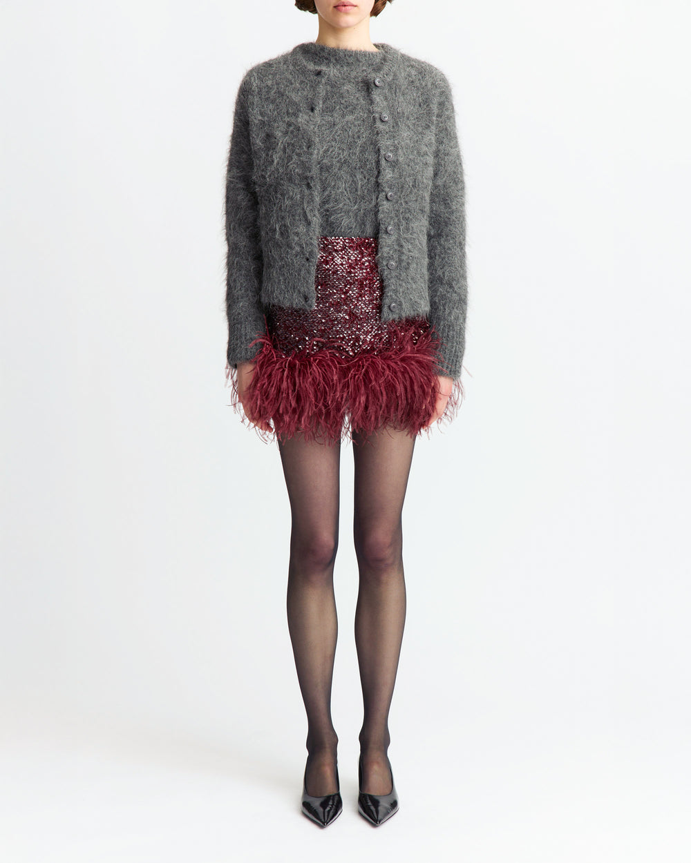 Eldi Jumper is a delicate knit in soft lilac mohair, detailed with matte spiky sequins hand-applied in a precise zigzag pattern across the front and sleeves. Each sequin is placed individually, highlighting the meticulous craftsmanship behind the textured surface. A sculptural knit defined by technical detail and expert construction.