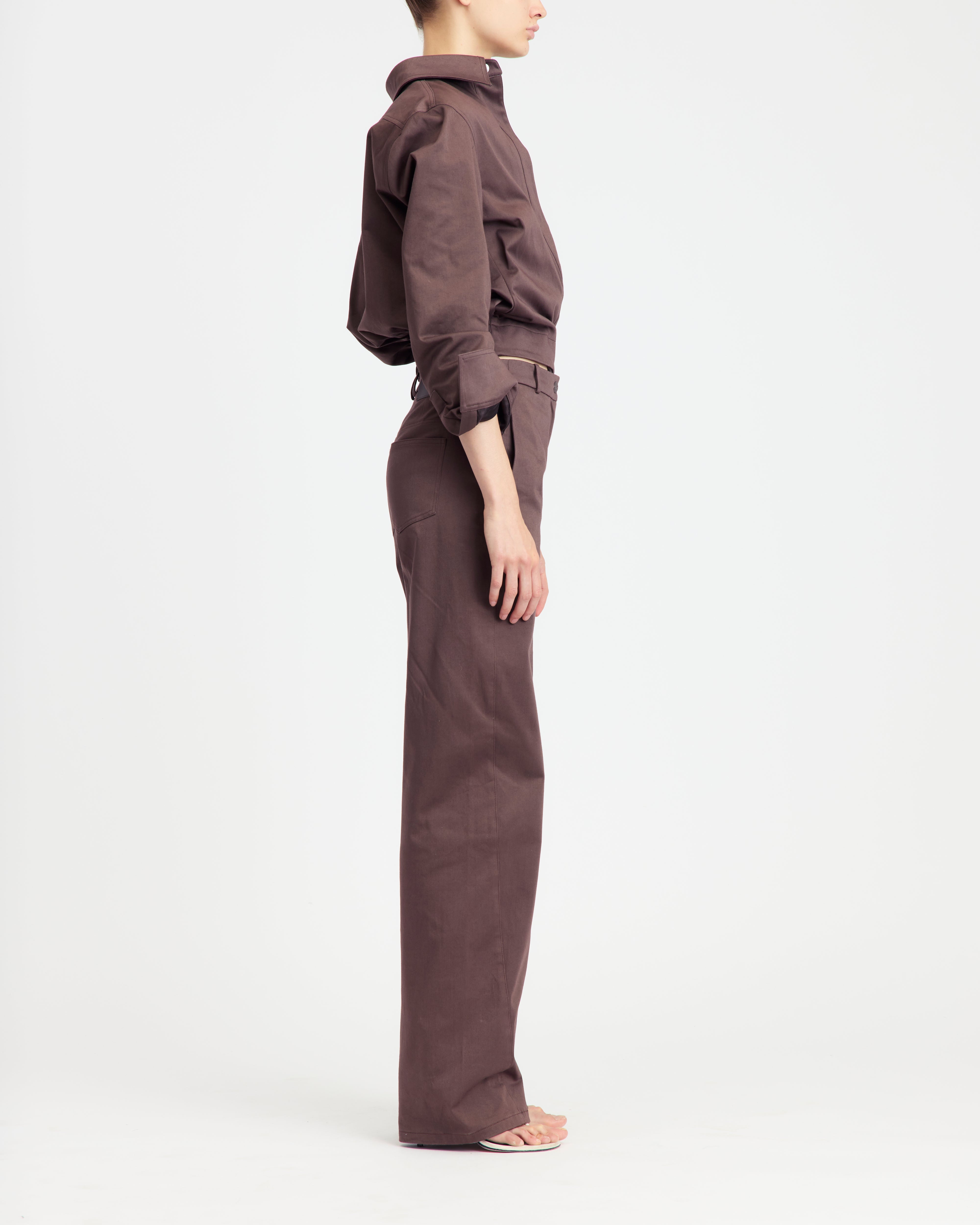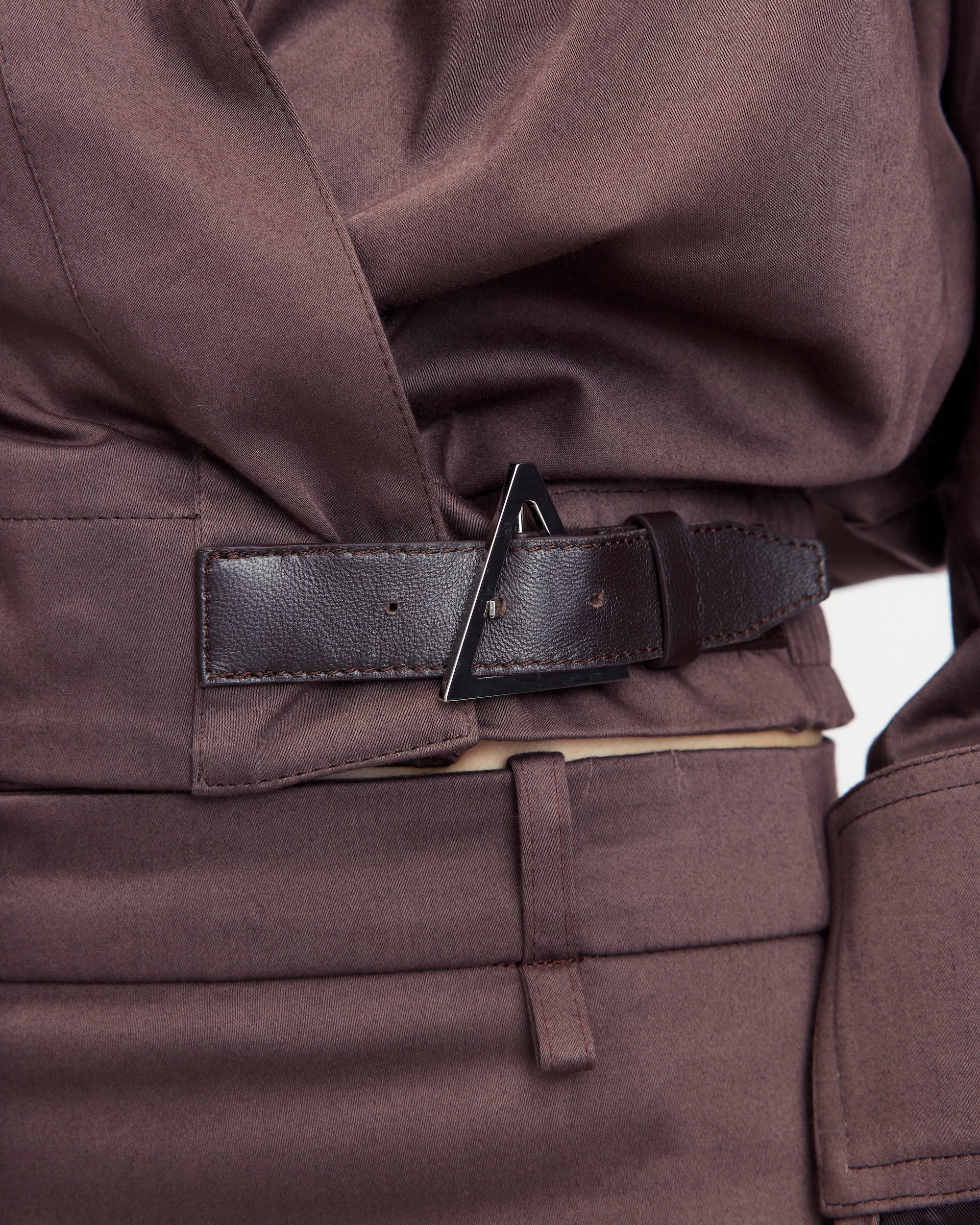The Jolie jacket is made from soft chocolate-coloured cotton sateen in a cropped silhouette, cinched at the waist with an elasticated back panel and a contrast dark chocolate leather buckle at the front. It features a plunging neckline that can be buttoned up, a pointed collar, and ruched sleeves for structured volume.