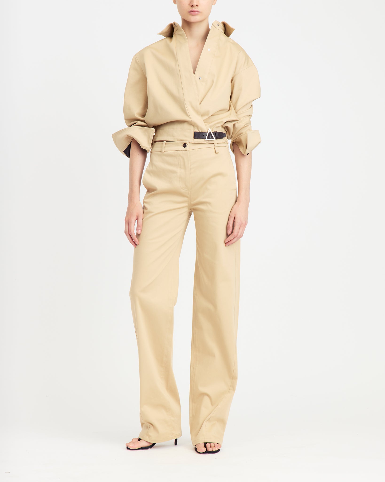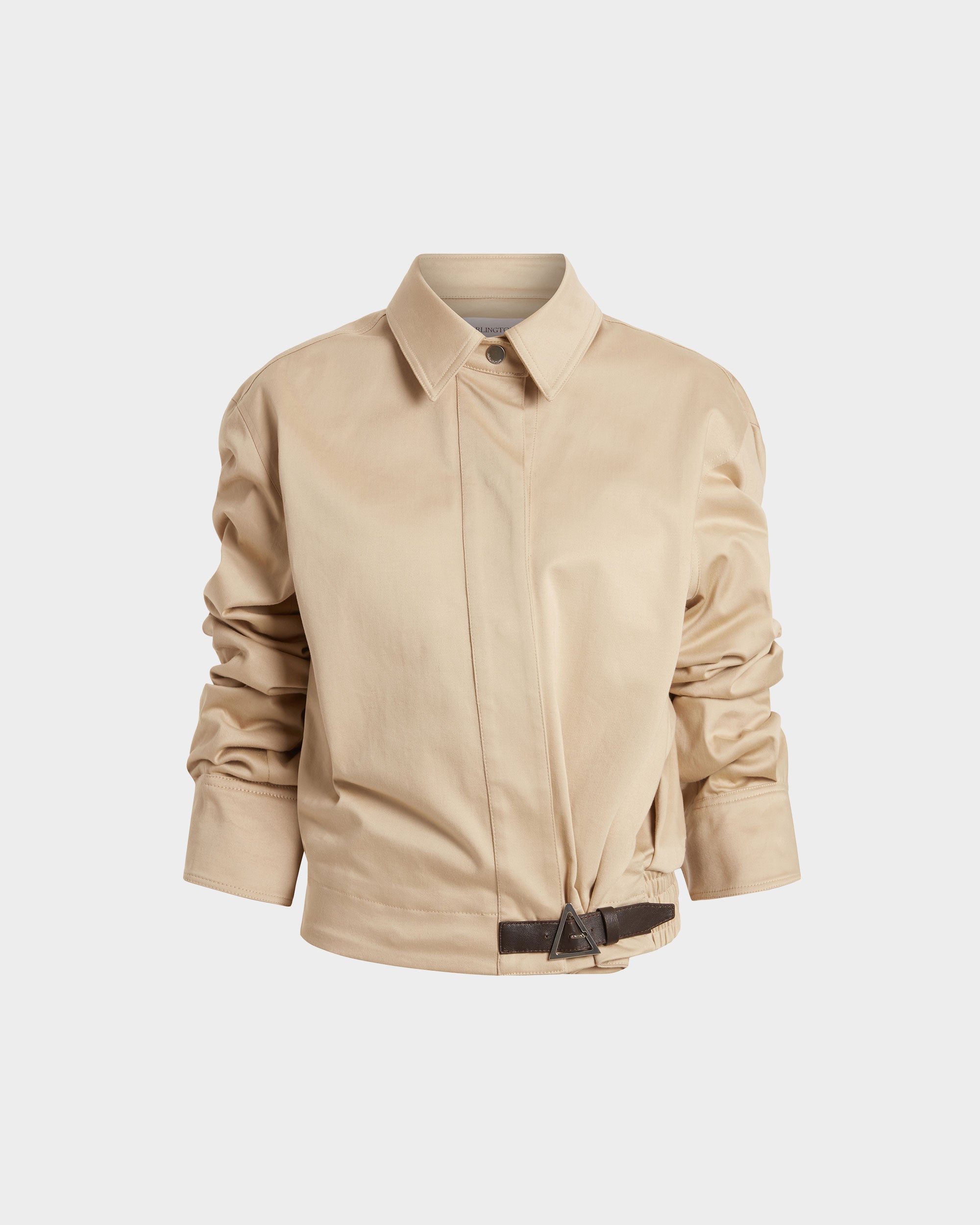 The Jolie jacket is made from soft sand-coloured cotton sateen in a cropped silhouette, cinched at the waist with an elasticated back panel and a contrast dark chocolate leather buckle at the front. It features a plunging neckline that can be buttoned up, a pointed collar, and ruched sleeves for structured volume.