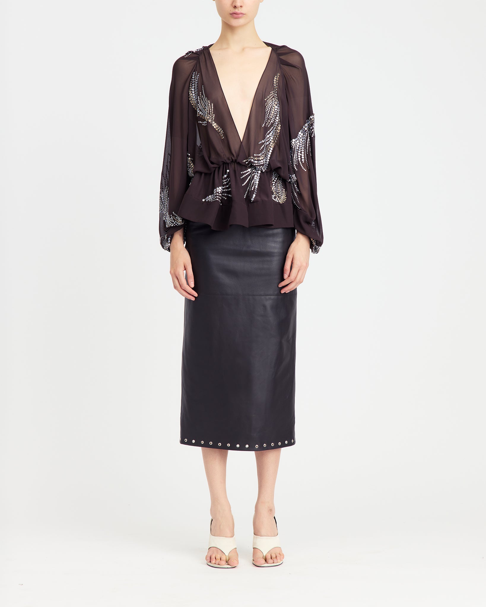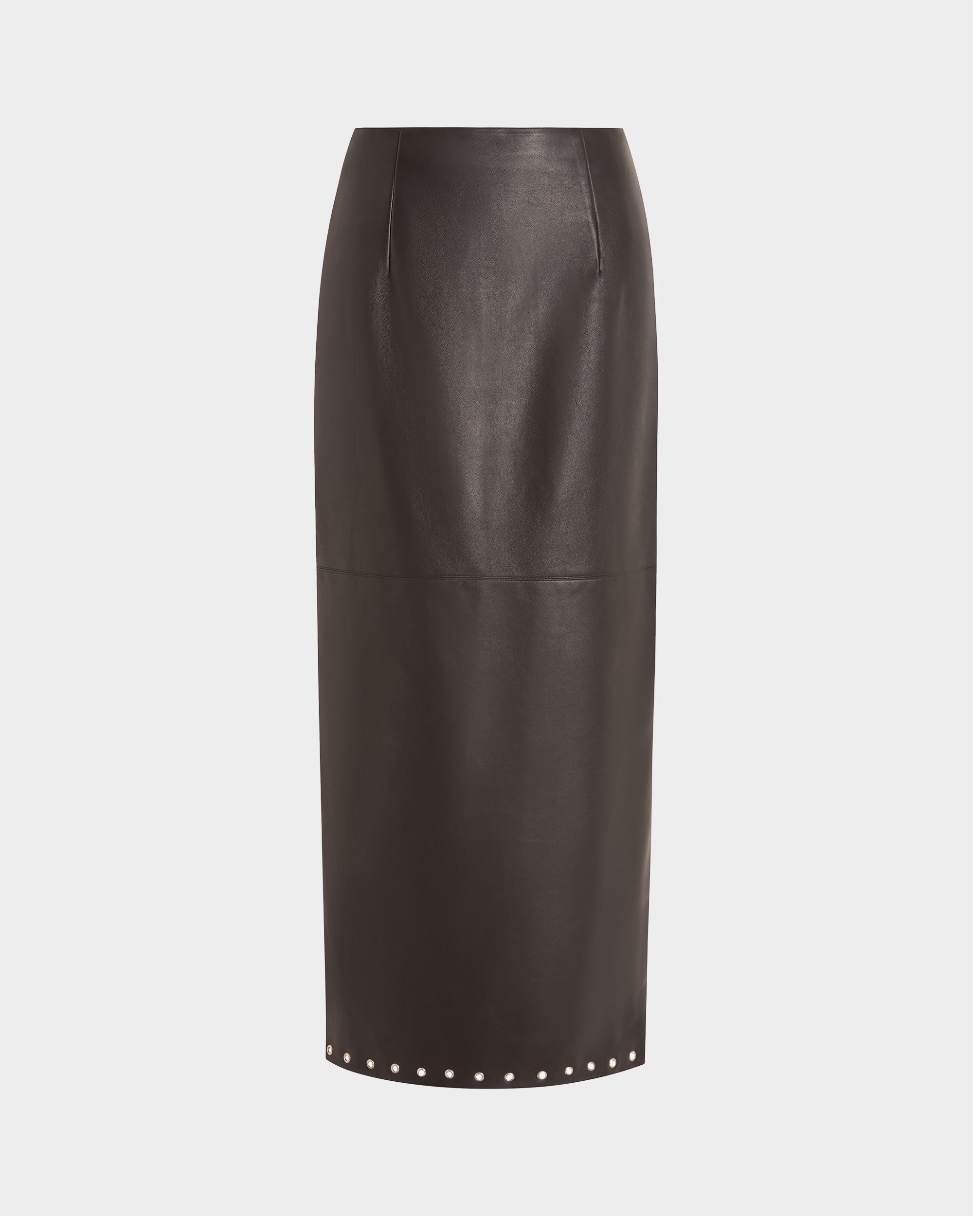The Lola skirt is cut from supple dark chocolate leather in a high-waisted column silhouette that falls below the knees. The hem and back slit are finished with metal eyelet trim, with branded metal-tipped cord laces threaded through the slit for a subtle detailed finish.