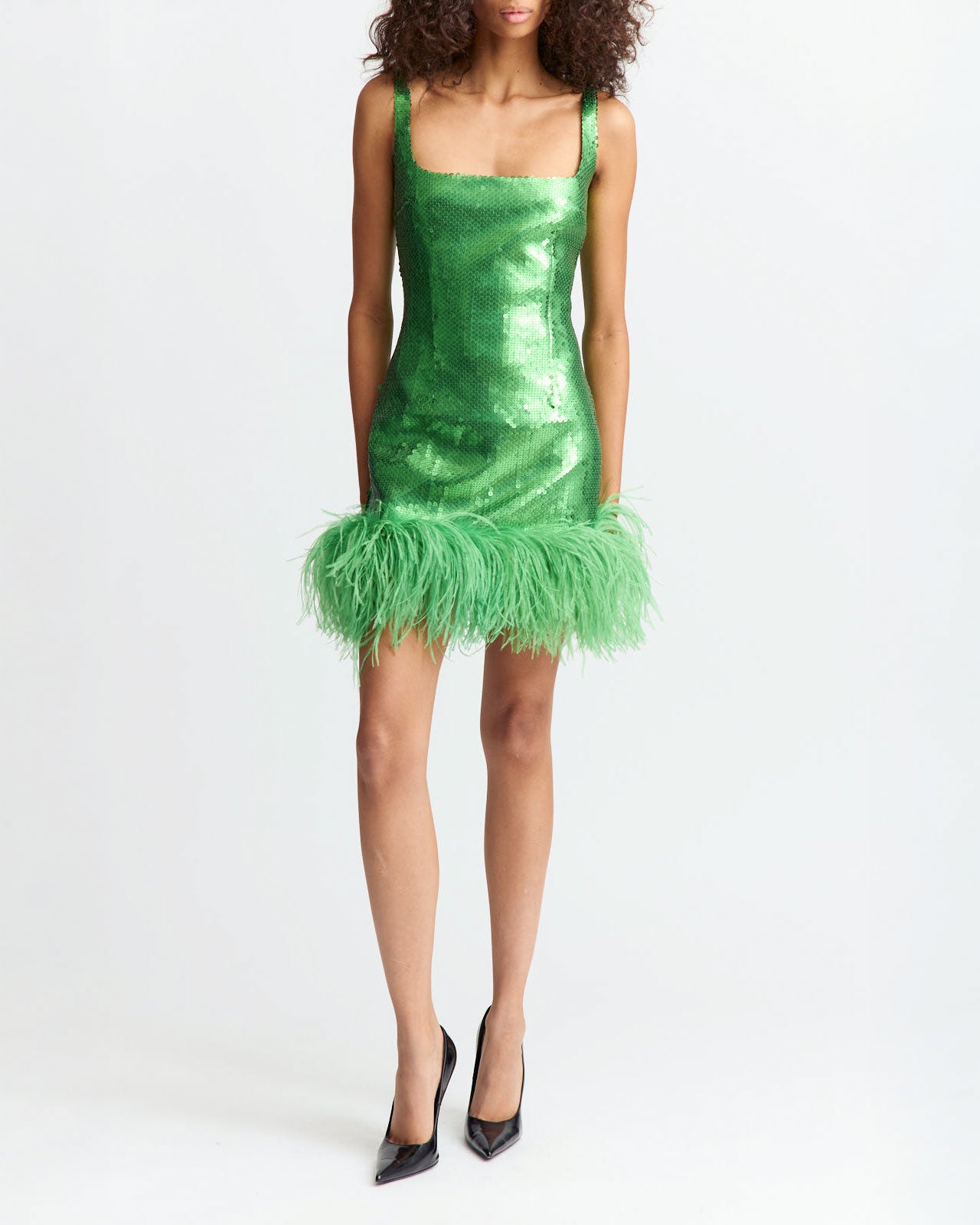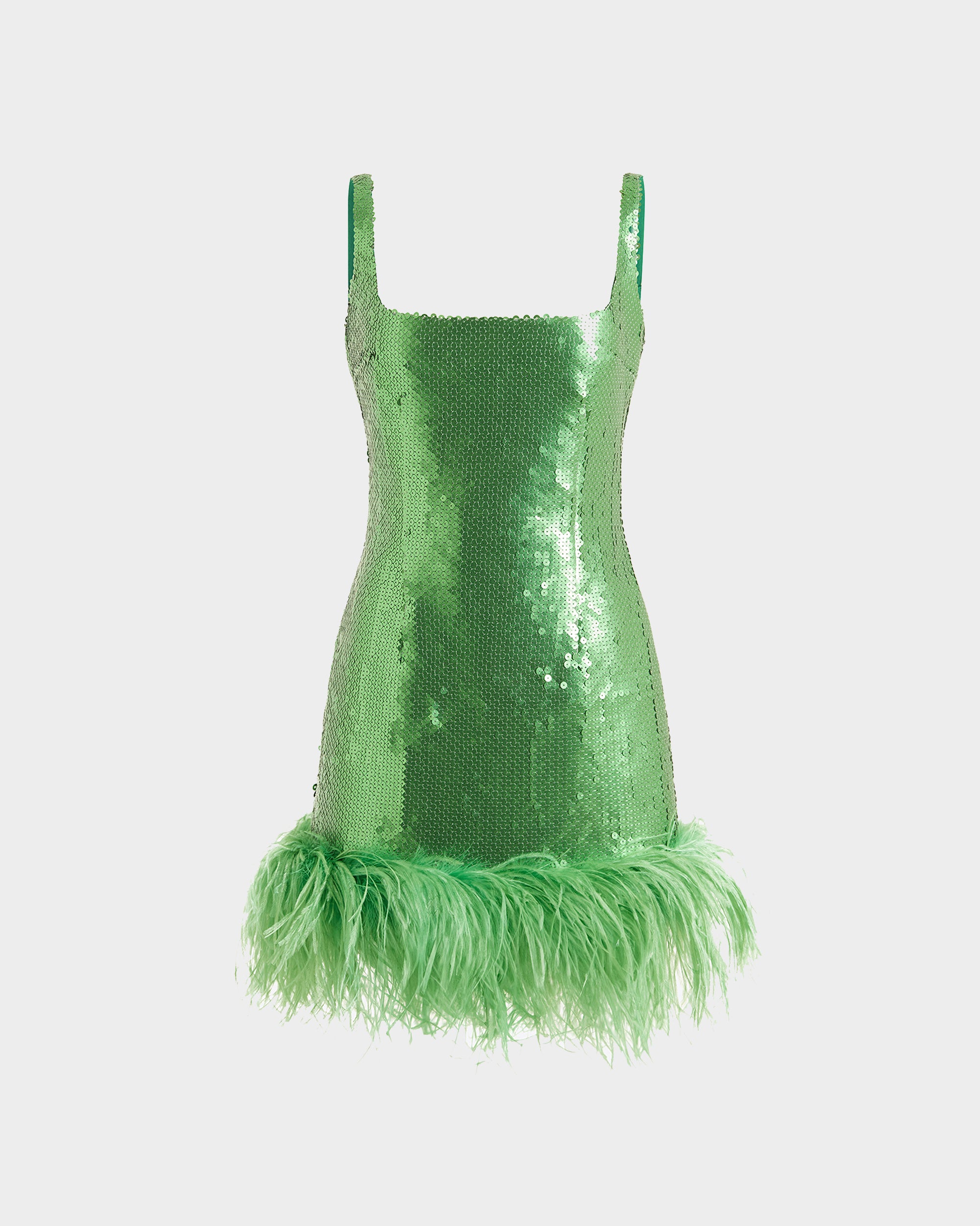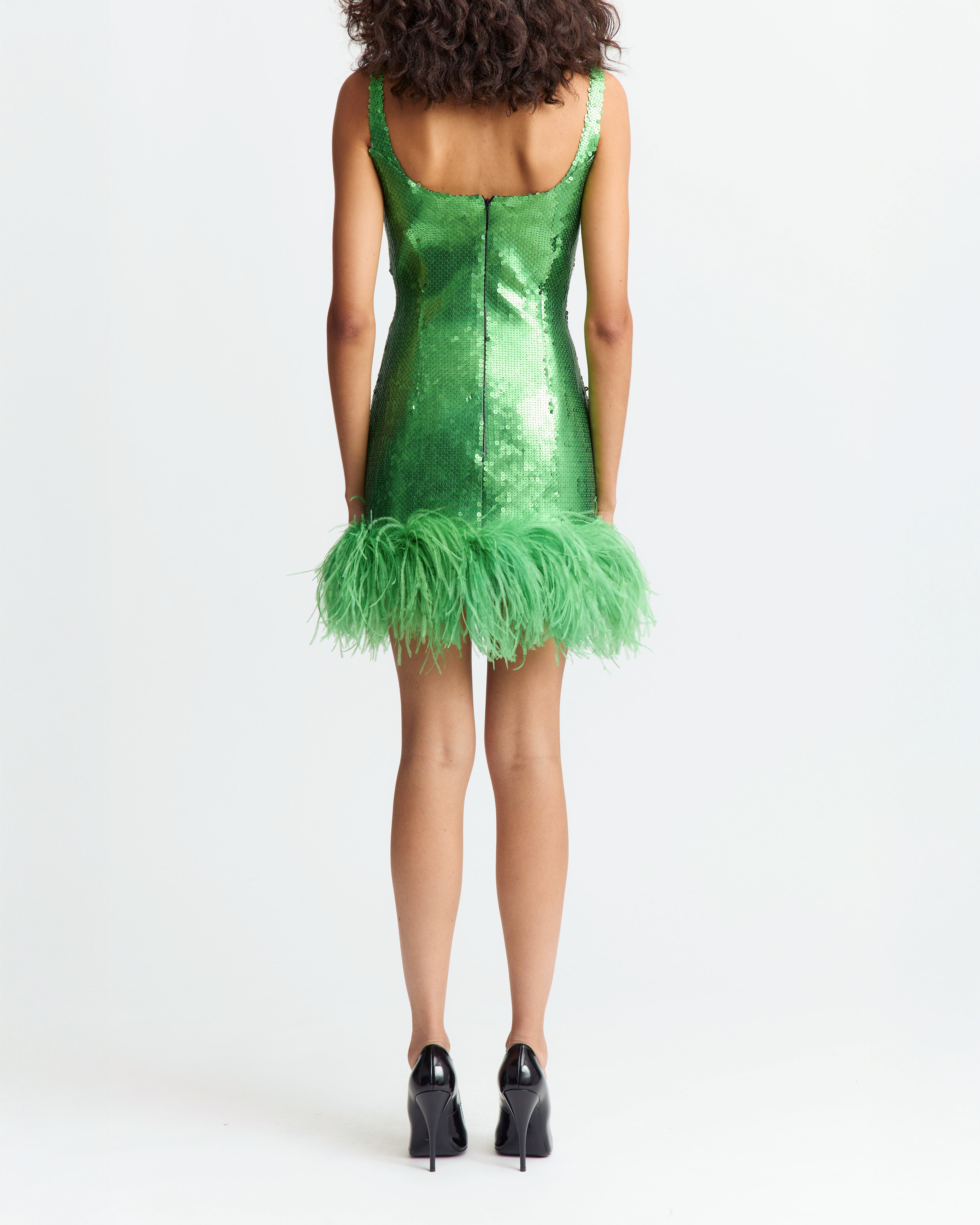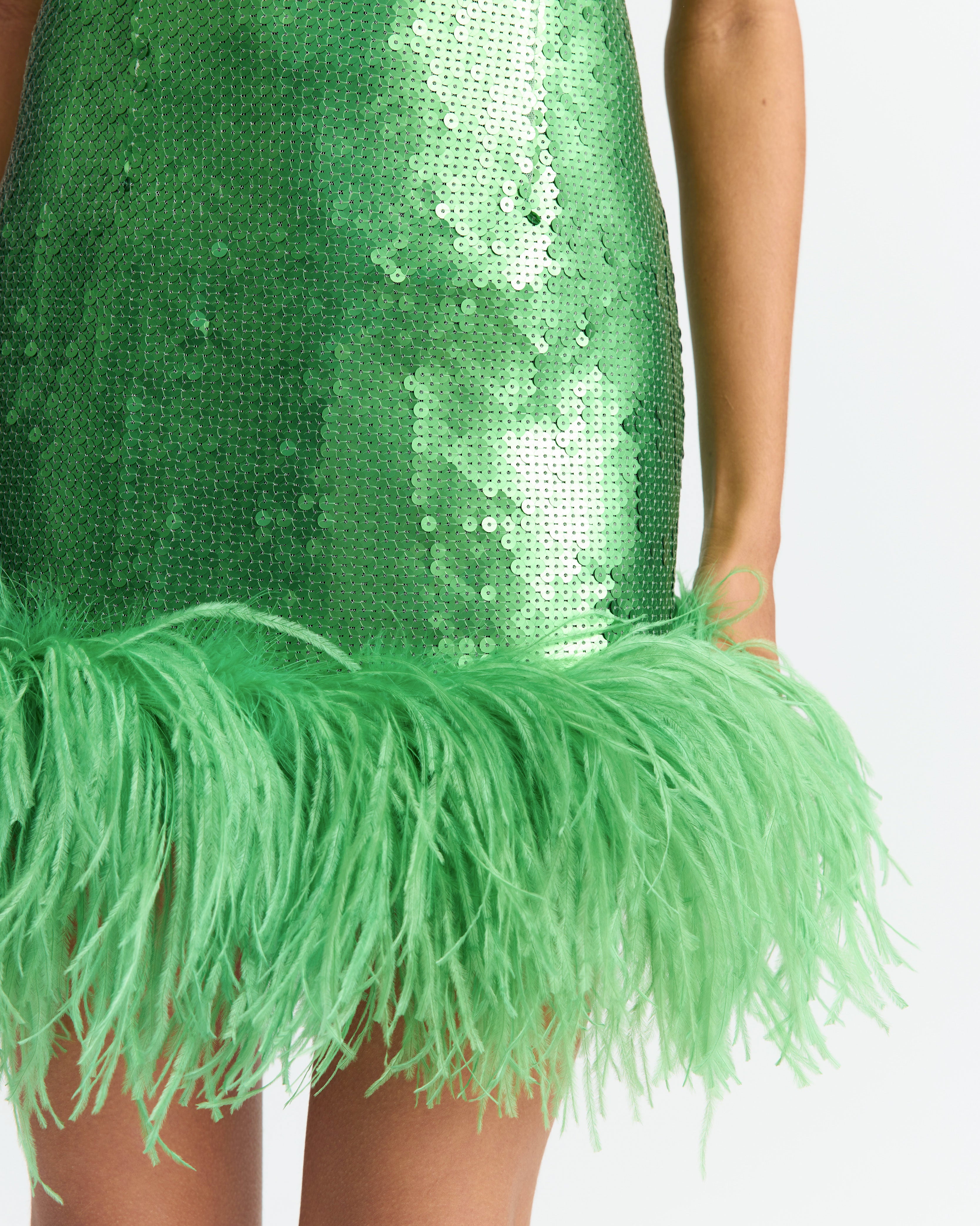 The Sior Mini Dress in matte flat sequins features our signature square neckline, balancing minimalist silhouette with subtle shimmer, while a richly feathered hem brings soft, textural contrast.