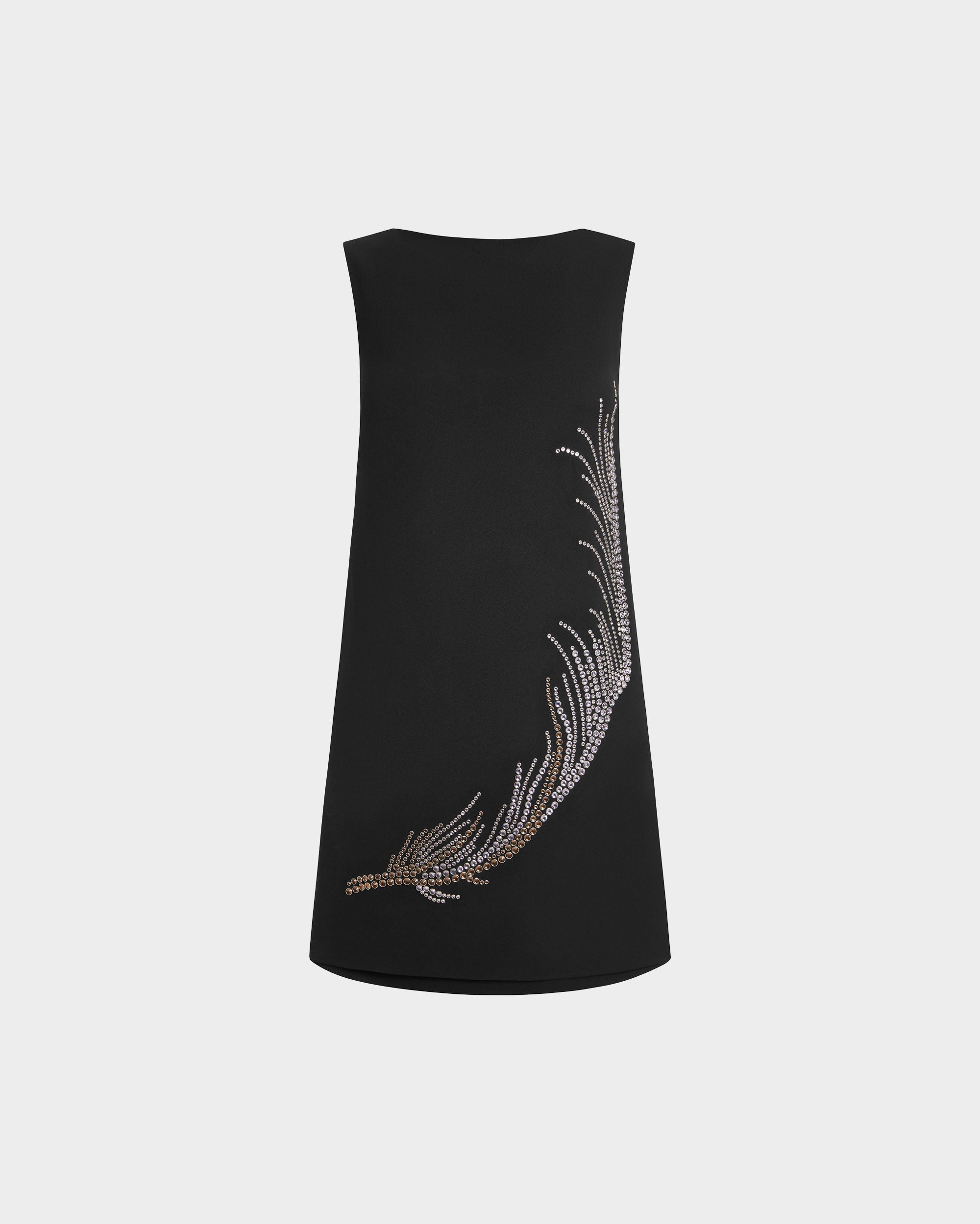 The Ayre dress is cut from deep black crepe in a sleeveless mini shift silhouette with a boat neckline and an open back. A large-scale feather hot-fix crystal appliqué decorates the front, while the back straps are secured with branded metal-tipped laces. Concealed side pockets at the hips complete the design with a seamless finish.
