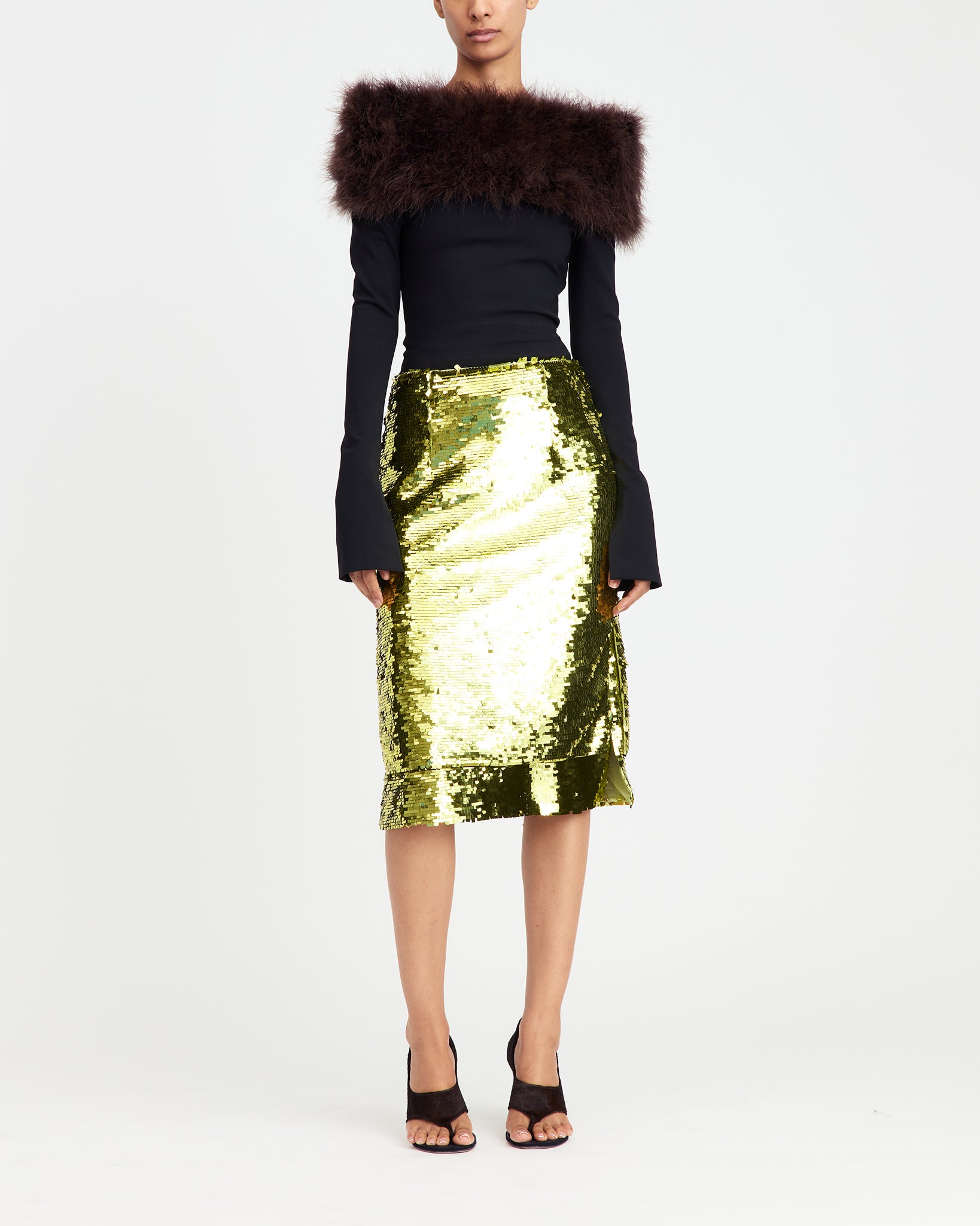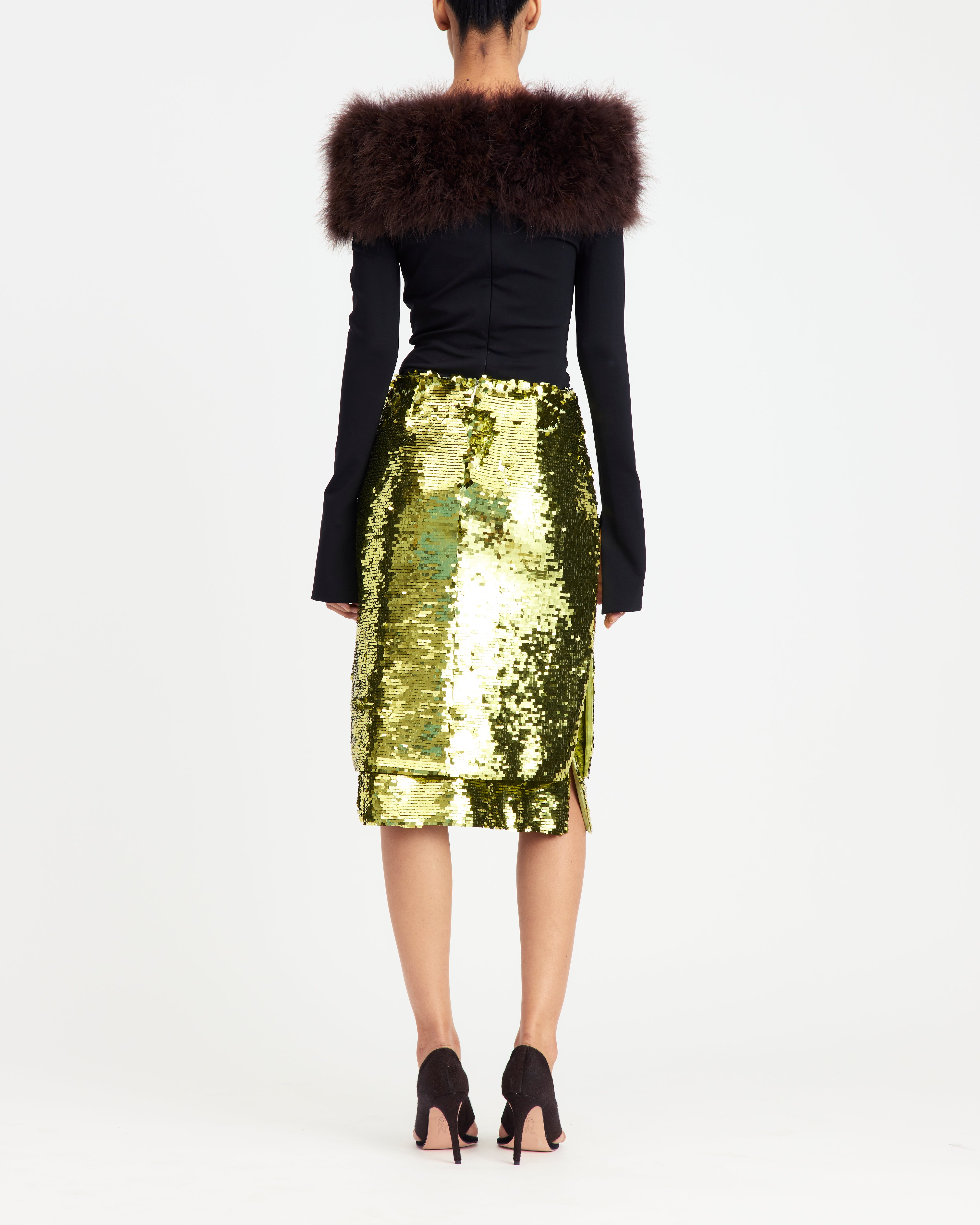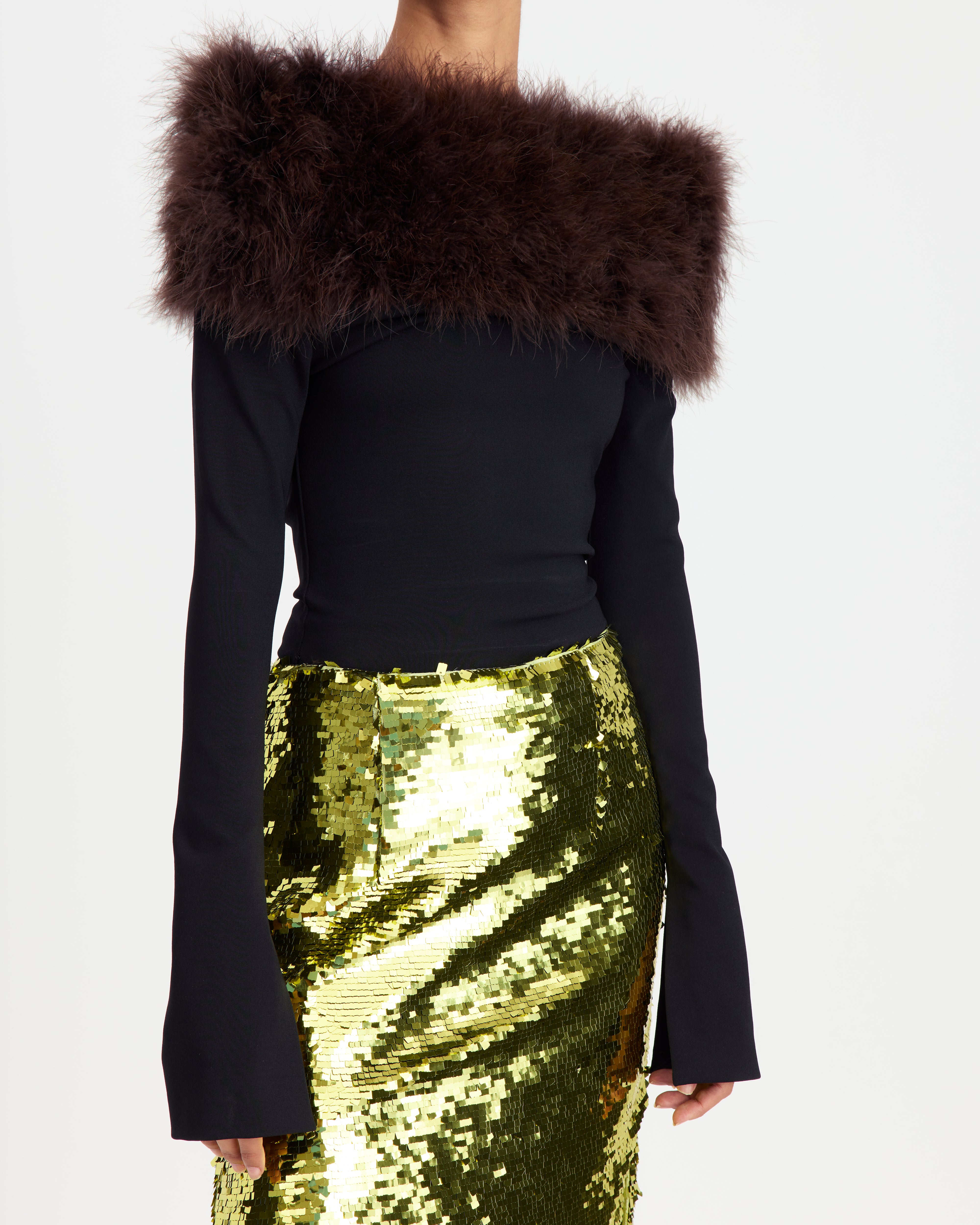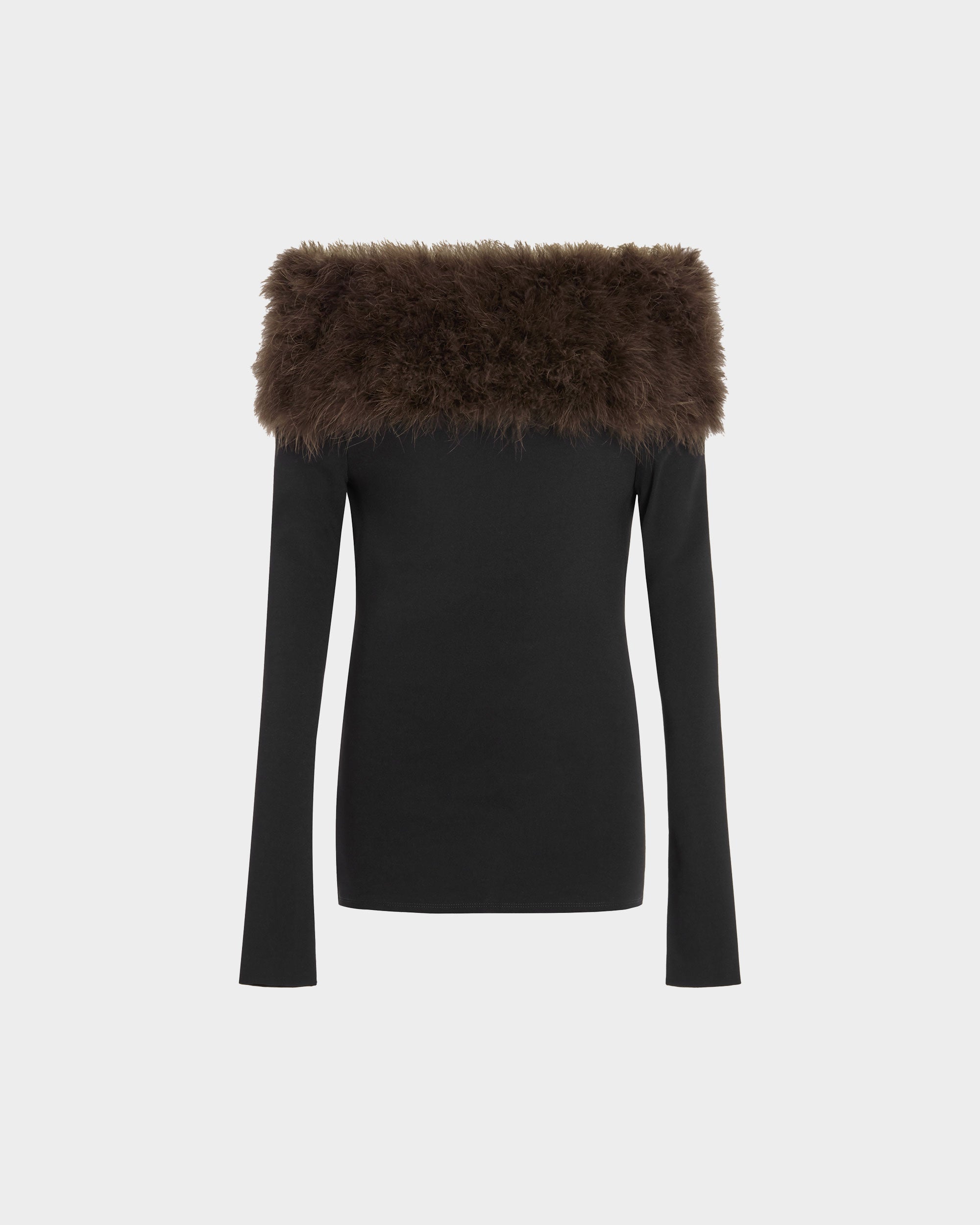 The Canter top is cut from black Punto Milano with a clean, sculpting finish, fitted throughout in a sleek, slimline silhouette. It features a fitted bodice and long sleeves with subtle cuff slits. The off-shoulder neckline is framed by a wide panel of dark chocolate marabou feathers, introducing soft texture to the structured form.