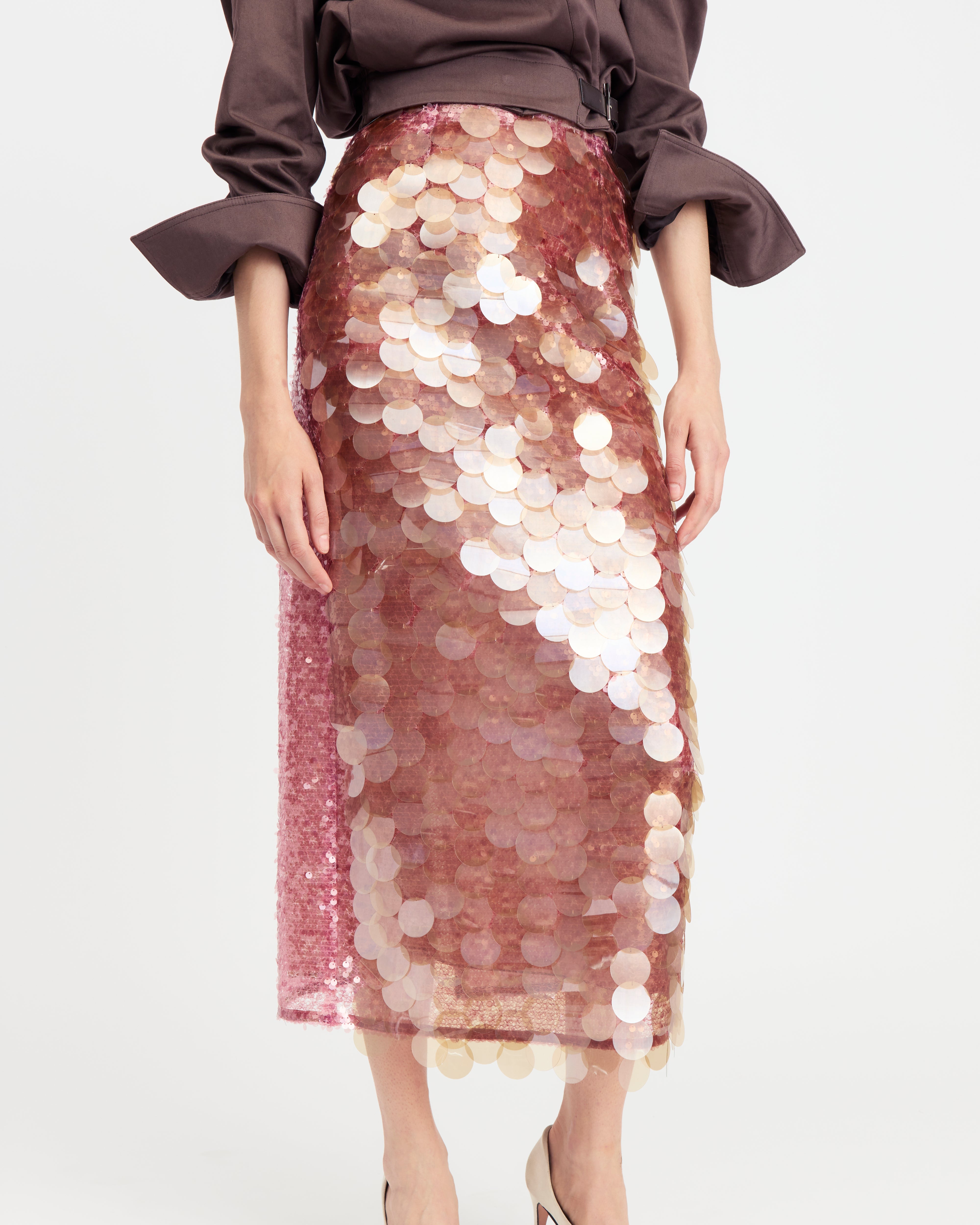 The Dia skirt is cut from a rose pink sequin base, layered with hand-embroidered large nude paillette sequins. Each panel is individually hand-cut, creating a meticulously layered effect and ensuring that every piece is unique. The high-waisted column silhouette falls below the knees, combining precise construction with the tactile richness of the sequins.
