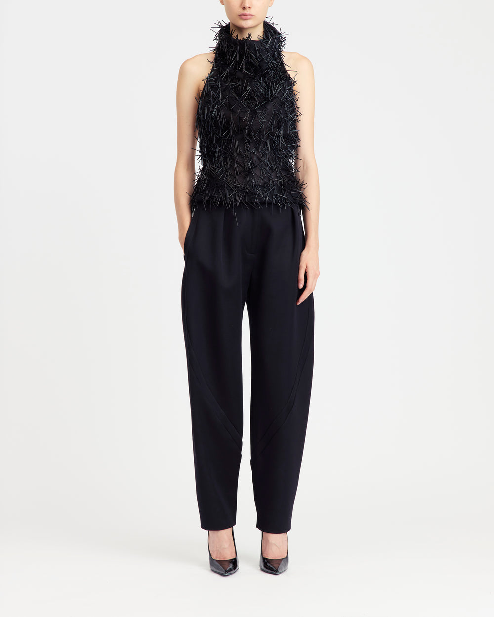Dioni Gown is a halter-neck design fully embellished with three-dimensional spiky sequins, creating a dense, sculptural surface. Backless and fitted through the bodice, it falls into a double-layered skirt with a contrasting white underlayer visible at the hem. Expertly crafted in the 16Arlington London atelier.
