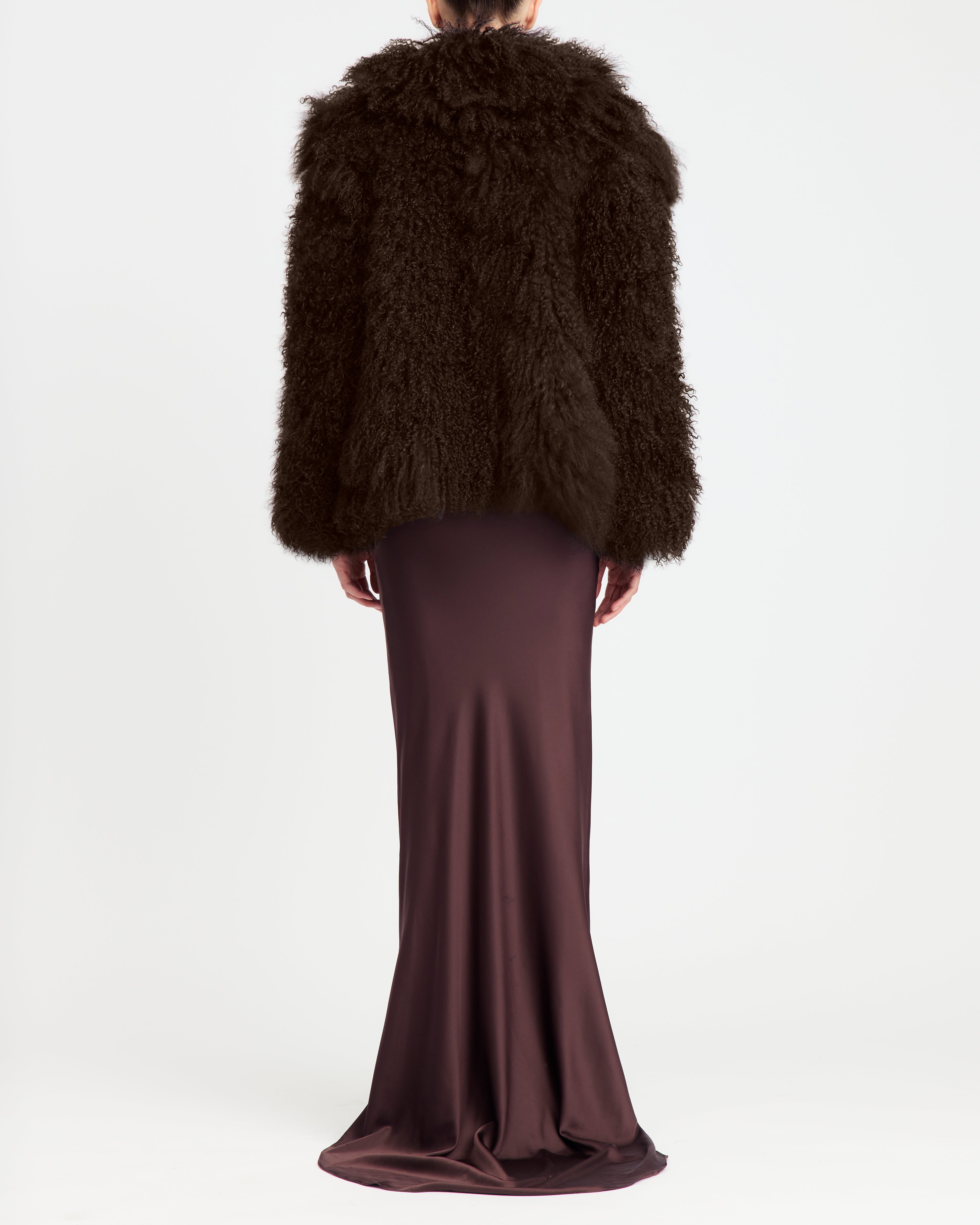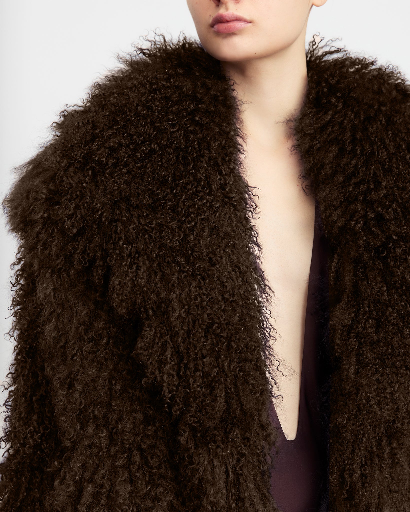 The Maryam jacket is cut from dark chocolate Mongolian shearling in a slightly cropped silhouette that falls to the hips. It features long sleeves and an exaggerated collar, combining tactile richness with a subtly defined shape.