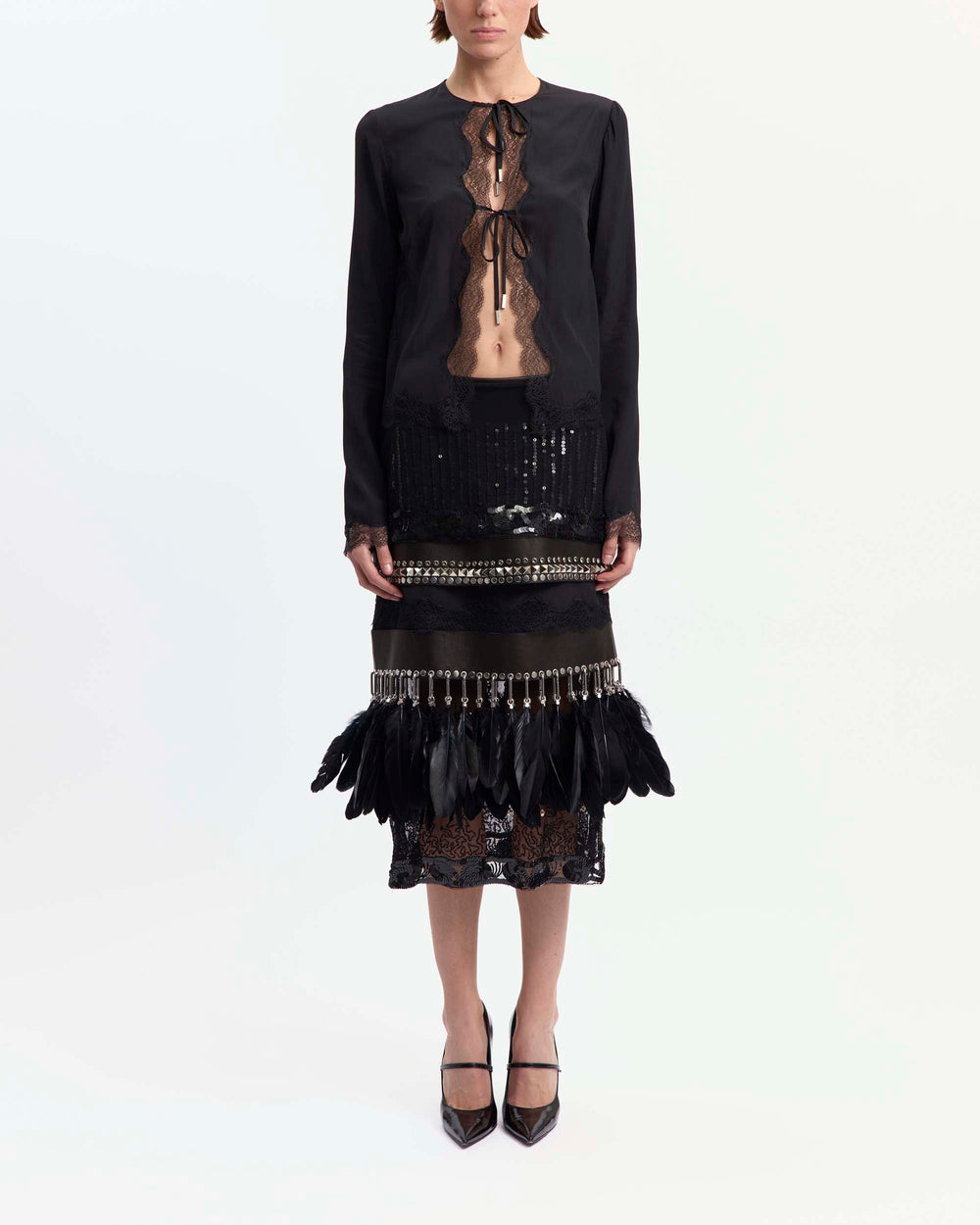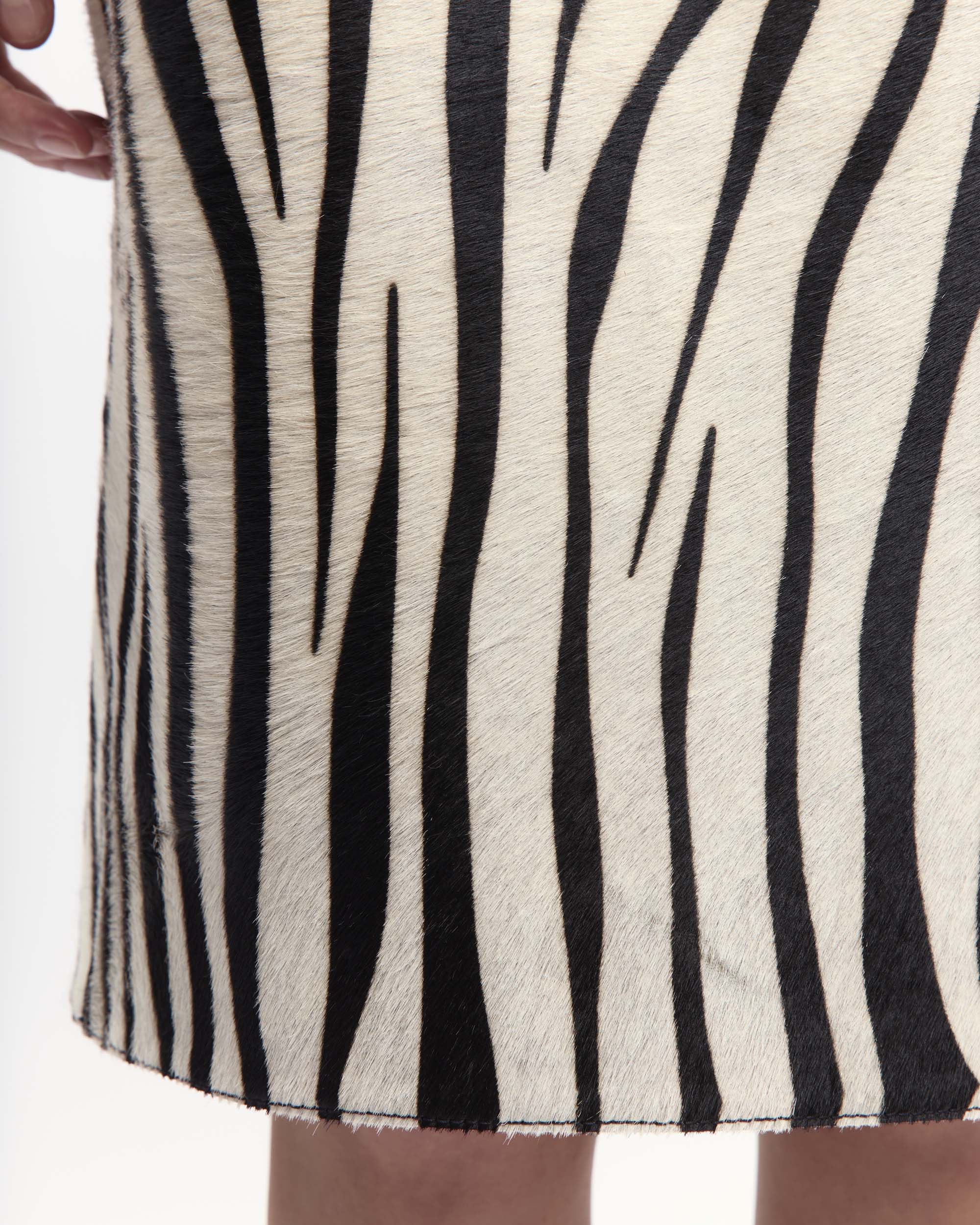 The Delta skirt in pony hair leather is a high-waisted pencil silhouette that falls below the knees, with a zebra-print pattern adding unexpected dimension and vibrant playfulness to the textural surface. A subtle back split allows for softer movement.
