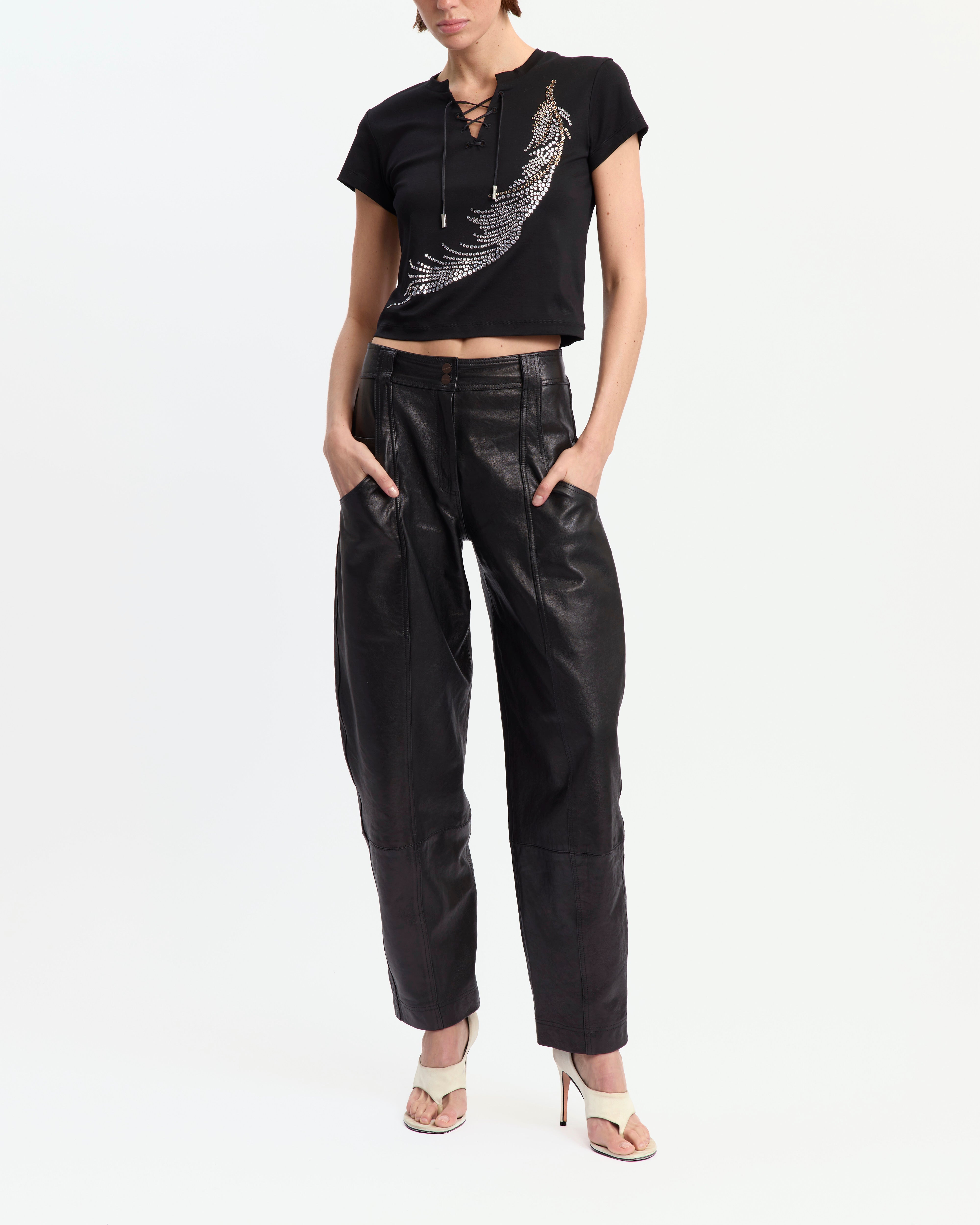 The Serin T-shirt is cut from black cotton in a cropped, shrunken silhouette with cap sleeves. A cut-out at the round neckline is laced with branded metal-tipped cord ties, while a large feather motif crystal hot-fix appliqué decorates the front, anchoring the design with a striking, embellished centrepiece. This style is exclusively available on 16arlington.co.uk.