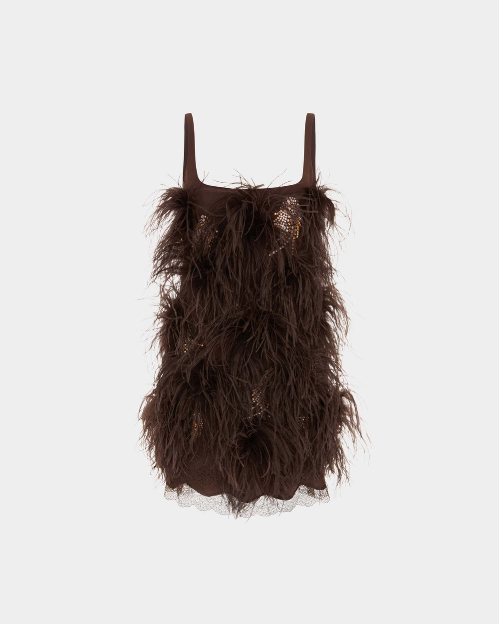 The Ade dress is made from structured yet soft crepe, with a fitted bodice featuring a cross-strap halter neckline and low-cut back. From the waist, a narrow A-line skirt falls to a plush feather trim that flows softly with movement.