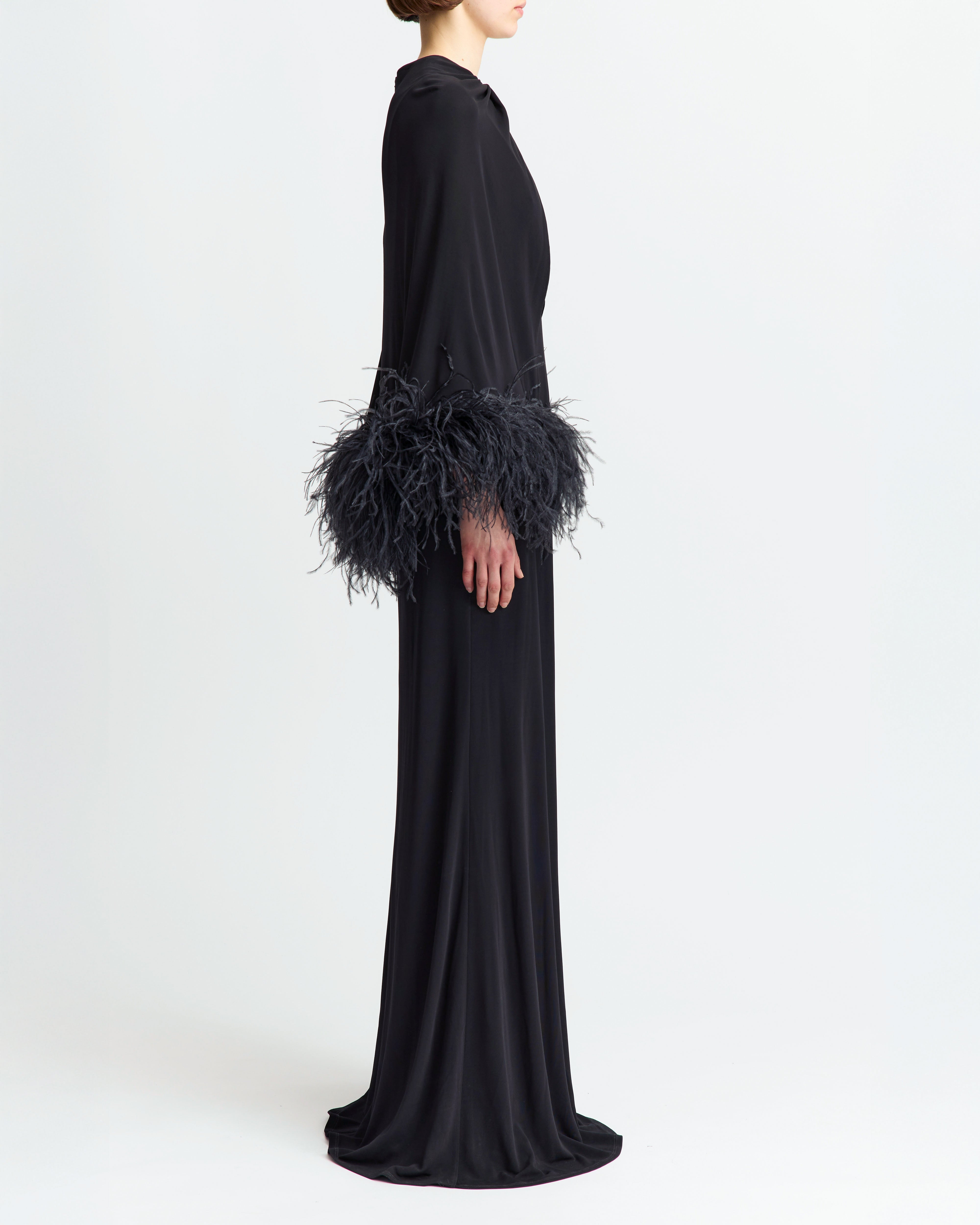 The Adelar Gown is a floor-length black design with feather-trimmed sleeves and a subtle cape construction. The cape can be styled forward to cover the arms or pushed back to let the feathers trail behind, creating a versatile, dynamic silhouette that combines movement with a refined column form.