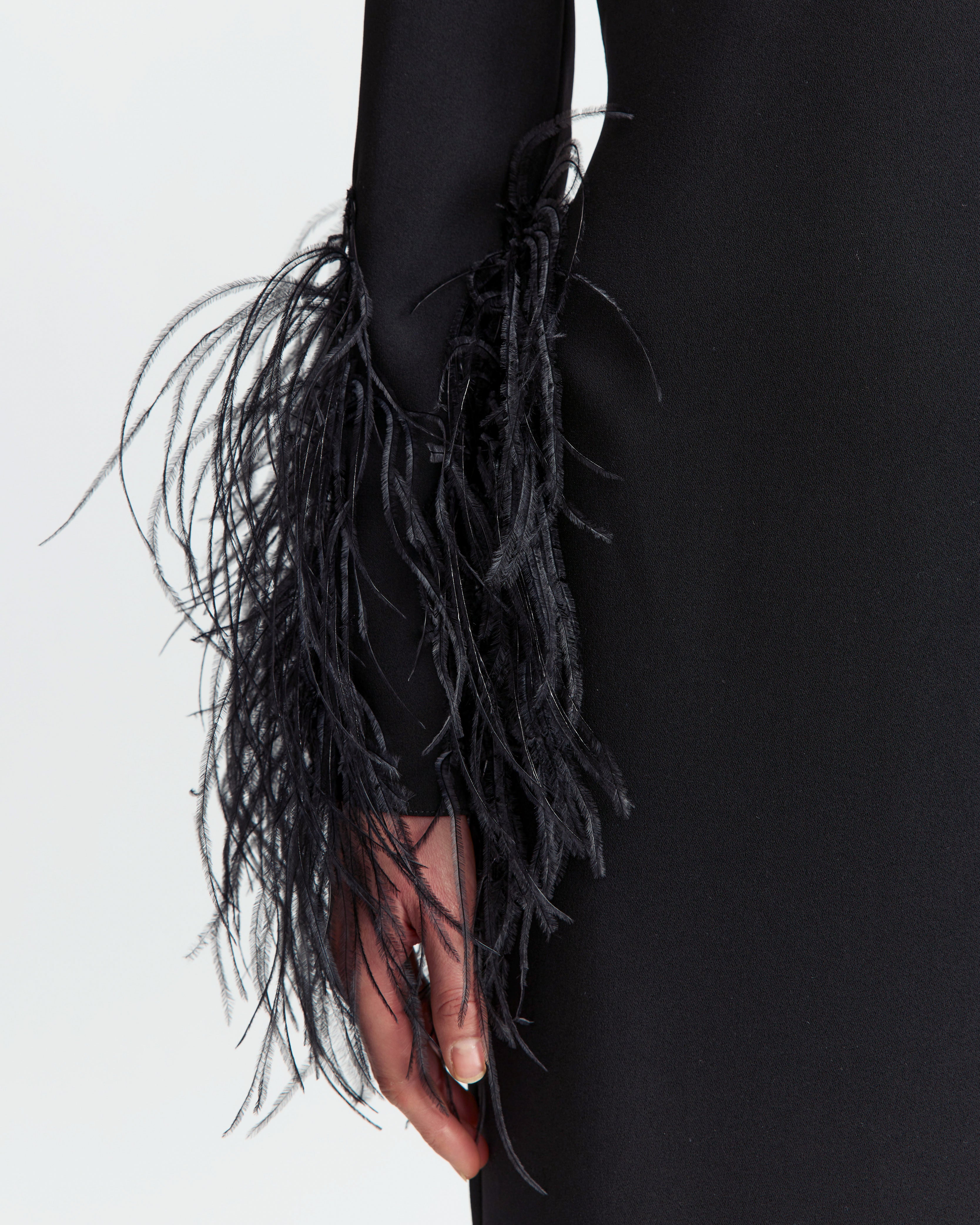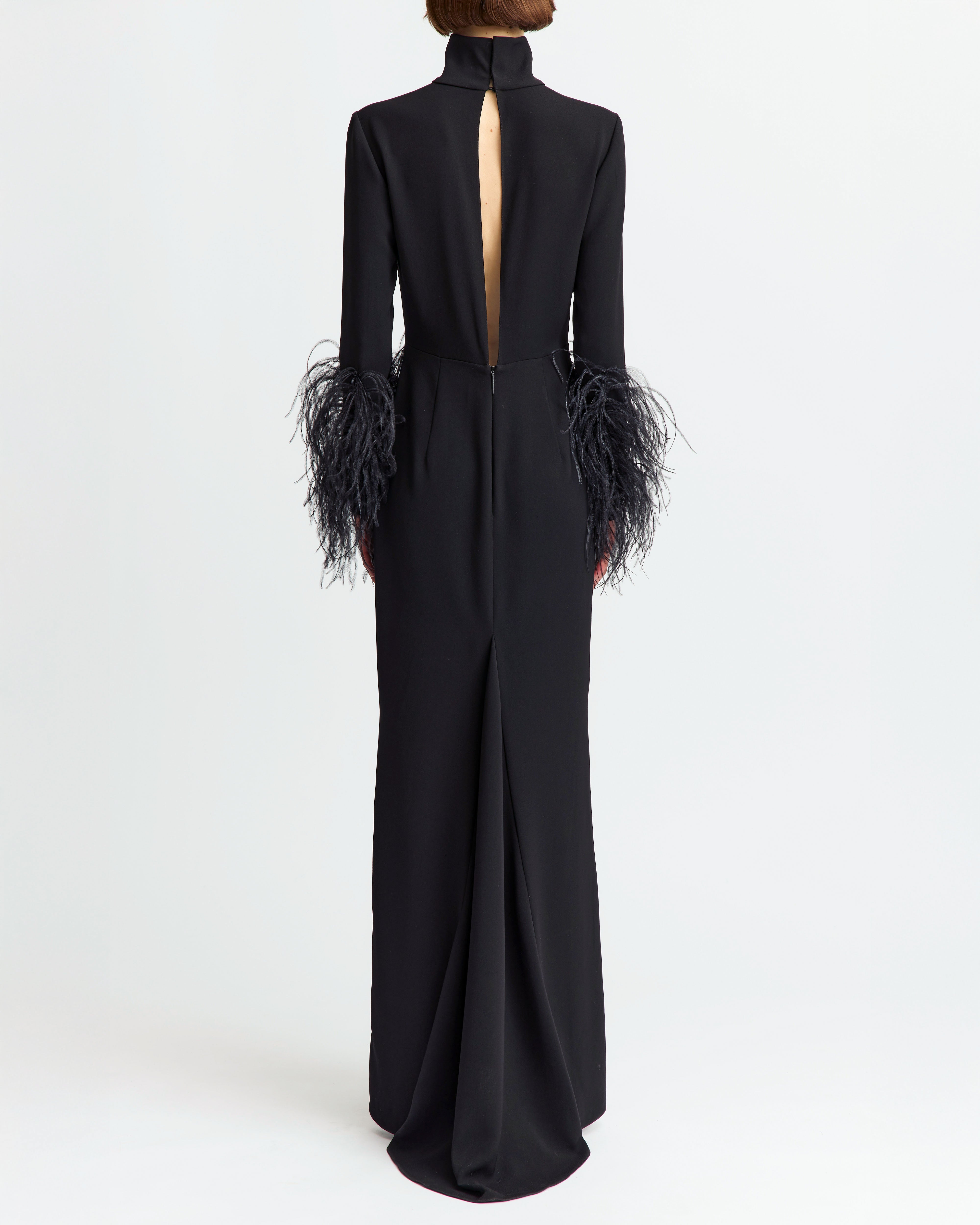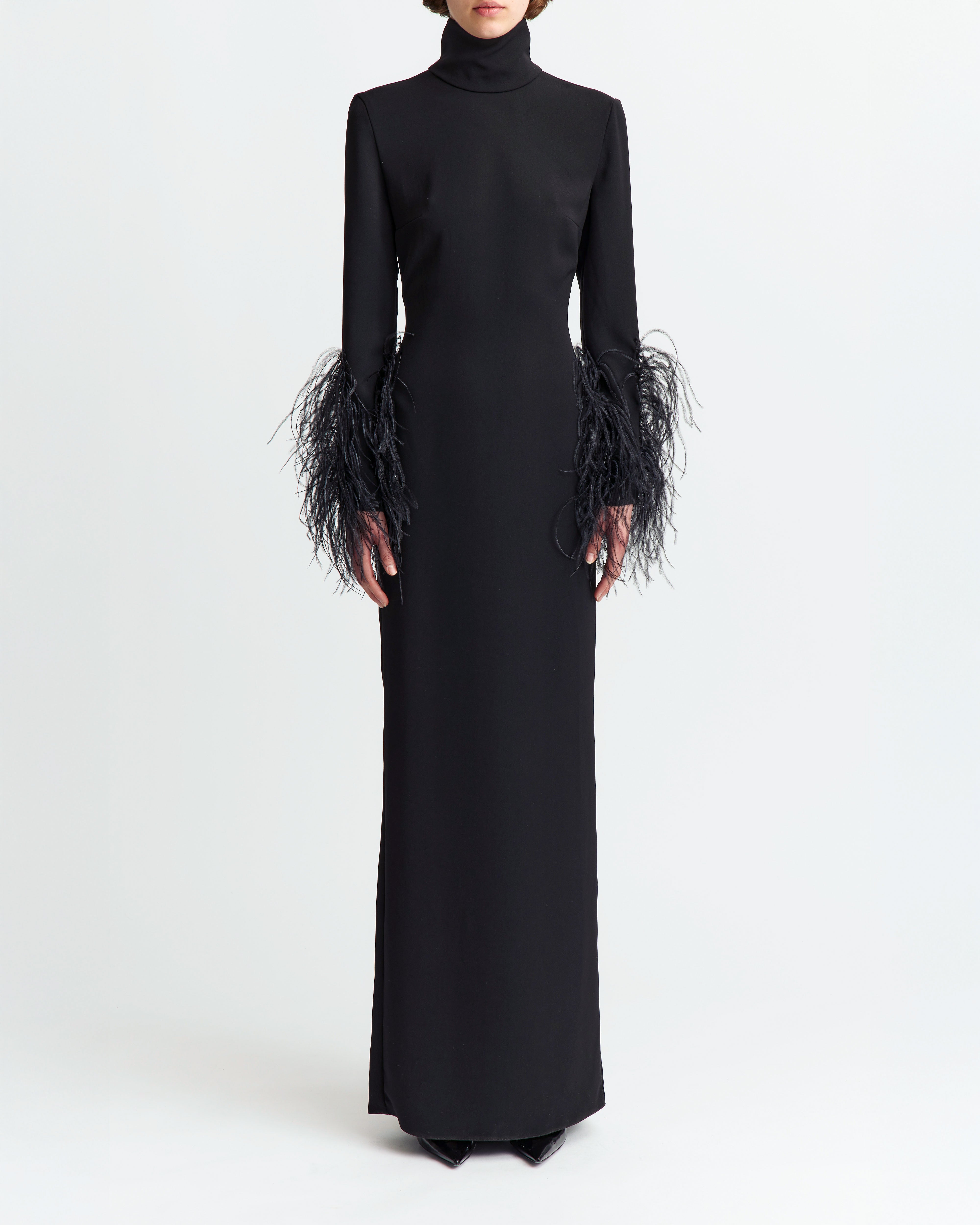 The Arios Gown in black is a floor-length design in a high-neck, long-sleeve silhouette, detailed with feather trims along the sleeves for texture and movement. The back features a narrow keyhole opening, and a slight train extends from the hem, creating a refined, elongated line.