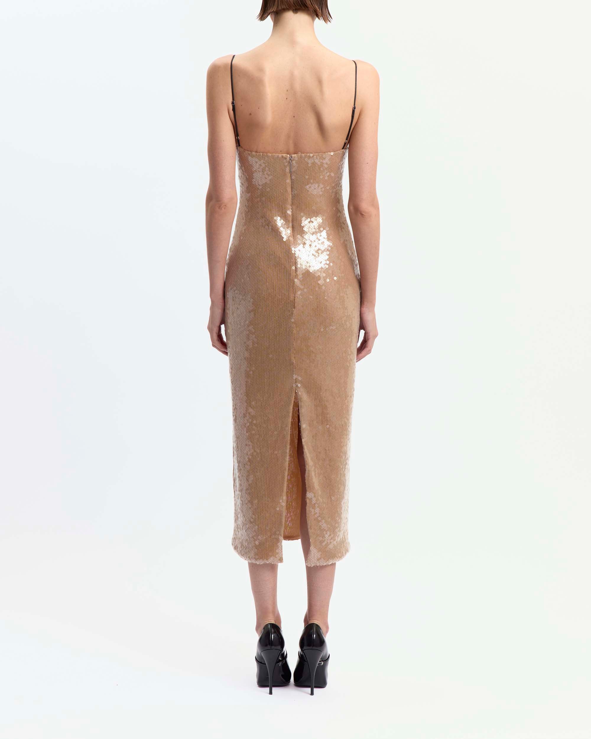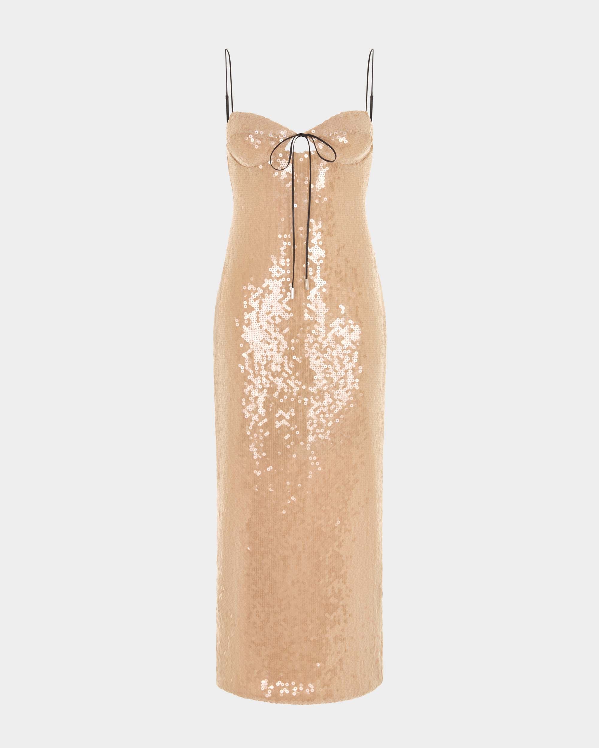 The Che dress is cut from champagne-coloured sequin fabric with a textural, three-dimensional surface. The vintage-inspired silhouette features tailored bust cups accentuated by tie details tipped with branded silver hardware, a low back, and a nineties-style straight skirt that ends just below the knee. Elevated by a back slit for dimension and movement, it fastens with a concealed zip for a clean silhouette.