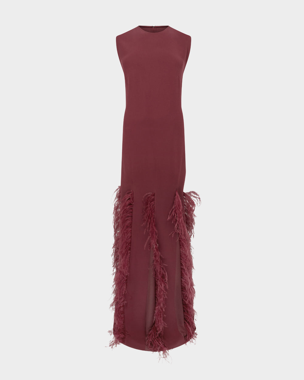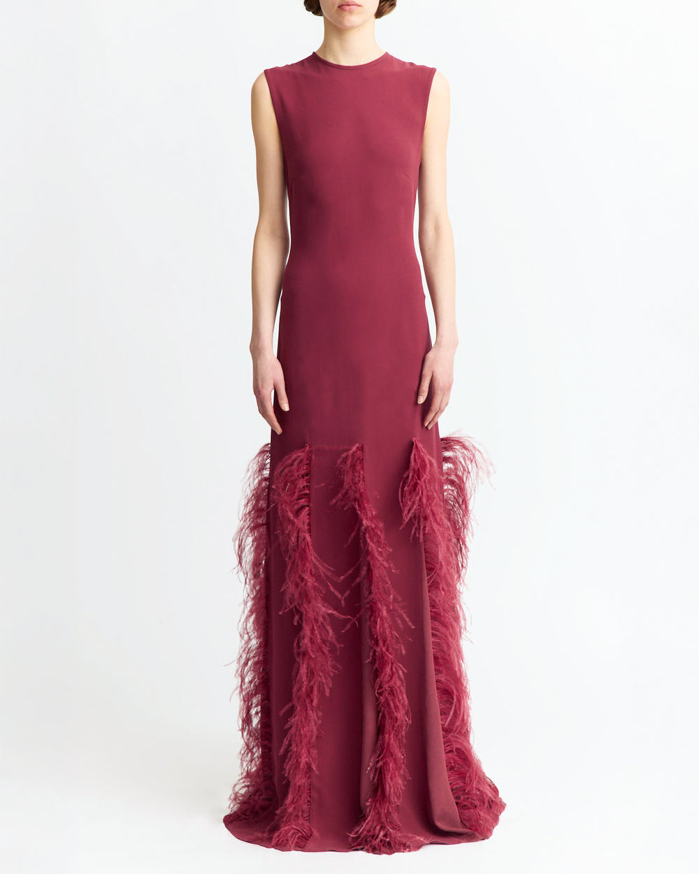 The Dona Gown is a fluid, floor length silhouette cut from smooth crepe, offering both structure and movement. It features short, cape like sleeves that fall softly over the shoulders and a tapered waist that defines the form.
