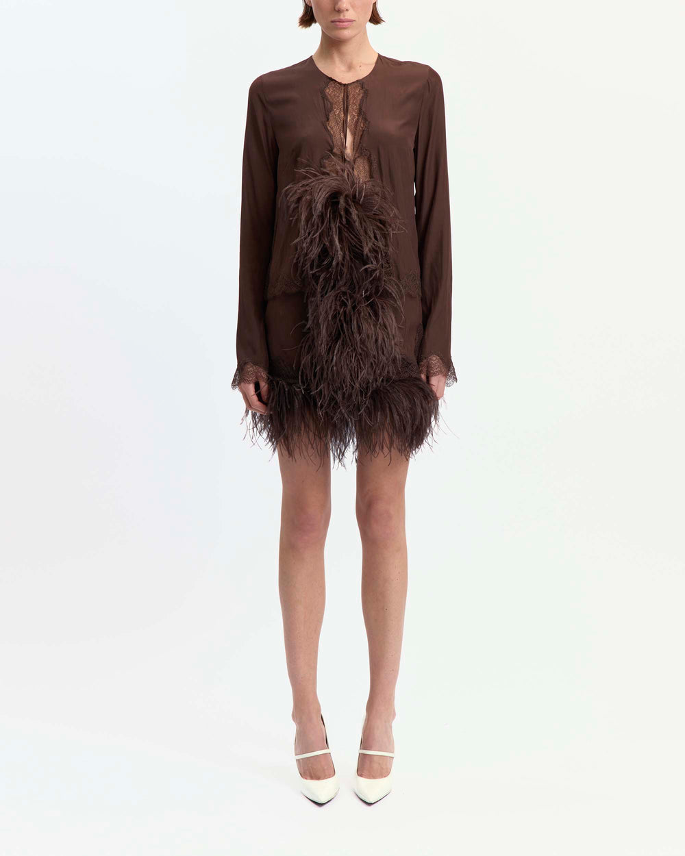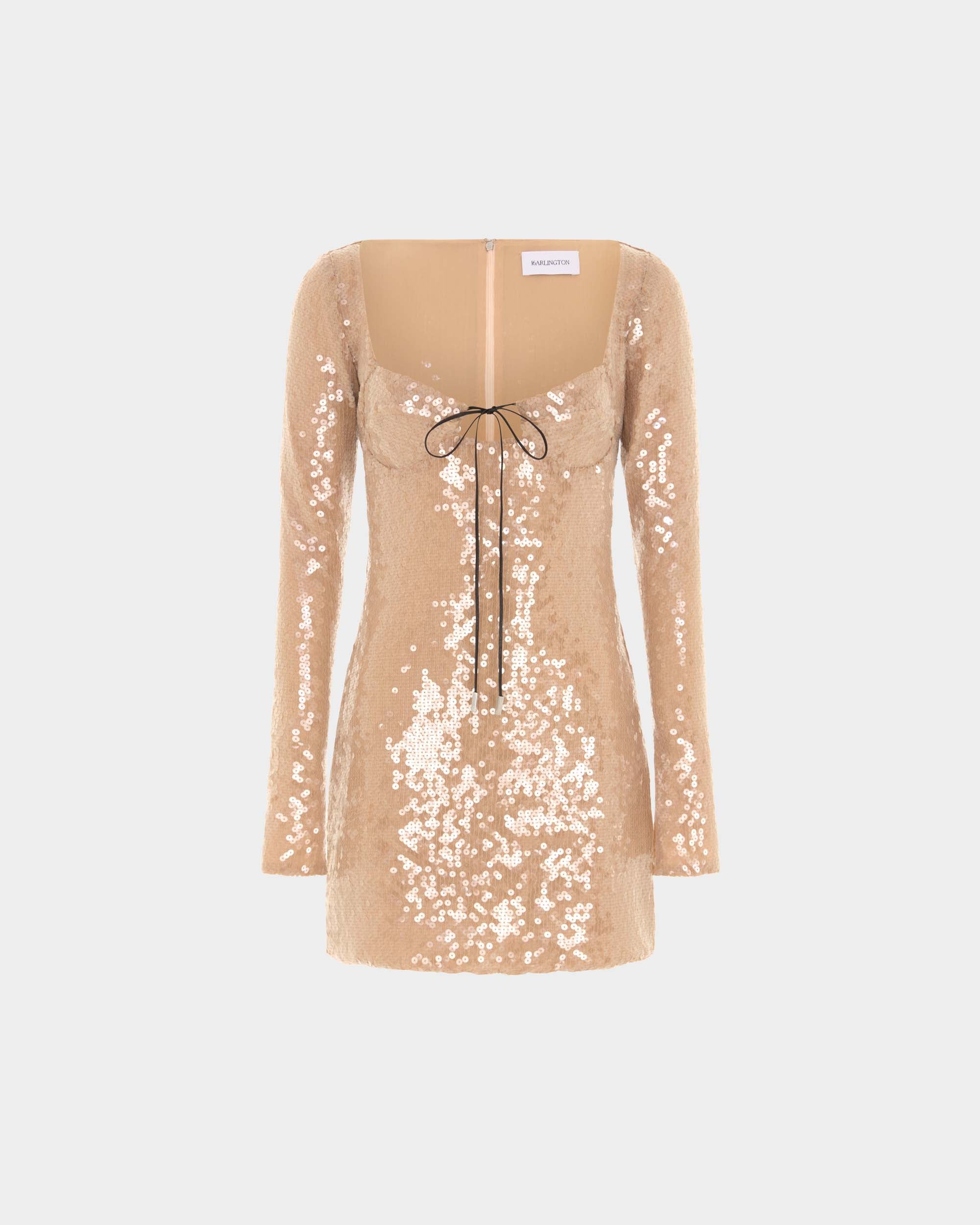 The Franca dress is cut from champagne-coloured sequin fabric with a textural, three-dimensional surface. The fitted bodice features branded metal tipped ties at the bust and ends in a mini length. The long sleeves widen into a slight flare at the wrist and feature a slit detail for a sleek silhouette.