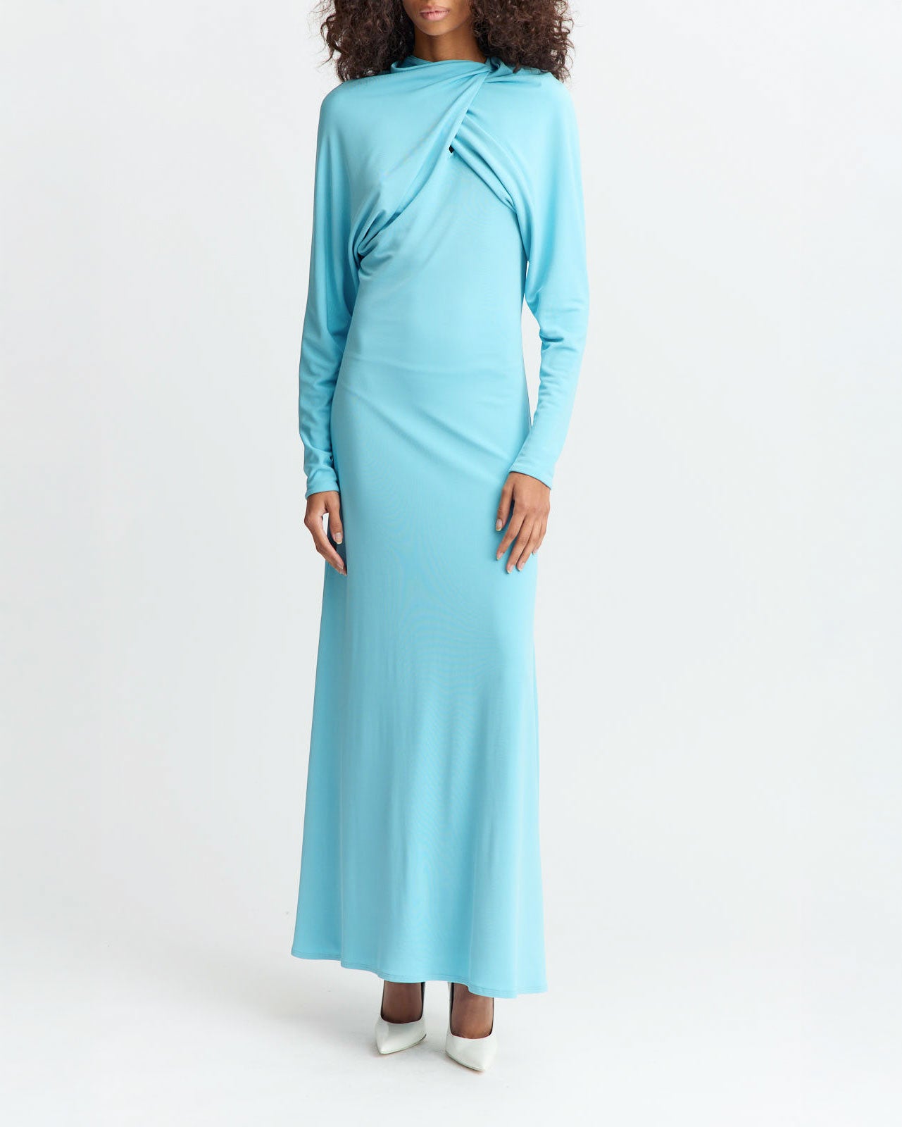 The Irro Midi Dress is cut in a heavy cerulean blue jersey with long sleeves and a twisted neckline created by a subtle fabric wrap. It falls to the ankle and features a concealed back zip for a clean, fitted silhouette.