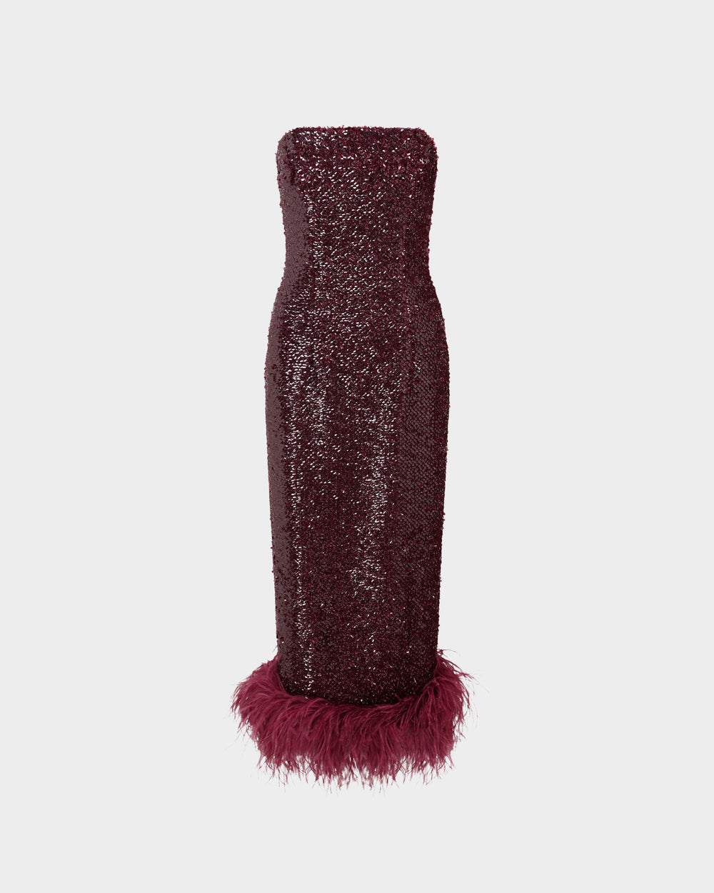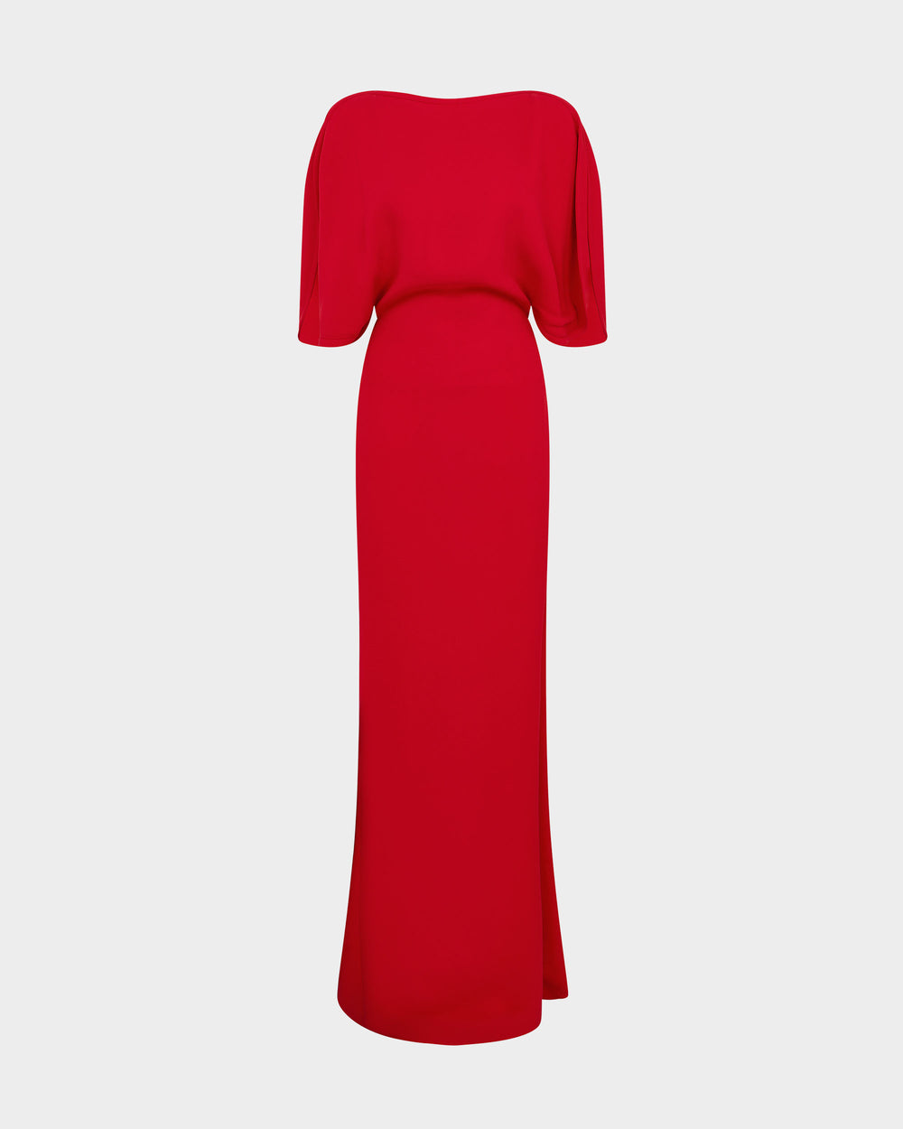 The Lett Gown is a floor-length design in rich burgundy, cut for a gently fitted shape through the body. It features a jewel neckline and short sleeves, with feathered darting around the hem that adds soft texture and movement.