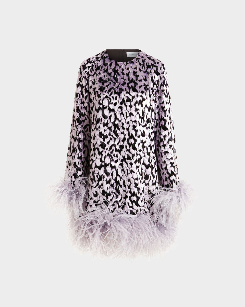 The Minelli Midi Dress is a strapless design crafted in purple and black devoré, creating a rich, textured pattern with depth and dimension. Structured with an internal corset for a sculpted fit, it falls to the floor and is finished with a back slit for ease of movement. A sleek back zip ensures a clean, polished silhouette.