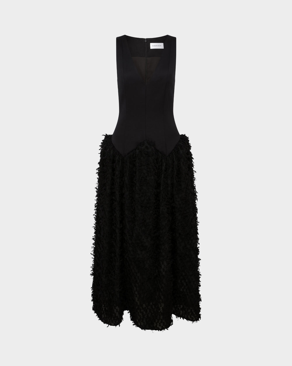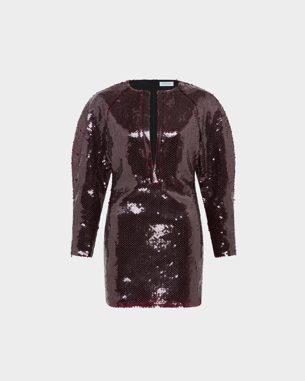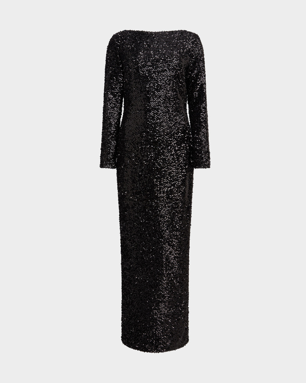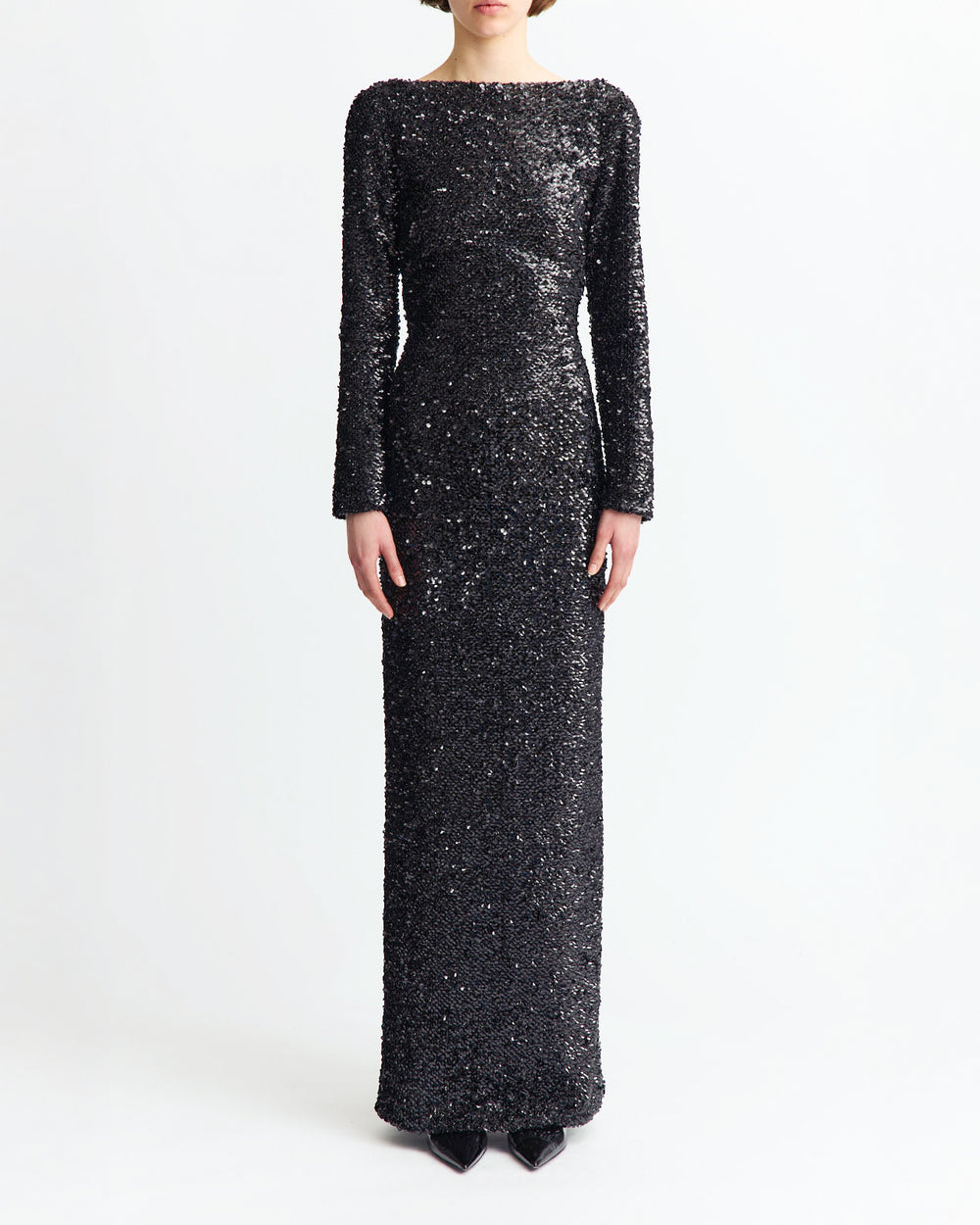 The Mitilla Gown is an elegant, floor-length silhouette cut from black sequins with a subtle, liquid shine. It features a slim plunge split at the front and sculptural long sleeves; voluminous through the shoulders and upper arms before tapering at the wrists. Designed to skim the body, it brings quiet drama and refined glamour to evening dressing.