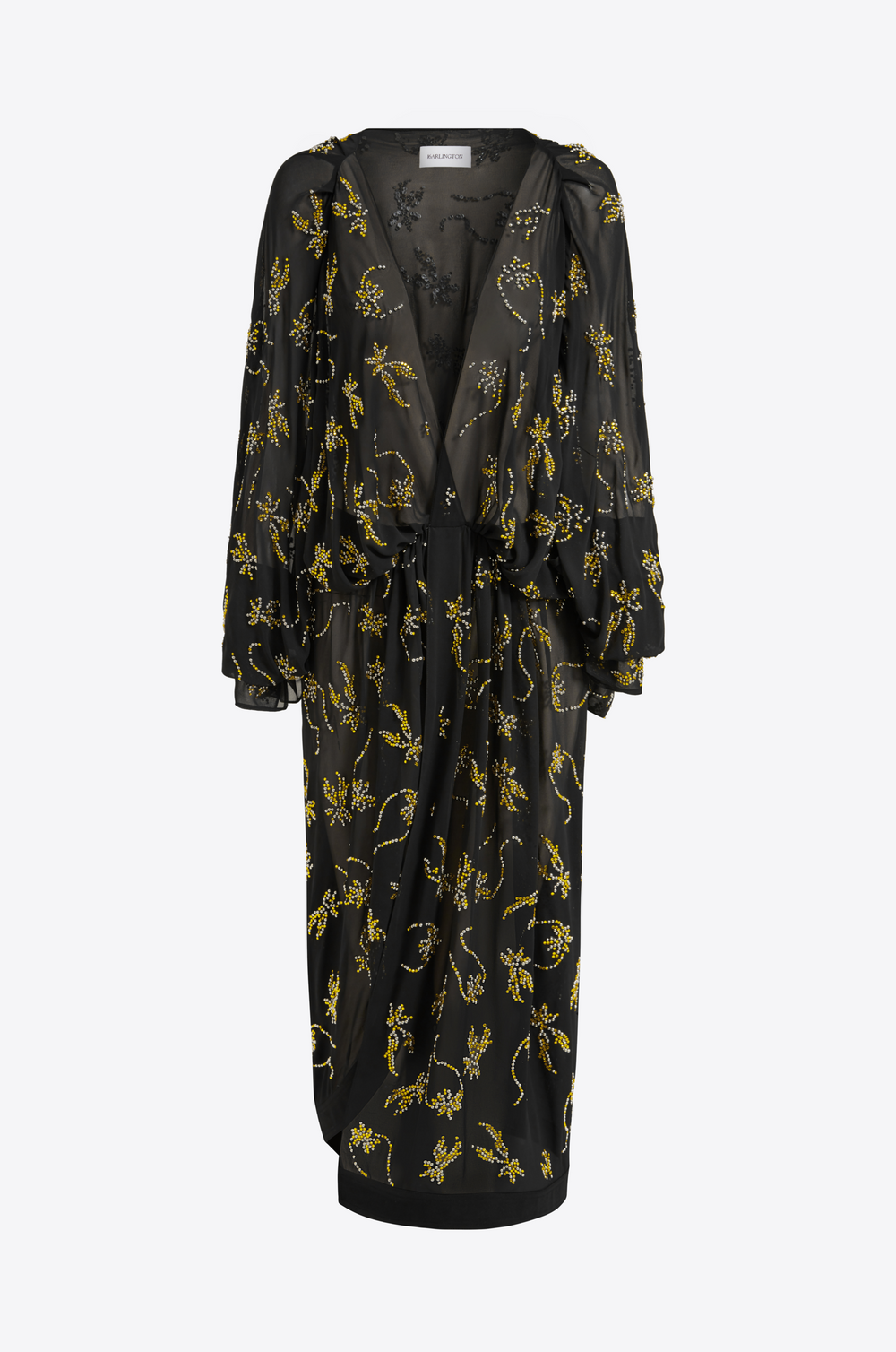 The Tilde Dress features long balloon sleeves with cuffs and inner arm slits, a deep V neckline, and a ruched waist panel. Cut from soft crepe in buttery yellow with contrasting black panels, it has a draped silhouette throughout. Featured as Look 3 on the SS25 runway, this design reflects the season’s relaxed aesthetic.