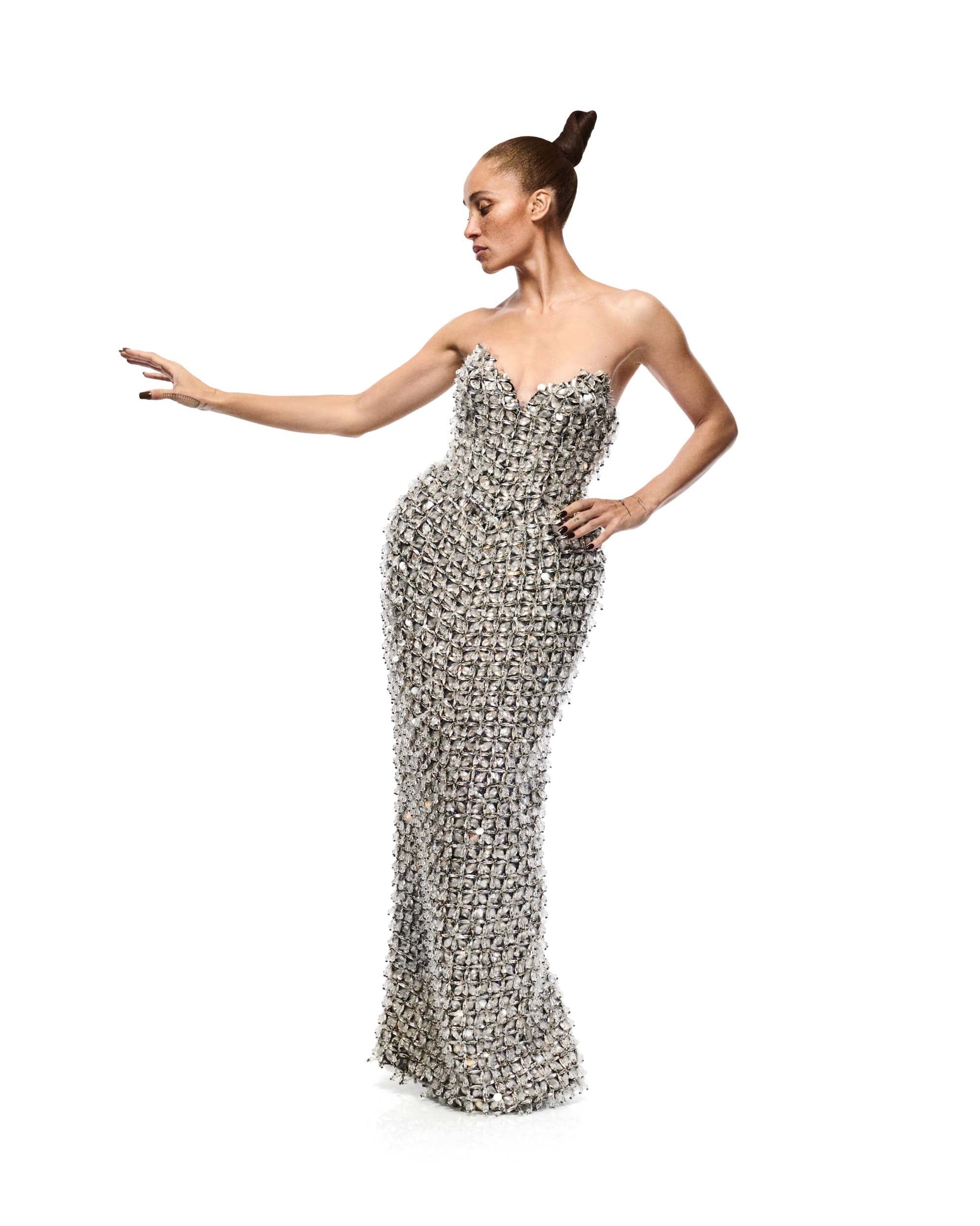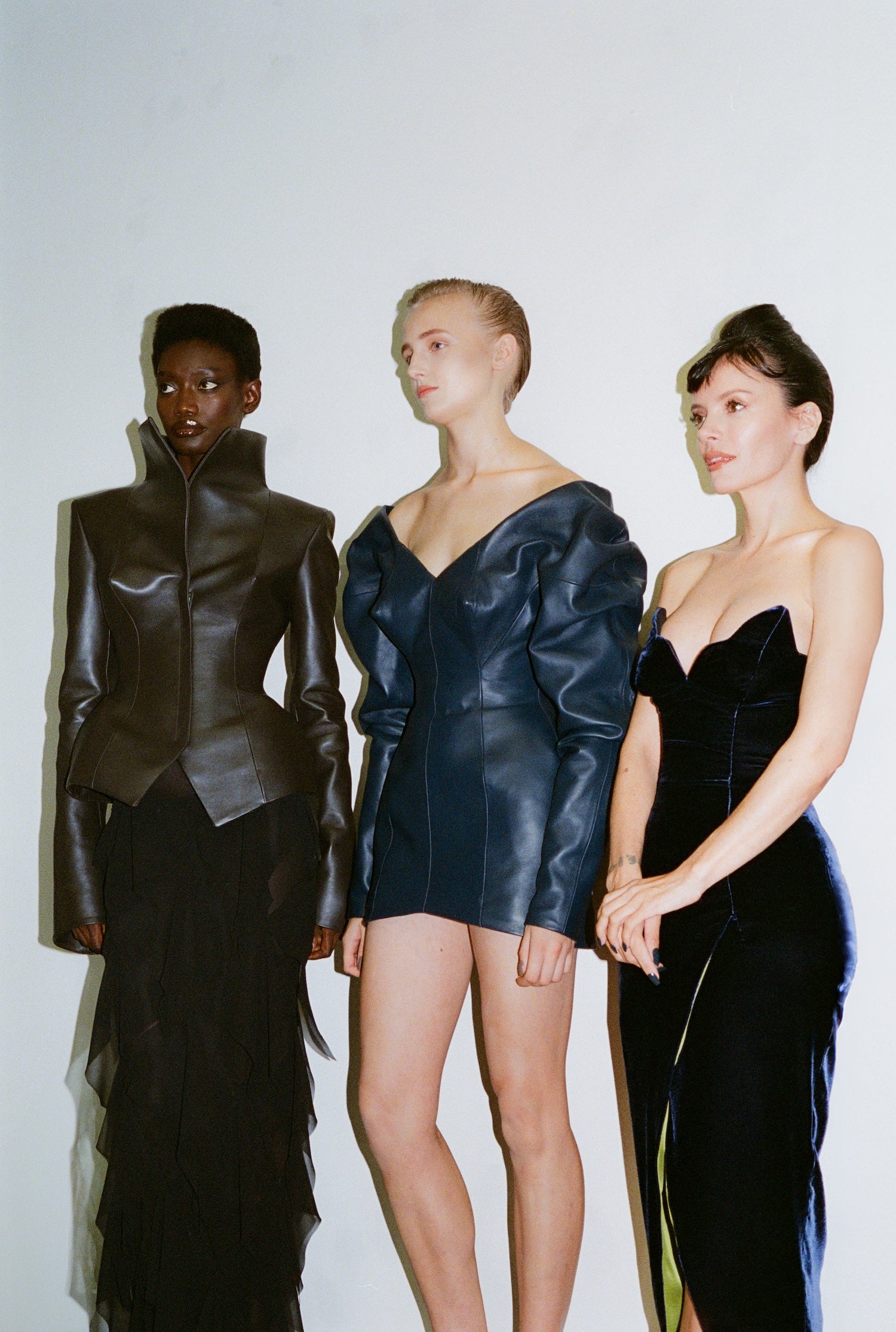 An evolving vocabulary of glamour, expressed through clothes. Construction is paramount, a means of shaping confidence through the body. Embroideries of crystal and feathers contour forms, chiffon and velvet melt, while archetypical evening silhouettes are translated unexpectedly, in fetishistic leathers or trompe l’oeil treatments of animalier print. Delineations of the hallmarks of both 16ARLINGTON and Antony Price come together in new hybrids - masculine feminine, day and night, always with an elegance and beauty.