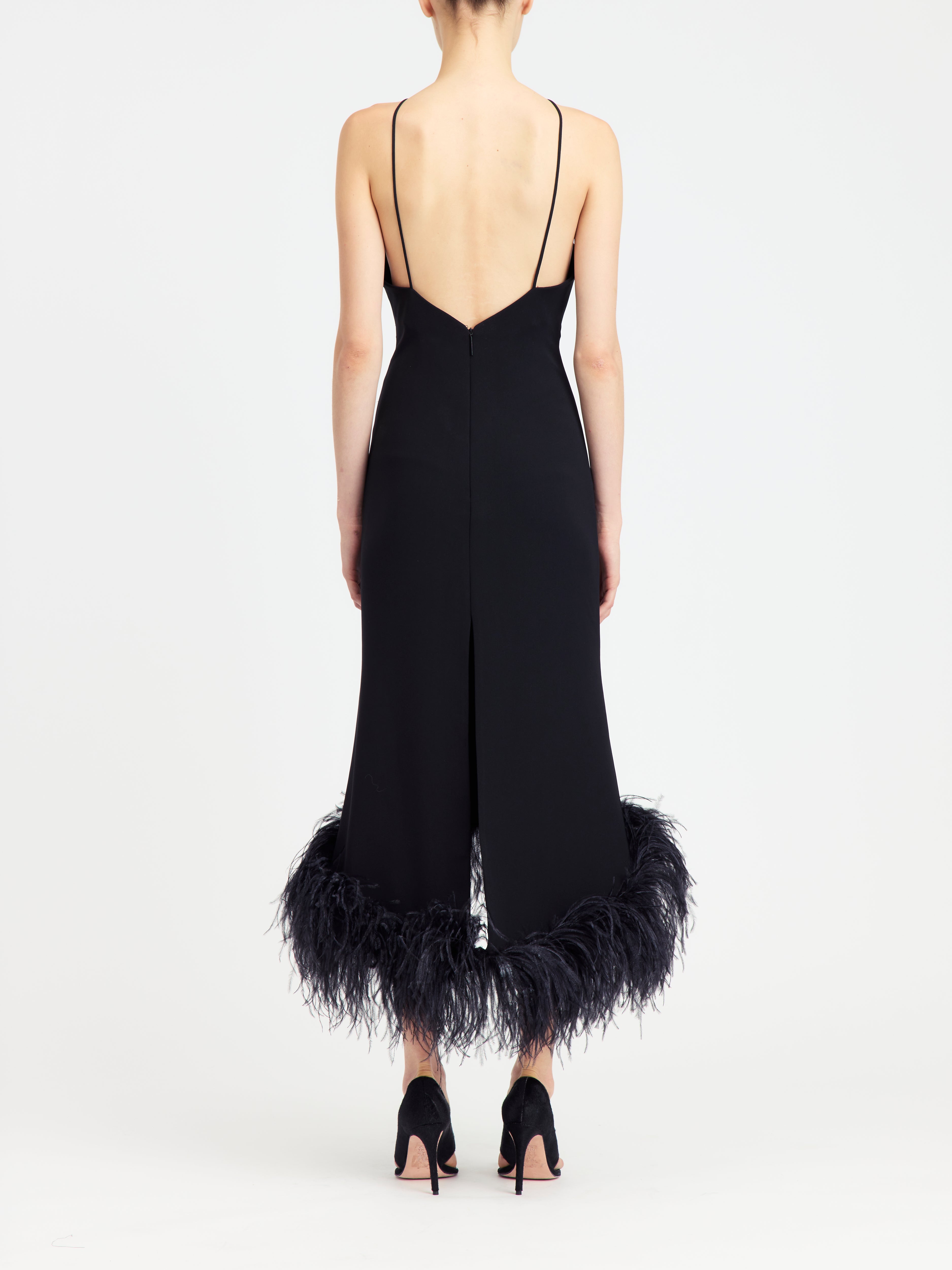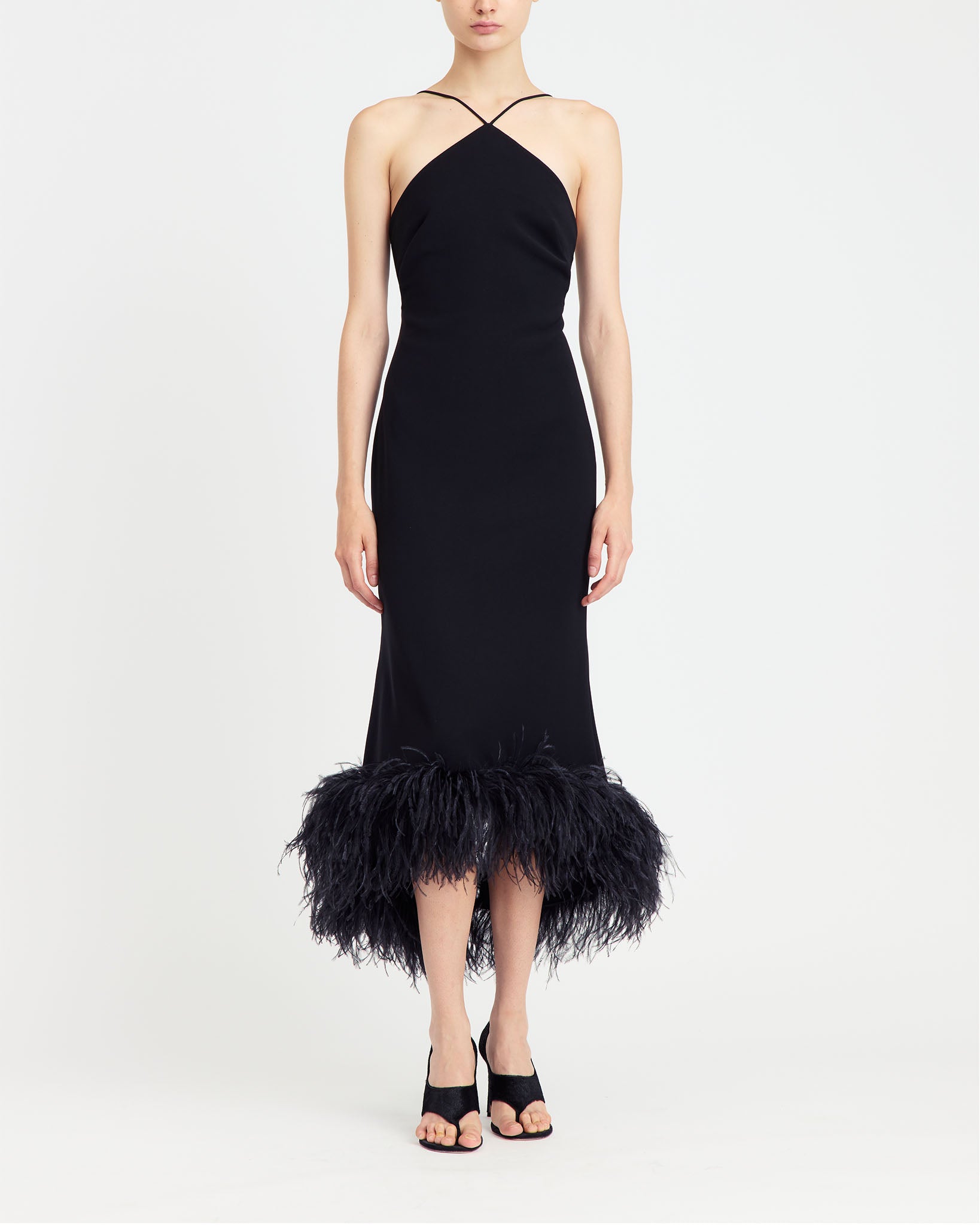 The Ade dress is made from deep black crepe, structured yet soft against the body. The fitted bodice features a cross-strap halter neckline and a low-cut back. From the waist, a narrow trumpet skirt falls to a midi length, dipping lower at the front and extending longer at the back, finished with a plush feather trim that flows softly as you move.
