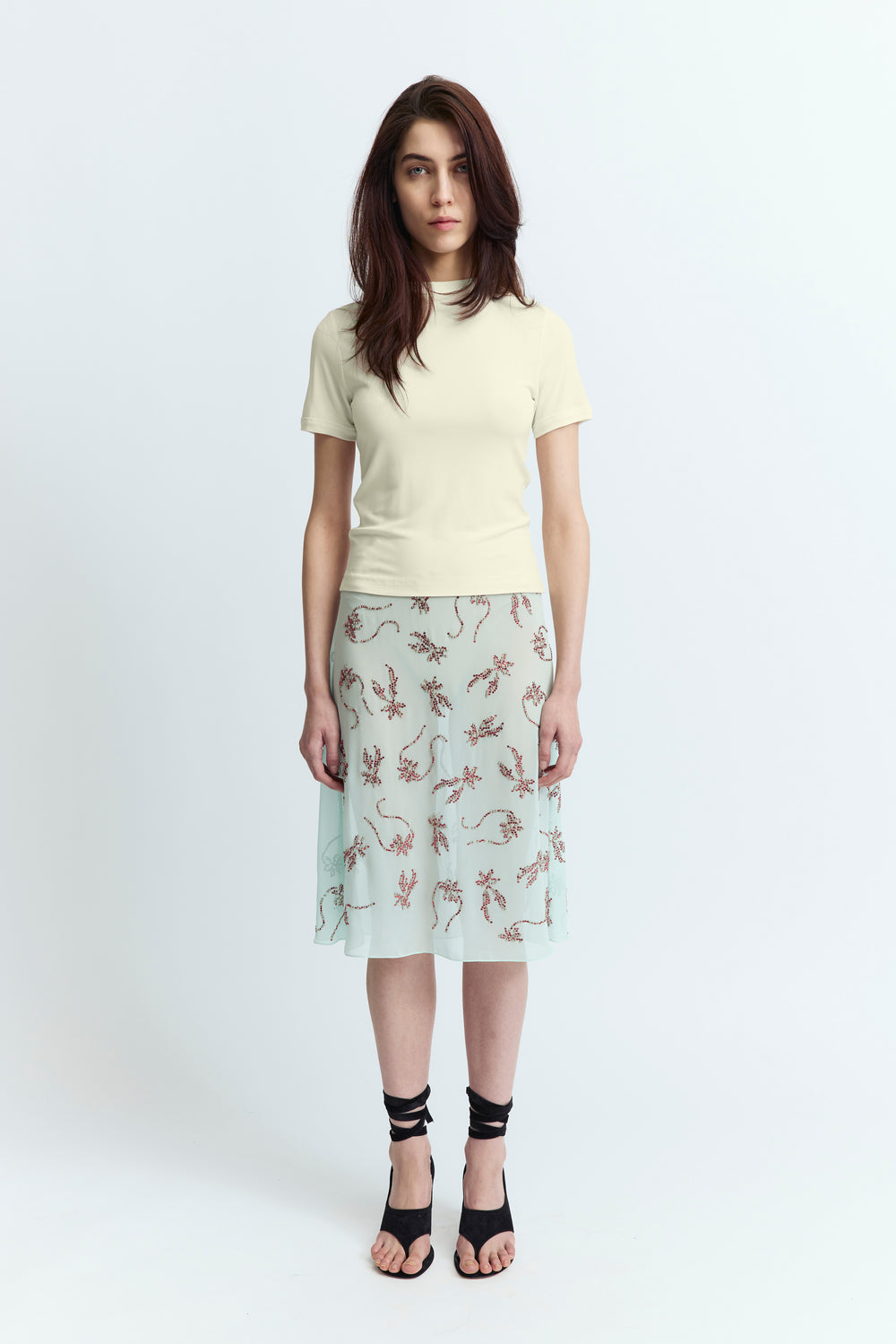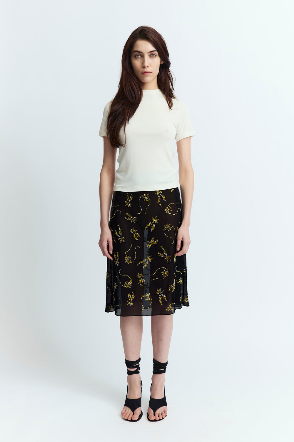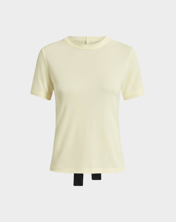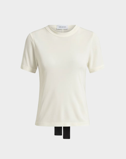 The Adwa T-Shirt in black is made from soft stretch jersey for a close, body-hugging fit. It has short sleeves, a scoop neckline, and a ribbon with double-stitched borders tied at the nape of the neck, adding subtle detail to a classic design. Availbale in white and yellow.