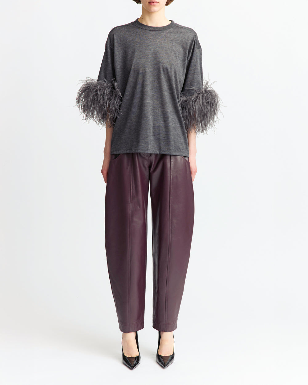 The Alcea Trouser is a tailored piece cut from rich burgundy leather, designed with a slight balloon fit that adds soft structure through the leg. Piped seams run along the front and back, creating a clean, elongated line. Featuring four pockets, two at the front and two at the back, alongside three buttons at the rear and belt loops at the waist, it offers a refined balance of precision and edge.
