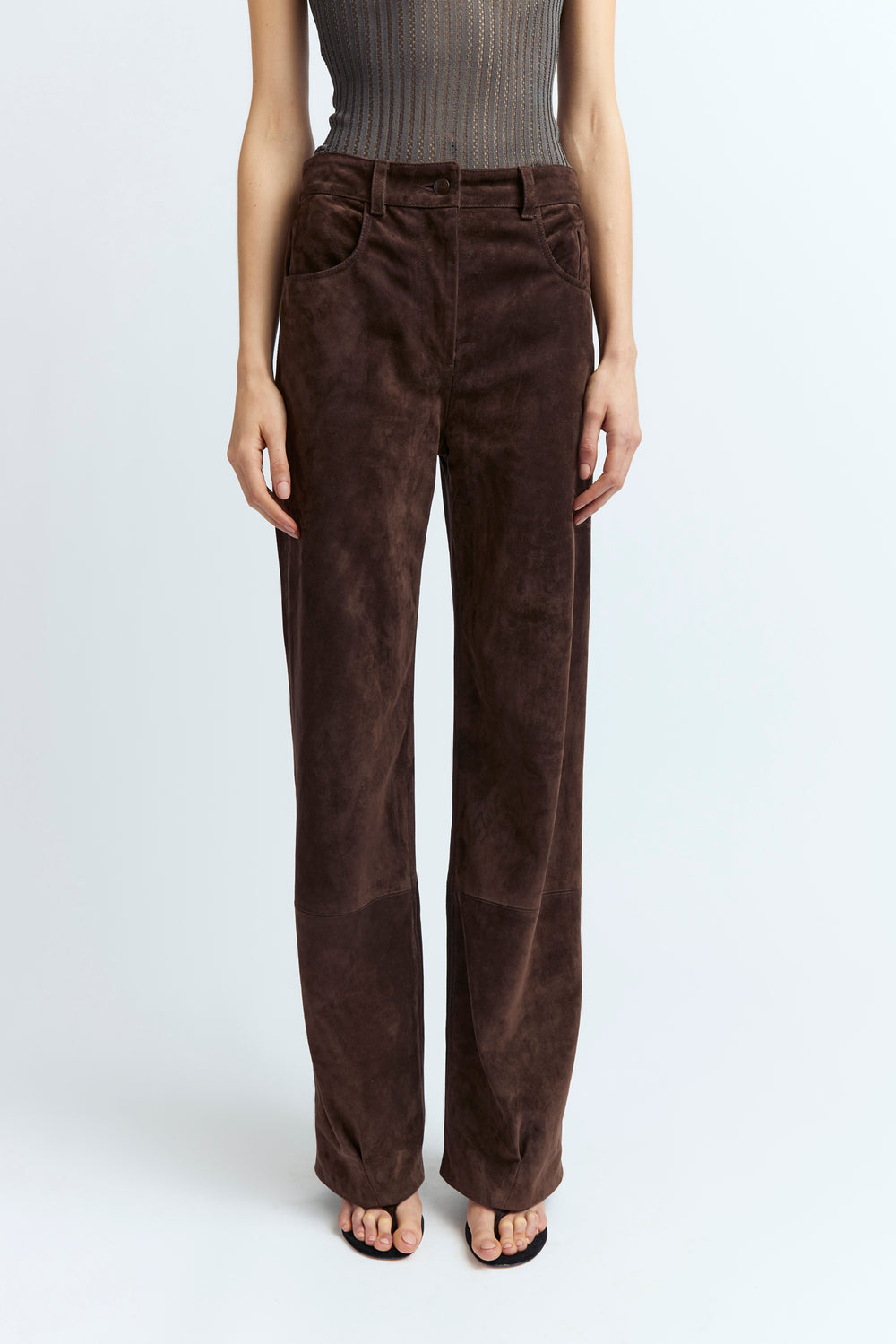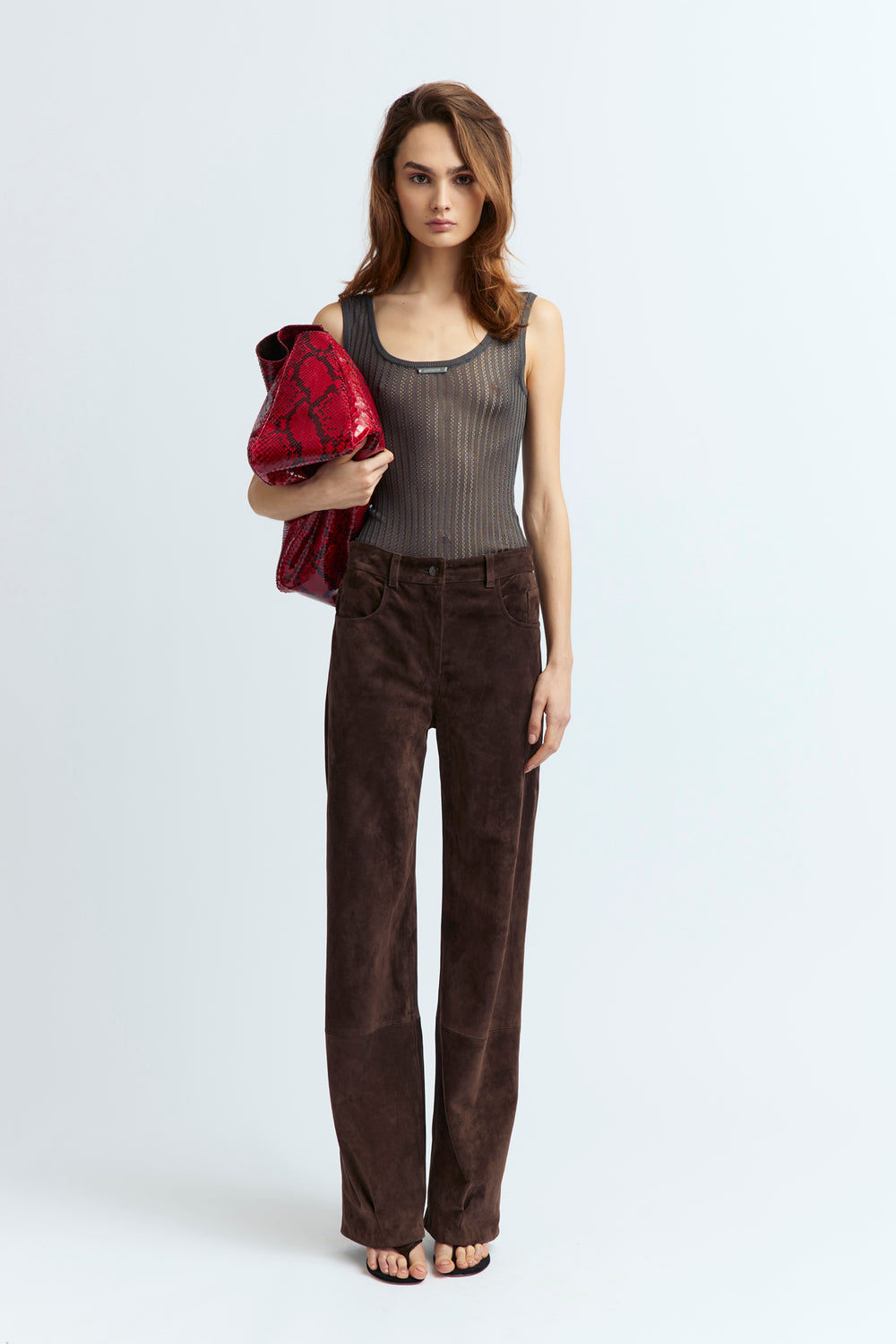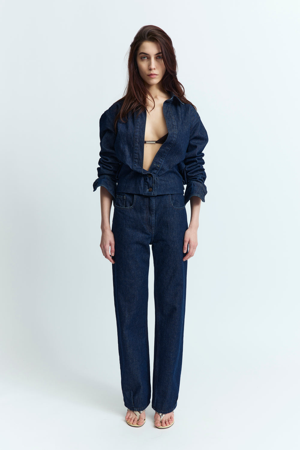 The Armine Trouser is a straight-leg design with a slightly tapered silhouette, featuring a dart at the hem for added structure. Branded with the 16Arlington leather patch on the rear waistband, it includes four pockets – two at the front and two at the rear. Styled with the matching Ada Jacket for the SS25 runway show.