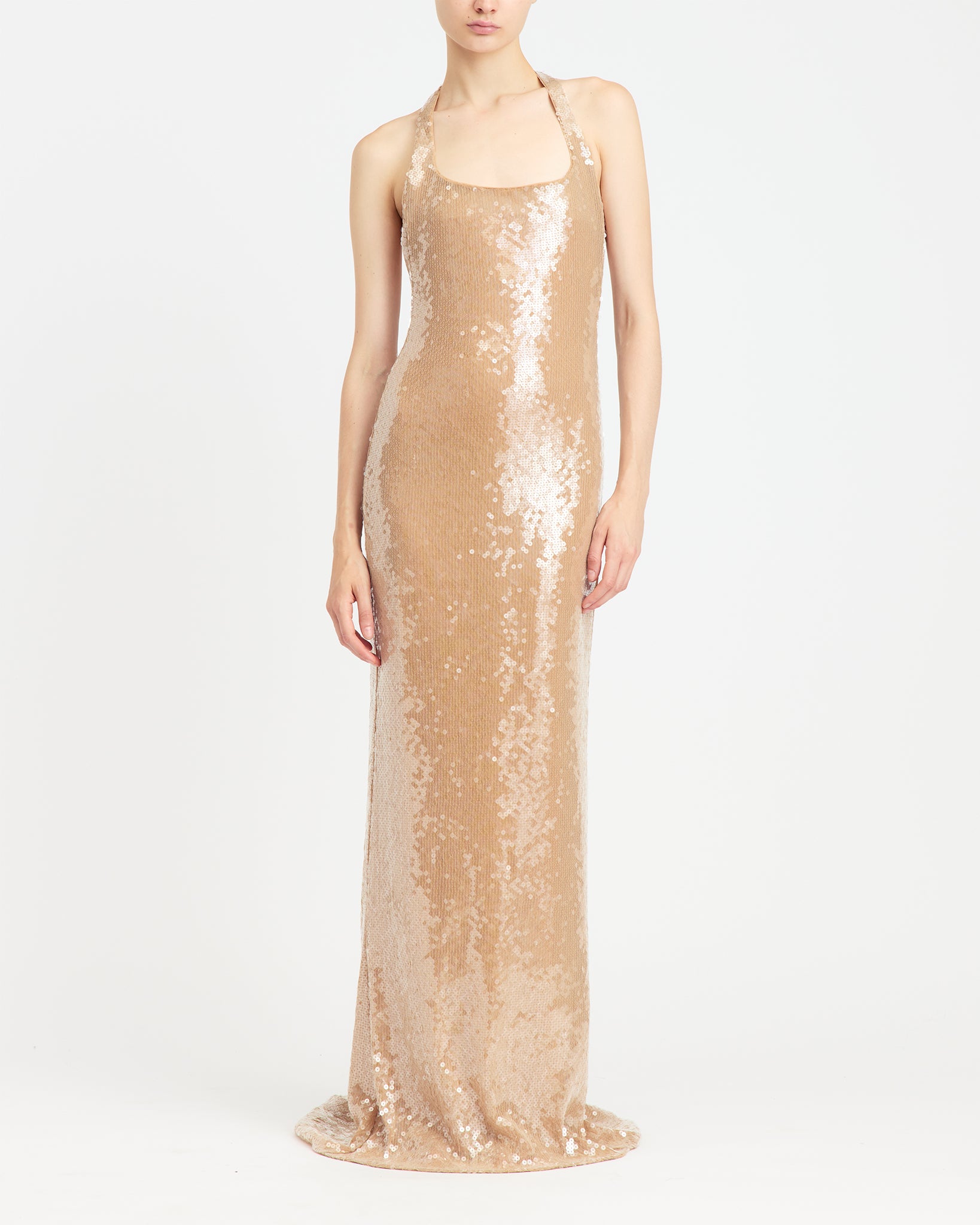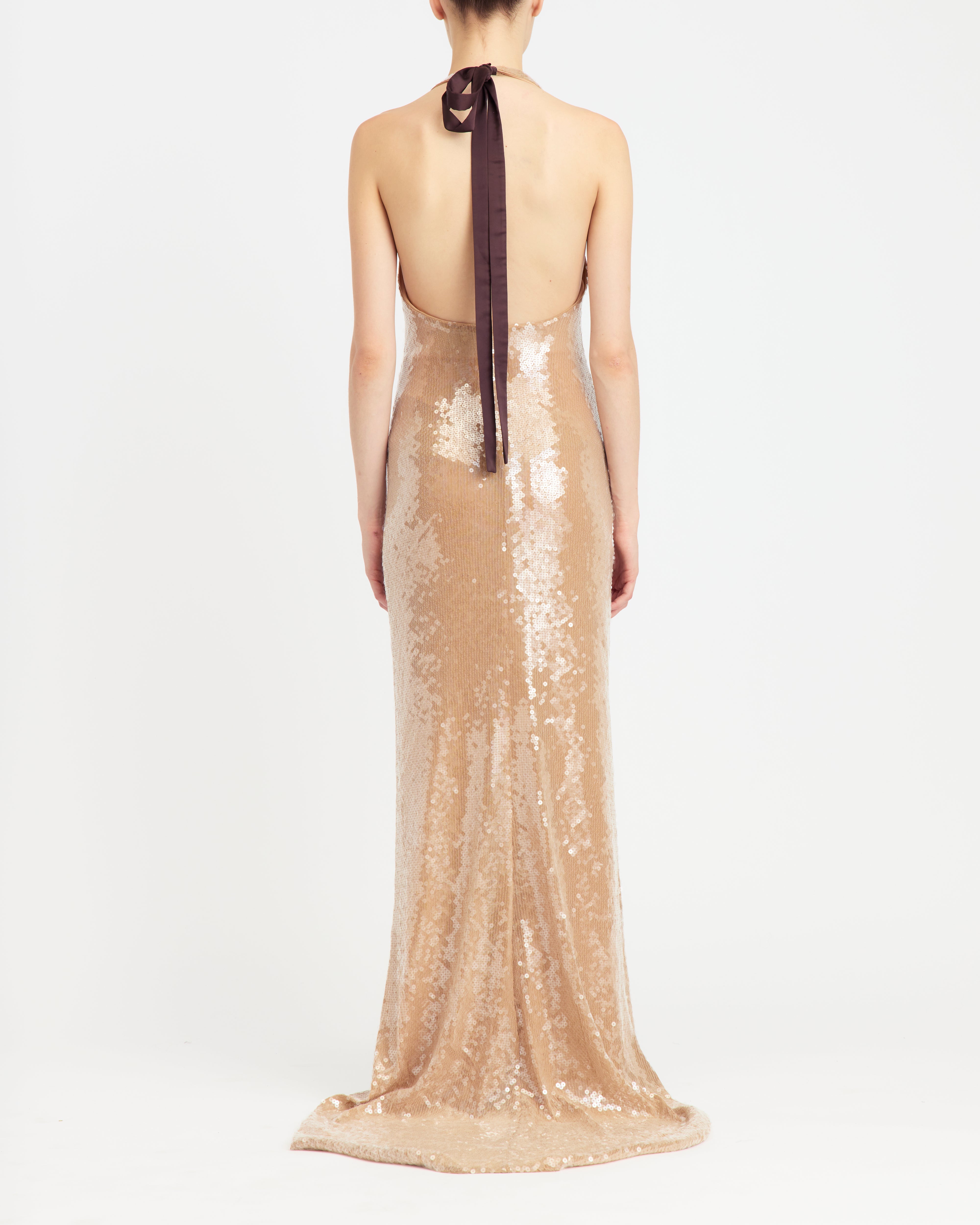 The Auden gown is cut from sheer nude sequin, fitted throughout in a sleek silhouette. The square neckline is framed by halter straps that tie at the back with dark chocolate satin ribbons. The floor-length skirt follows a sheath line and extends into a puddle train for a refined, elongating effect.