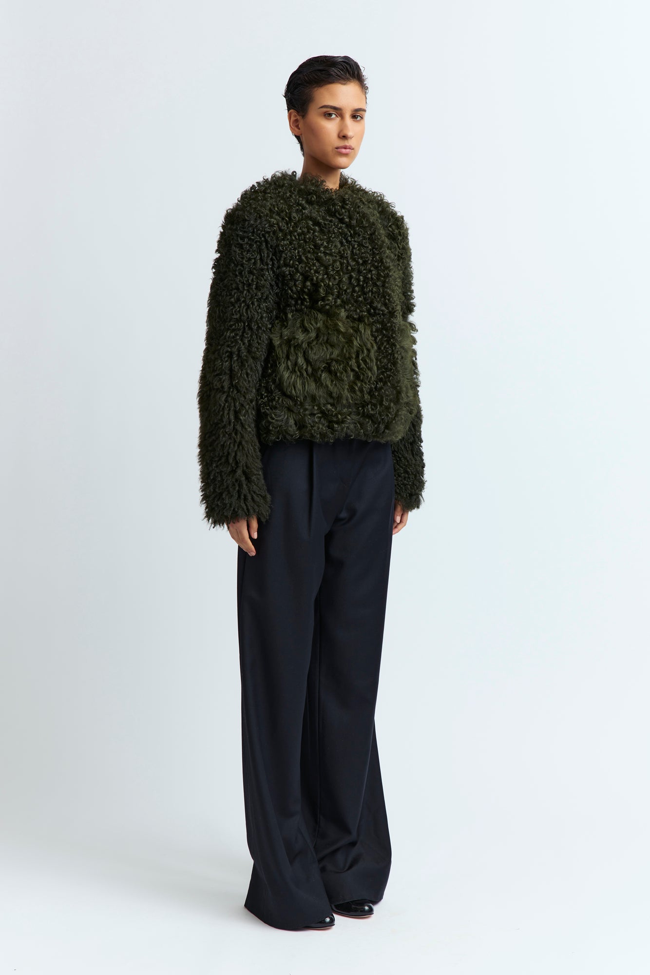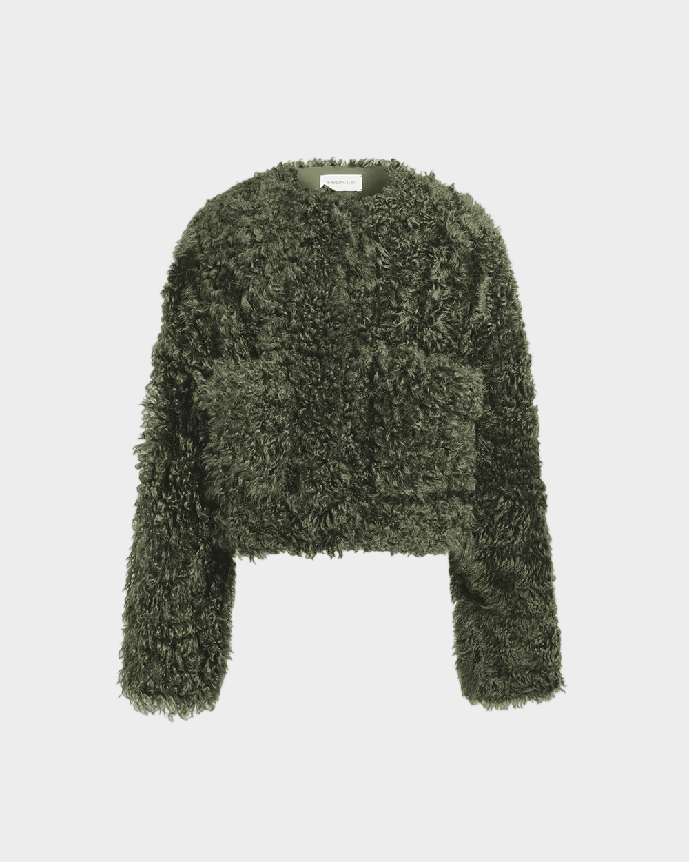 The Bia Coat is a collarless shearling coat with hidden hook fastenings. It features two pockets at the front and is designed to fit close to the body. It falls just below the waist and is also available in black