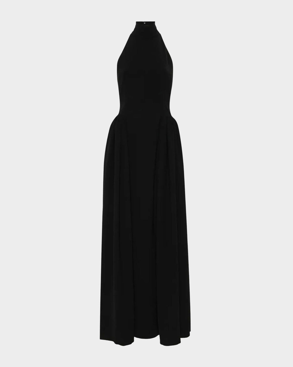 The Casini Gown in black is a high neck backless, sleeveless dress that falls to the floor. It features a padded exaggerated hip with ruching detailing on either side that hugs the waist. The funnel neck attaches at the front and fastens at the back with a zip.