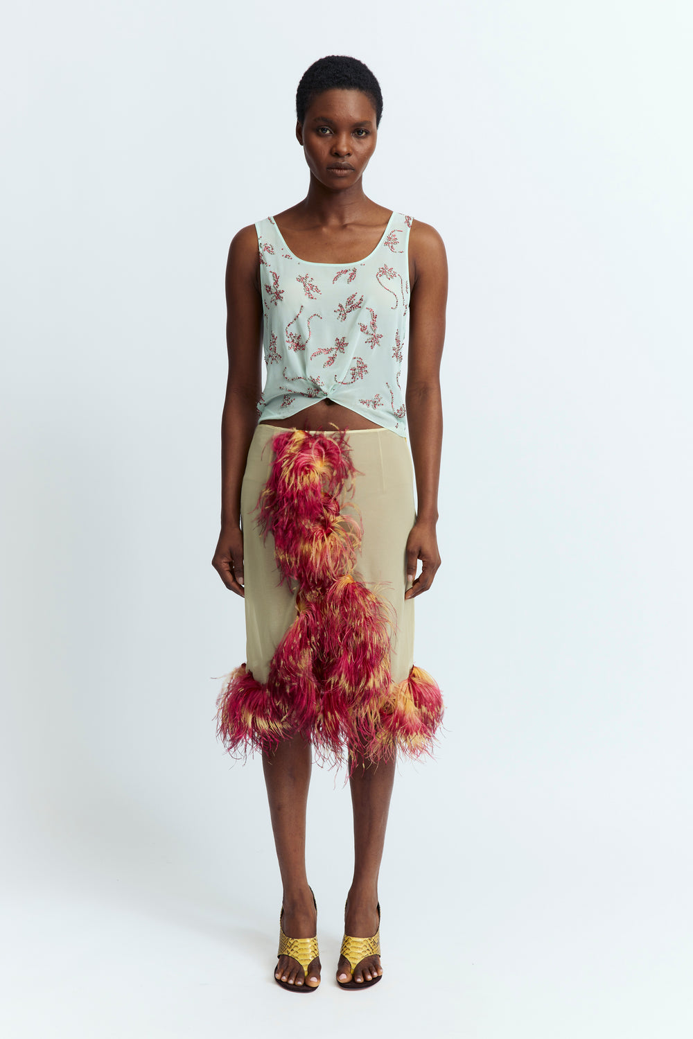 The Dafne Skirt in pale blue is a midi-length design cut from flowing georgette fabric, featuring a custom floral pattern with rose-colored crystal hotfix detailing. Falling below the knees, it has a loose, fluid fit and fastens at the back with a concealed zip.