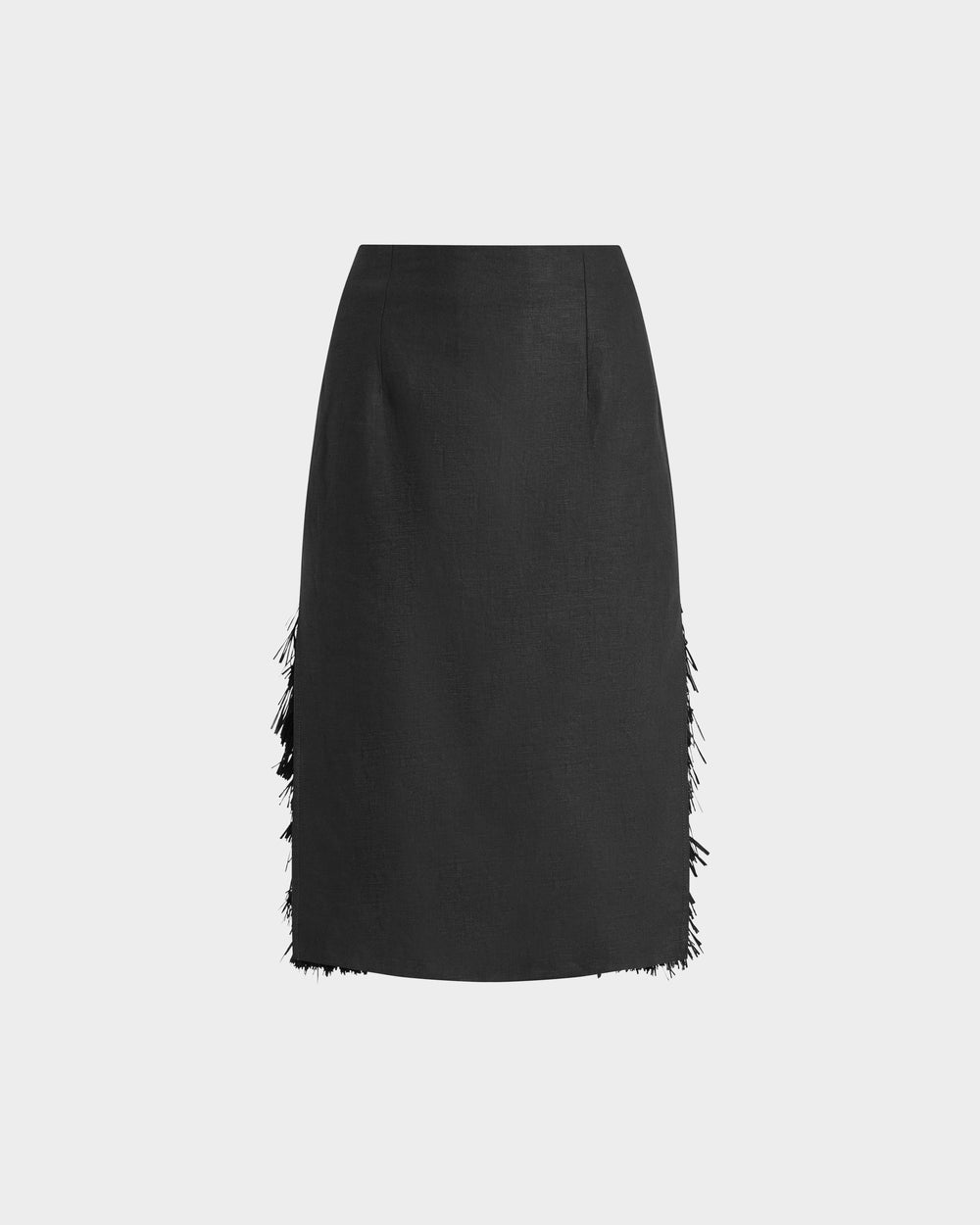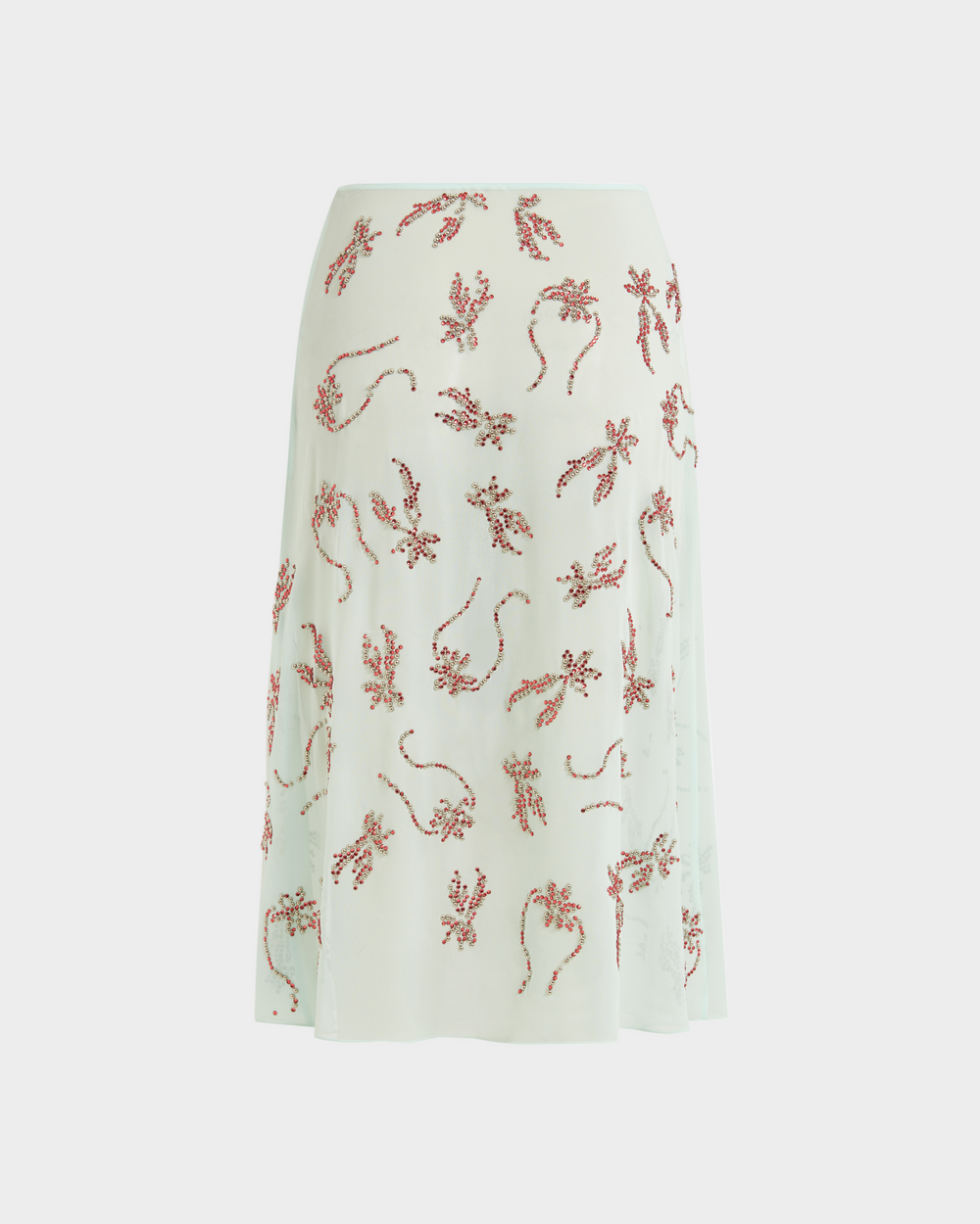 The Dafne Skirt in black is a midi-length design cut from flowing georgette fabric, featuring a custom floral pattern with citrine-colored crystal hotfix detailing. Falling below the knees, it has a loose, fluid fit and fastens at the back with a concealed zip.