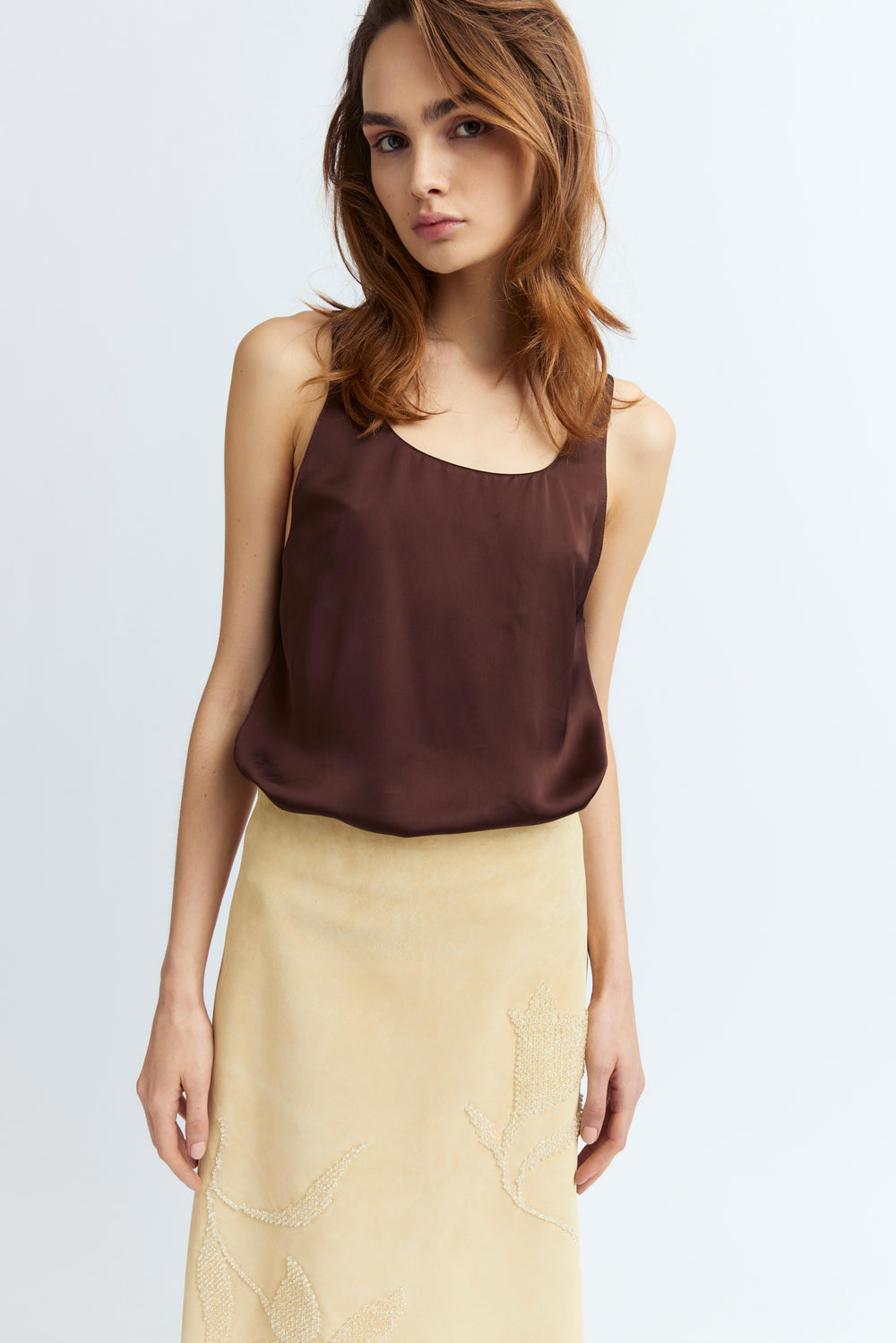The Dafne Skirt in yellow is a midi-length design crafted from supple suede, featuring hand-stitched glass bead floral embellishments. Falling below the knees, it has a narrow A-line silhouette and a relaxed fit. It fastens at the back with a concealed zip.