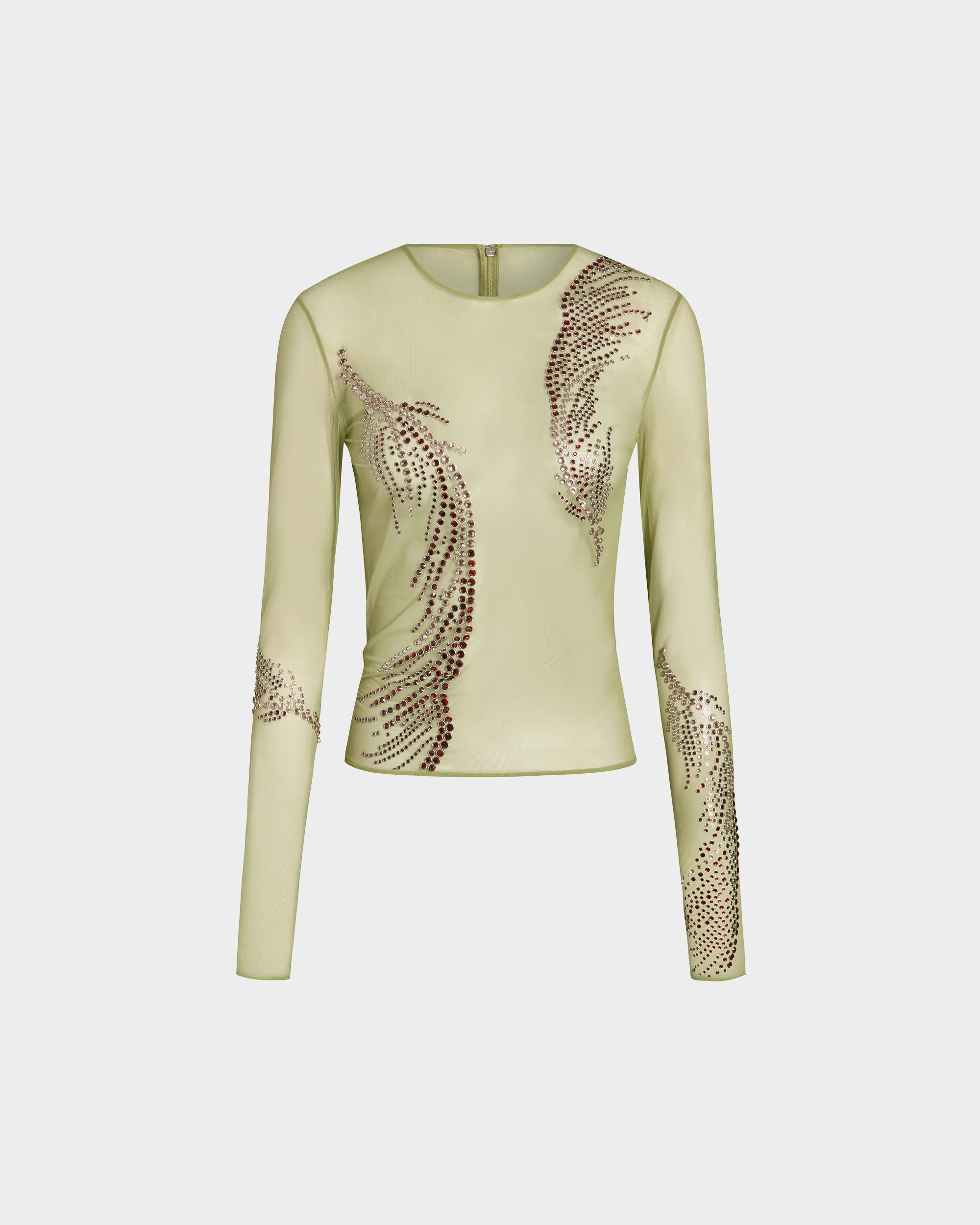 The Darwin top is cut from citrus green sheer mesh, adorned with feather-shaped crystal hot-fix appliqué on the front and sleeves. It features a minimal, slimline silhouette with a slightly cropped fitted bodice, long sleeves, and a round neckline.