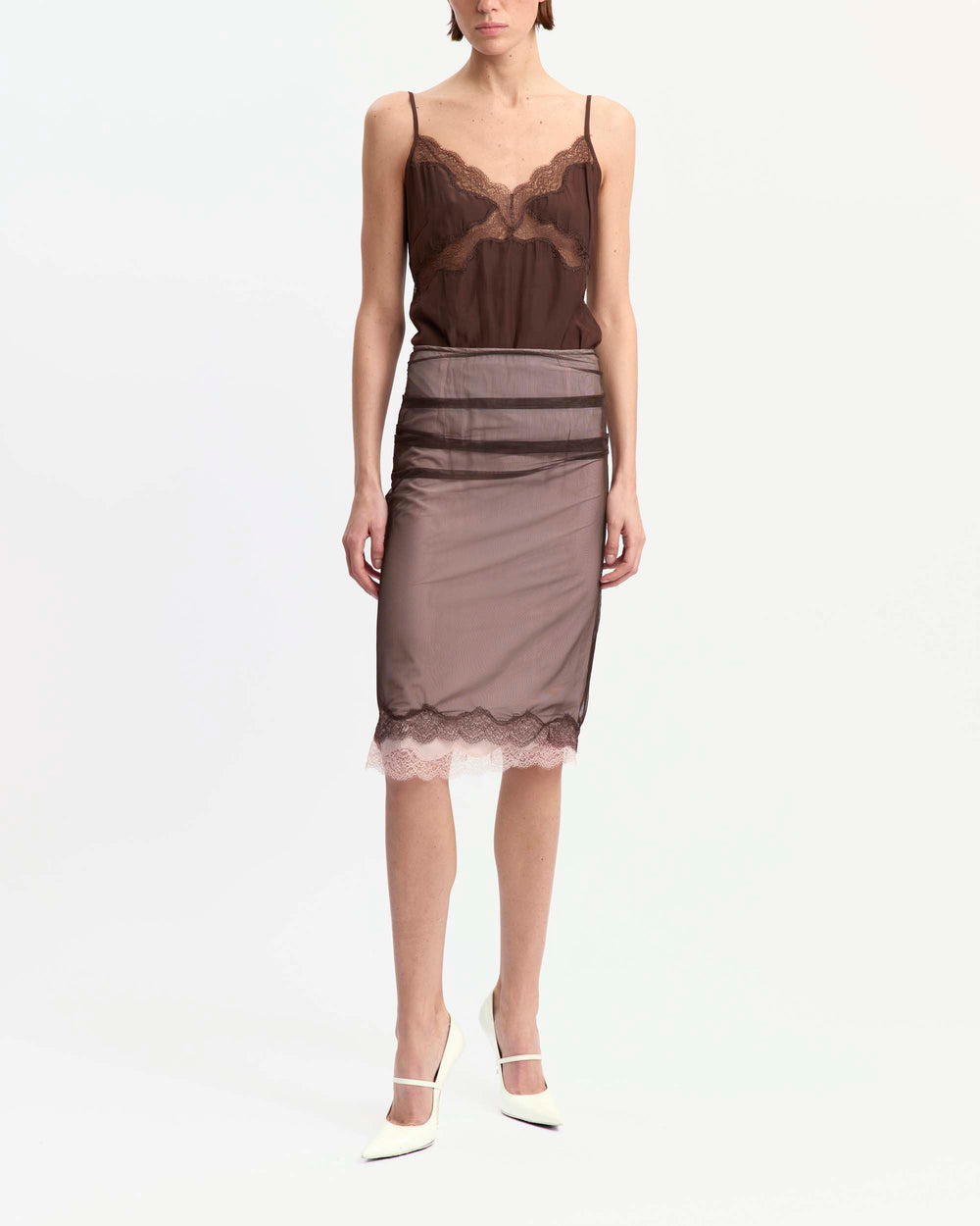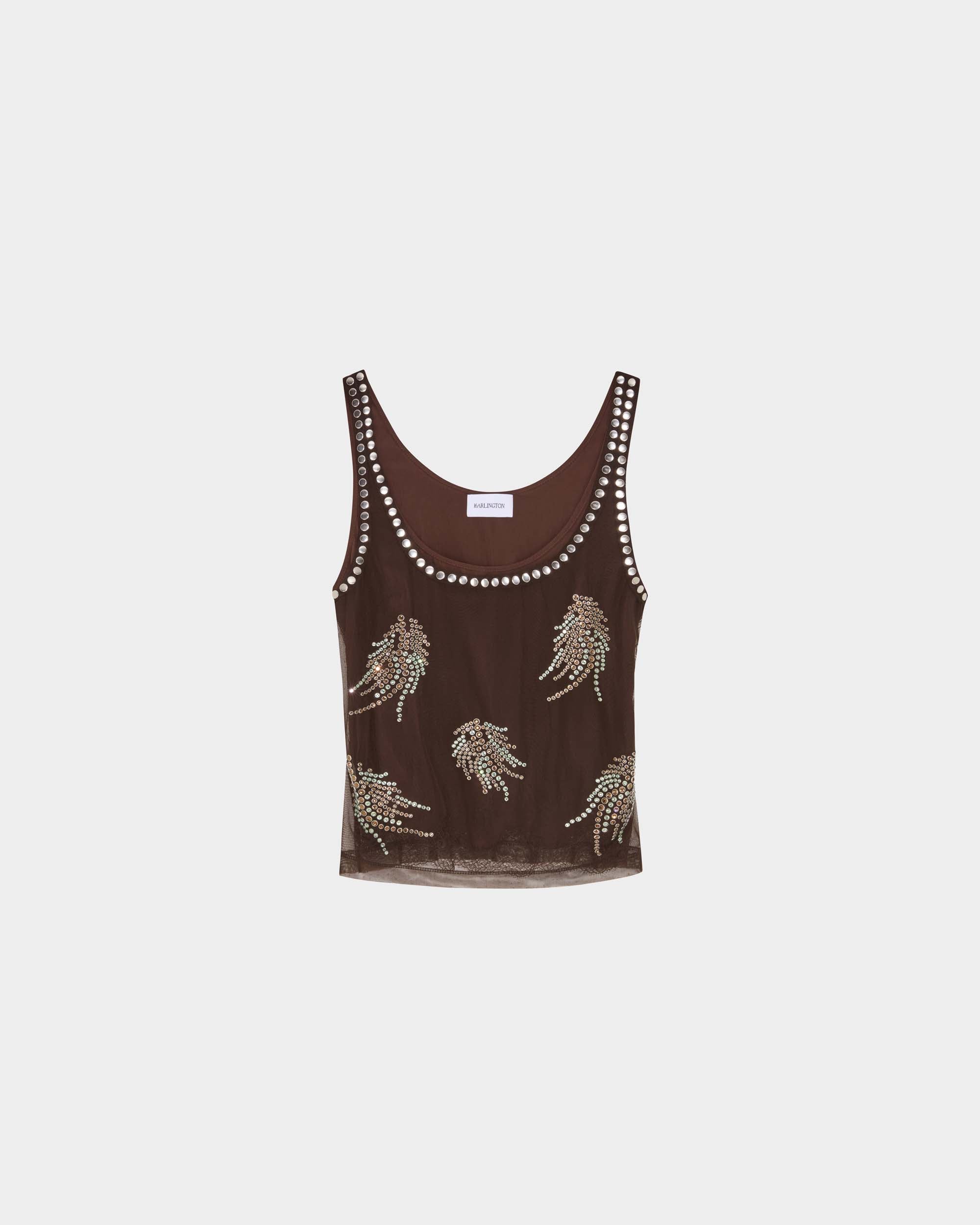 The Esha top features feather-pattern crystal hot-fix applications on chocolate mesh, each section individually applied. The scoop neckline is embellished with hand-set rivets on the front and back, adding contrast to the otherwise sleek silhouette.