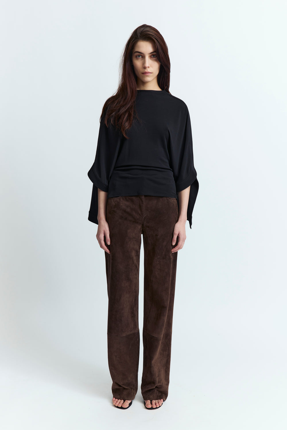 The Fale Top in white features cape-style sleeves and a backless design, secured at the nape with a tie finished with double-stitched borders. Cut from signature lightweight jersey, it is designed for a close fit.