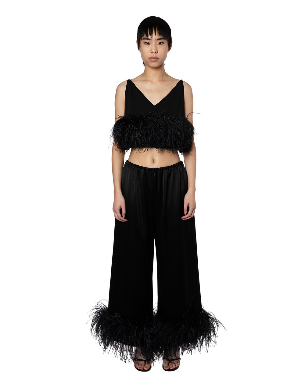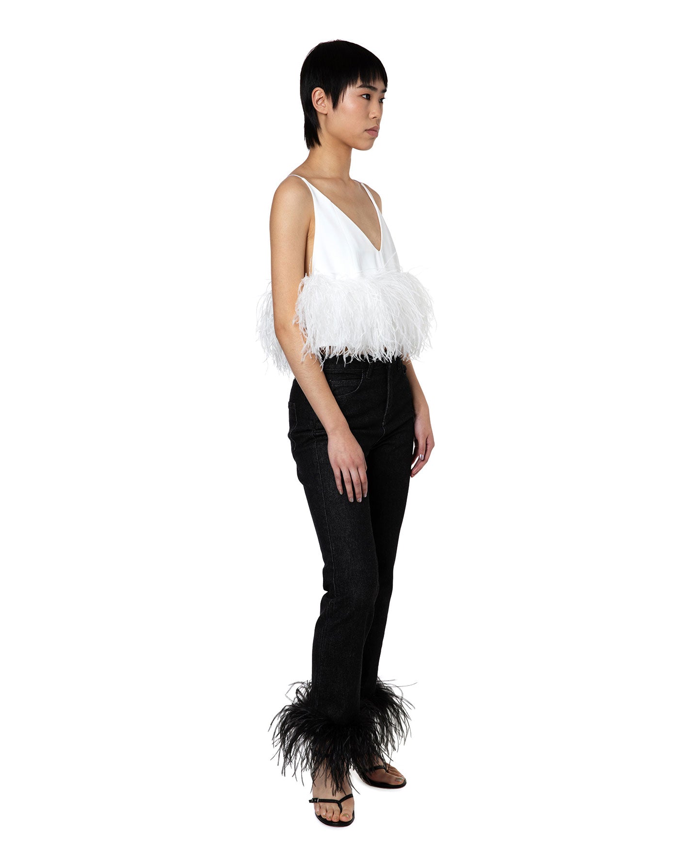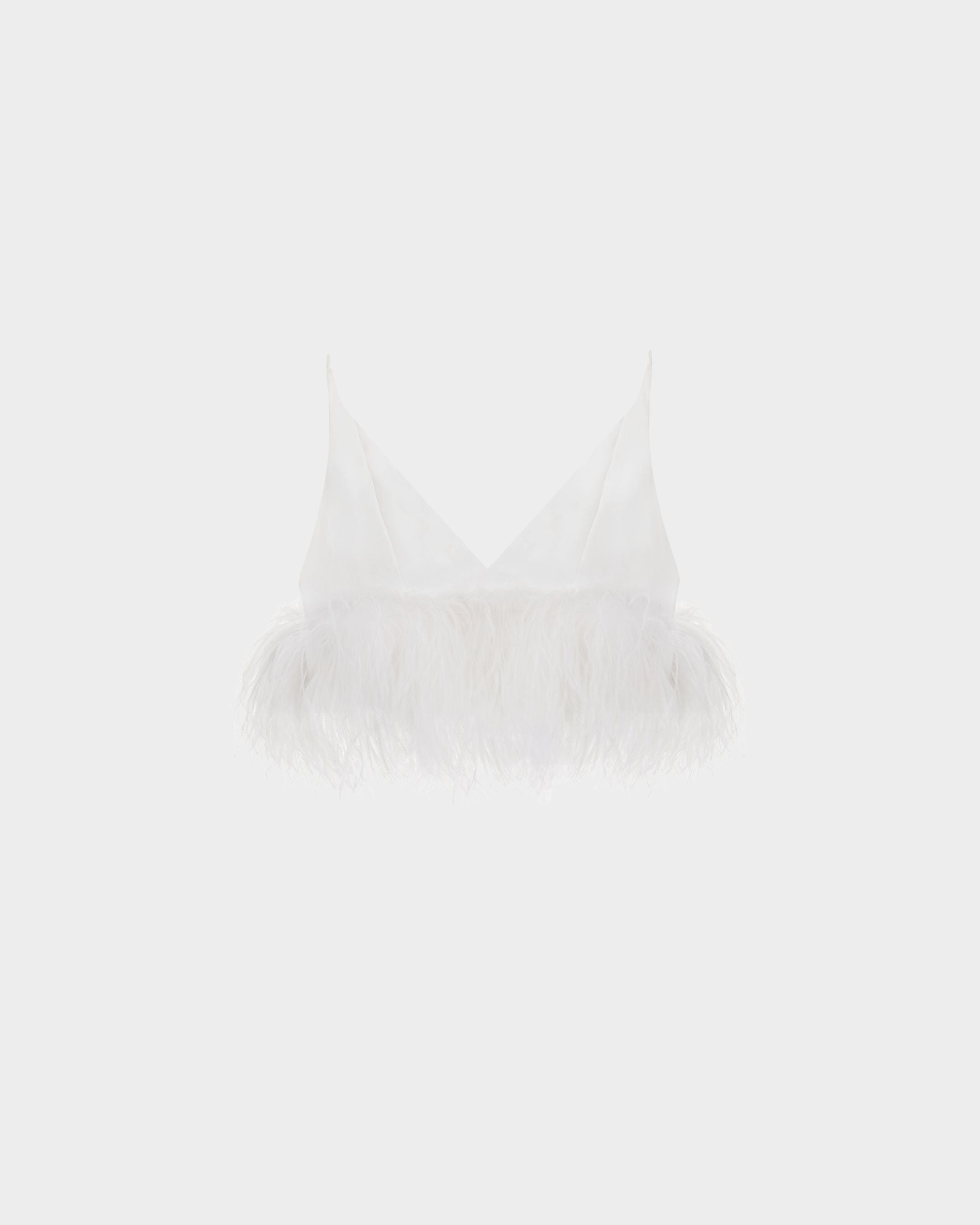 Poppy Camisole in white crepe features thin spaghetti straps and a loose fit that falls to an ostrich feather trim at the waist. It has a plunging neckline and a low open back, fastening with a concealed side zip.