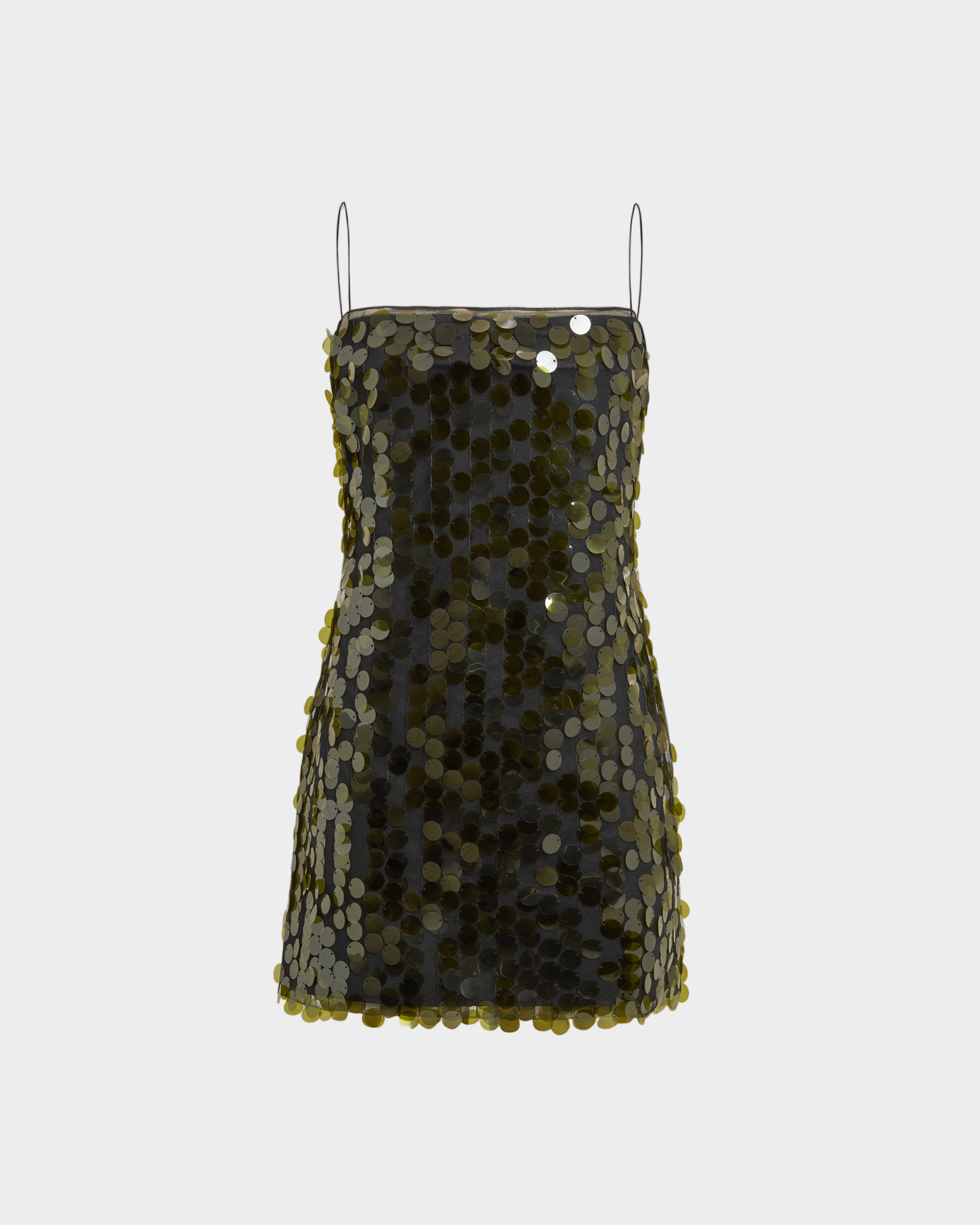 The Fia Mini Dress in green is crafted from mesh fabric covered in deep-green paillette embellishments, contrasting against the black base. It features a square neckline, thin spaghetti straps, and a sleeveless design. Thin, tipped straps tie at the back for an adjustable fit. The figure-hugging silhouette delivers a sleek and glamorous look.