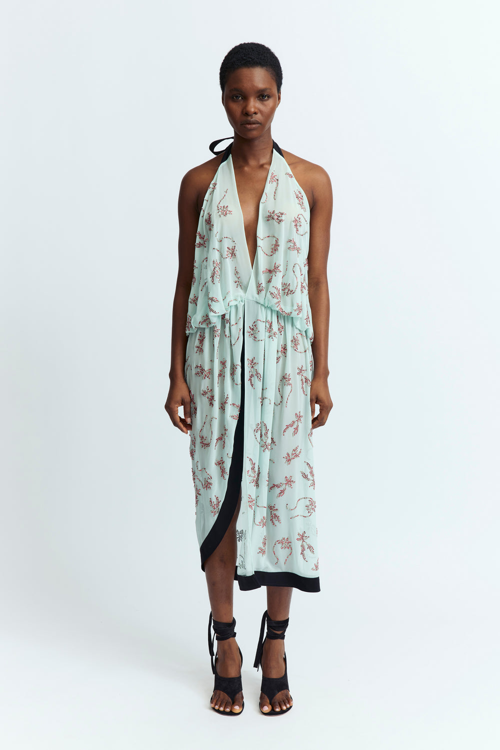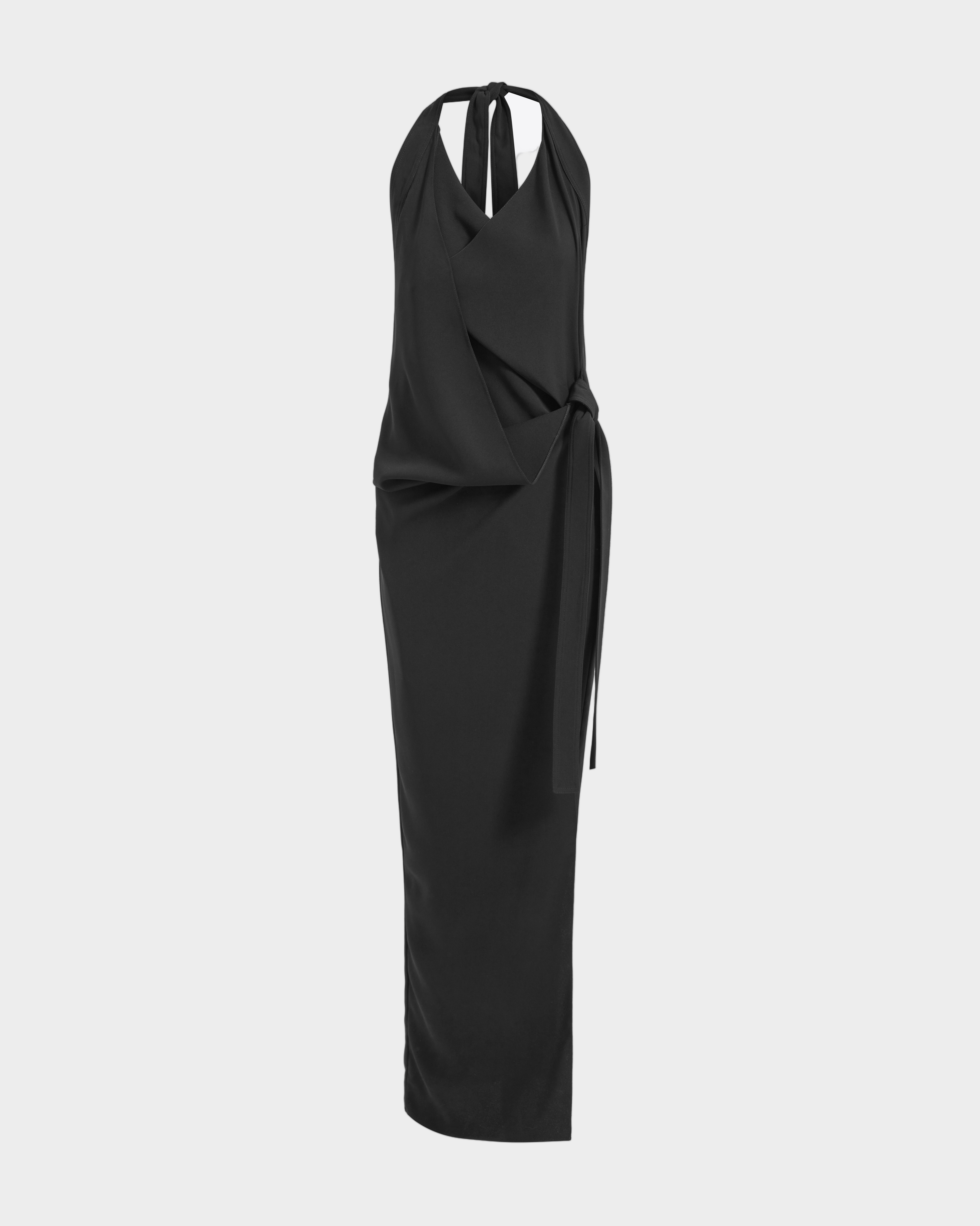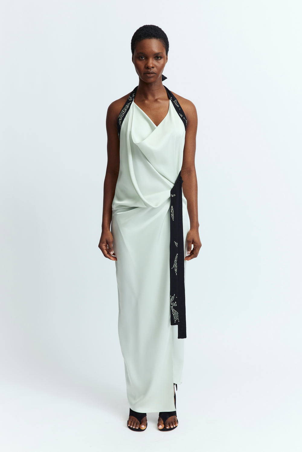 The Fiama Gown in black is a floor-length draped cowl-neck dress that ties at the back of the neck with a strap adorned with custom crystal hotfix appliqué. It features gathered detailing at the side of the waist and is cut for a close fit.
