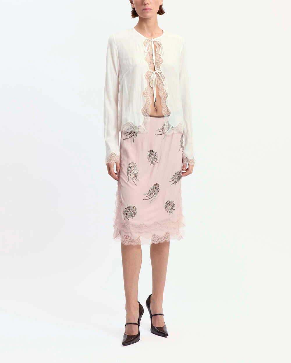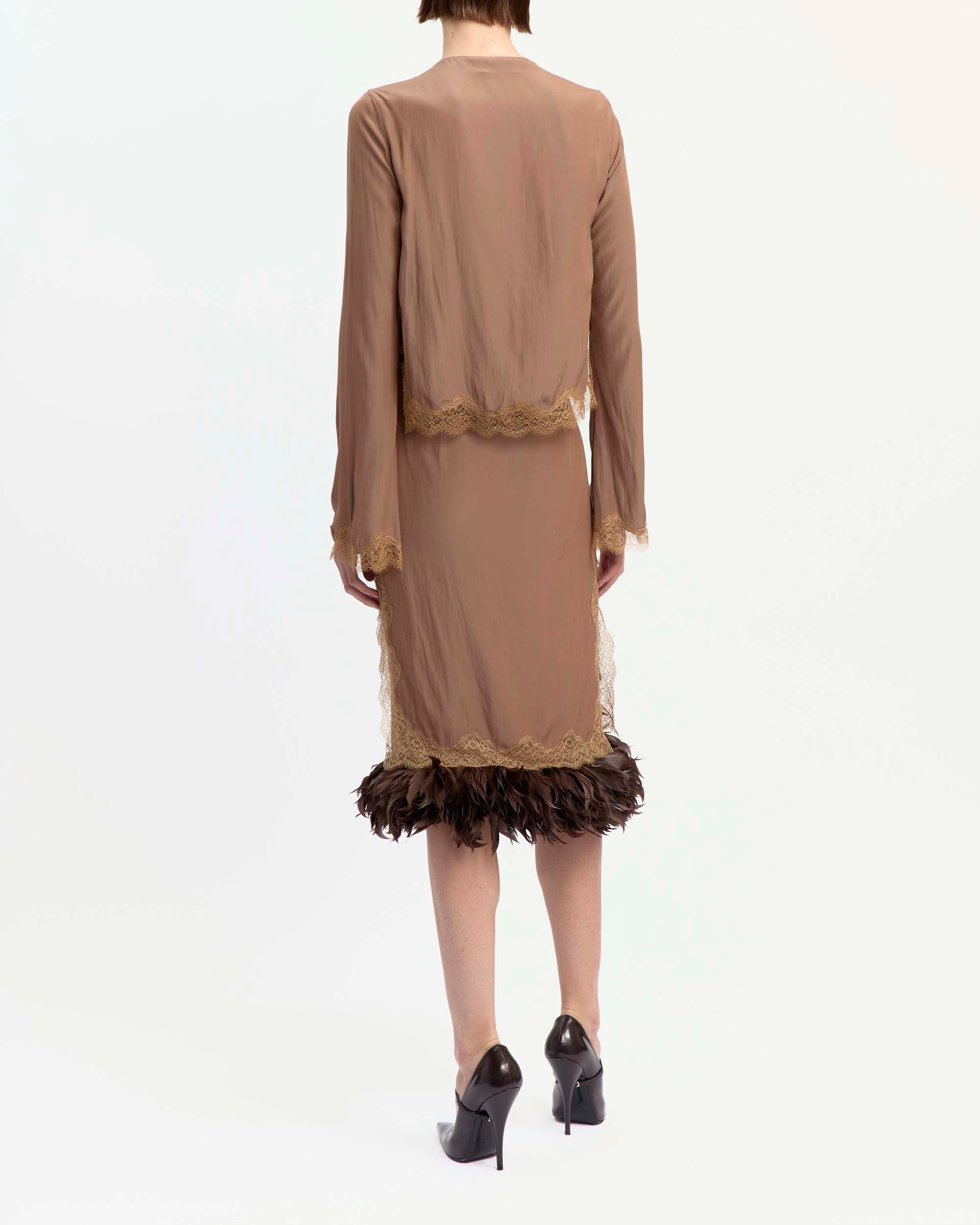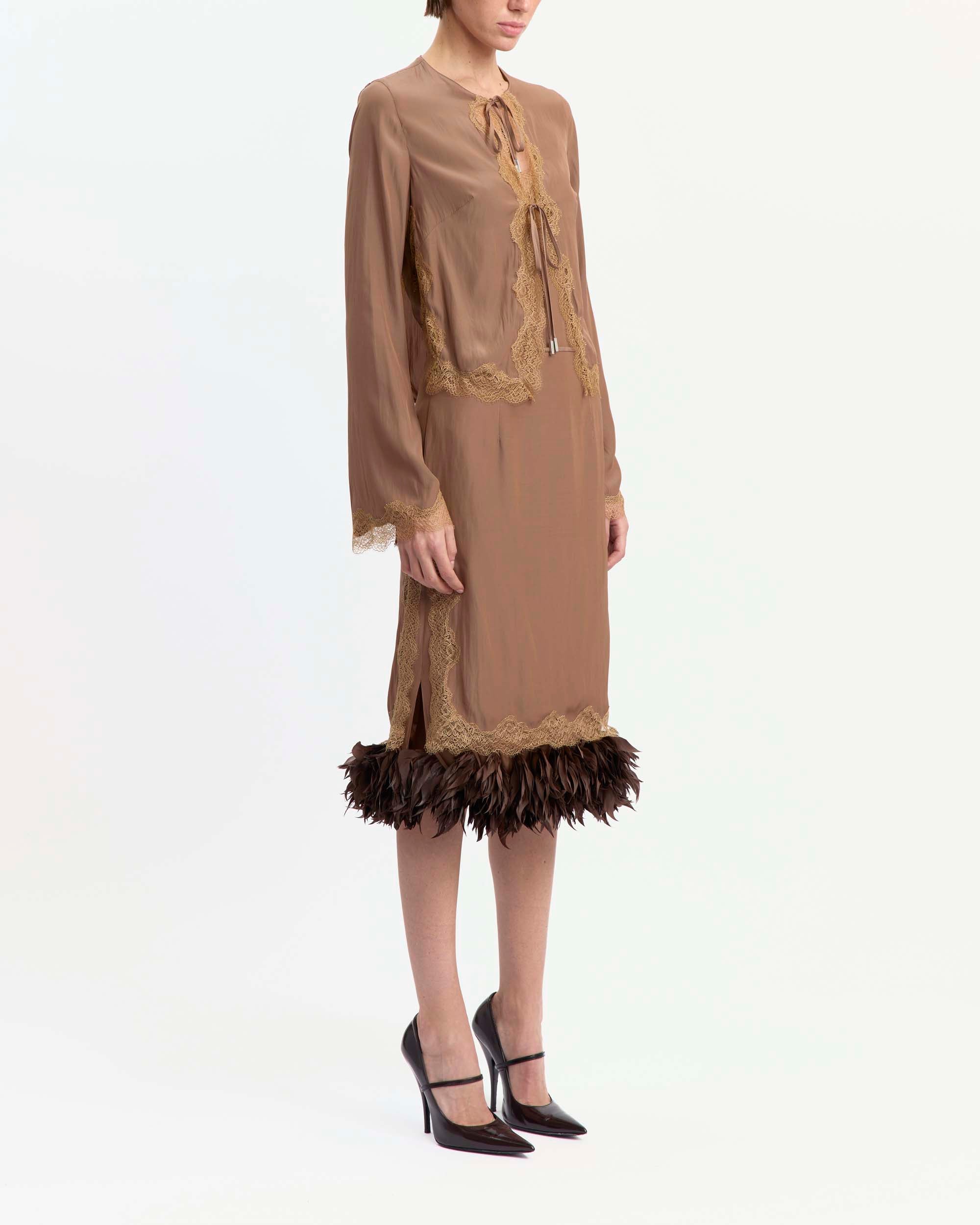 The Filipa cardigan is cut from toffee-coloured Japanese satin in a sleek silhouette, enhanced by flared sleeves and a delicate scalloped lace trim placed by hand. The relaxed fit is finished with branded metal-tipped ties for a considered detail.
