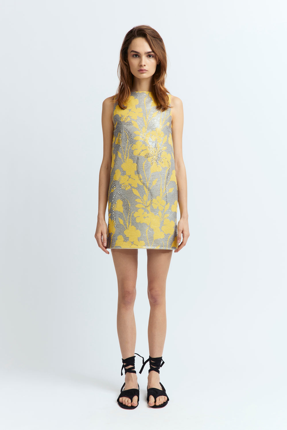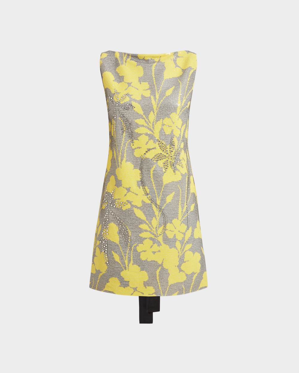 The Frasia Gown is a strapless, floor-length dress crafted from floral print sequin fabric, featuring a crystal hotfix appliqué in a custom floral design. Cut for a close fit, it includes internal boning at the bodice for structure and fastens at the back with a concealed zip.