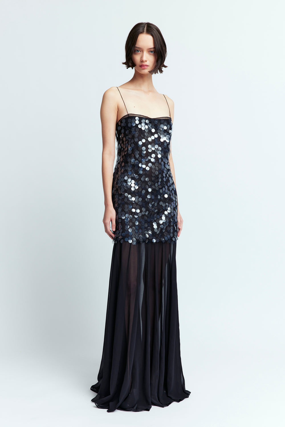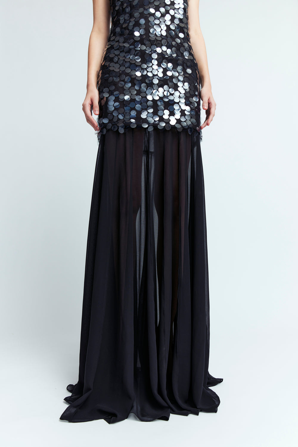 The Frasia Gown is a strapless, floor-length dress crafted from flowing georgette fabric, featuring citrine-colored crystal hotfix detailing in a custom floral pattern. Designed for a close fit, it includes internal boning at the bodice for structure and fastens at the back with a concealed zip.