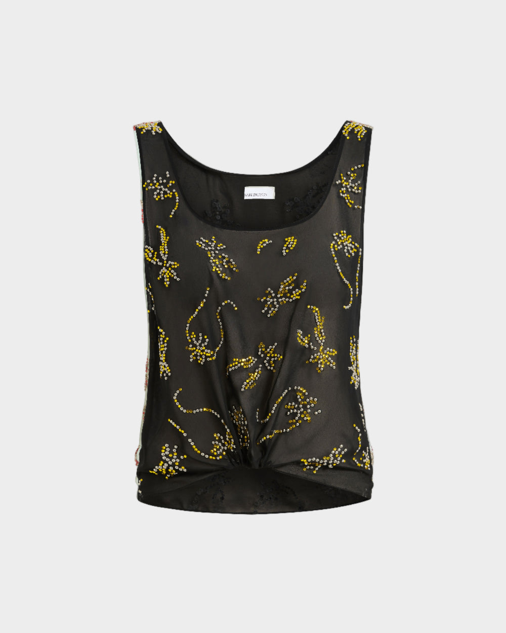 The Gilda Top is a scoop-neck, sleeveless design cut from lustrous satin in rich chocolate brown. Designed for a loose fit, it drapes effortlessly over the body and falls to the hips. The satin fabric enhances its smooth, fluid silhouette. Also available in pale blue and yellow.