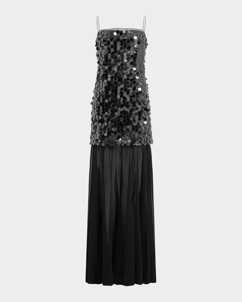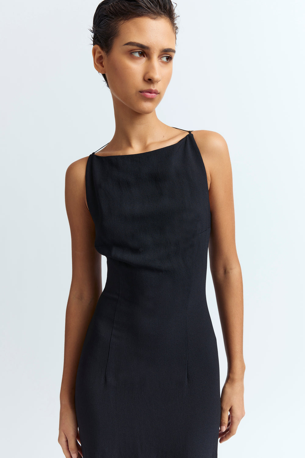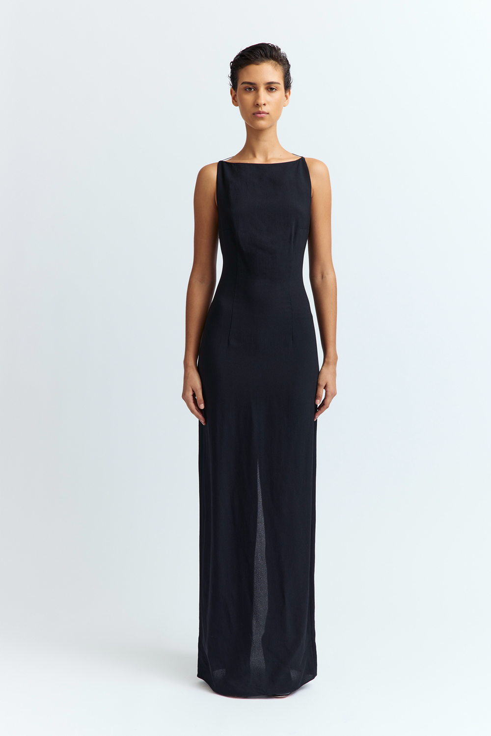 The Hebe Gown in off white is a floor-length design crafted from smooth crepe fabric, offering a figure-hugging silhouette. It features a high neckline, sleeveless shoulders, and delicate, thin straps that fasten at the open back for an adjustable fit. The straight hem is finished with a back split for ease of movement.