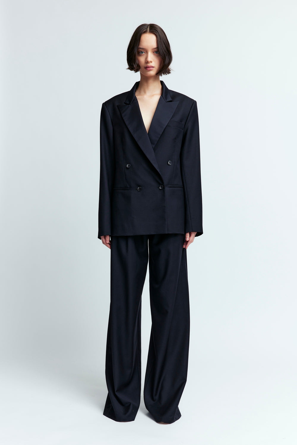 The Ivlia Trouser is a wide leg trouser that fastens with a hook and eye. It features a double waistband element to create the illusion of two trousers being worn simultaneously. They are designed to fit loosely to the body and fall below the ankles