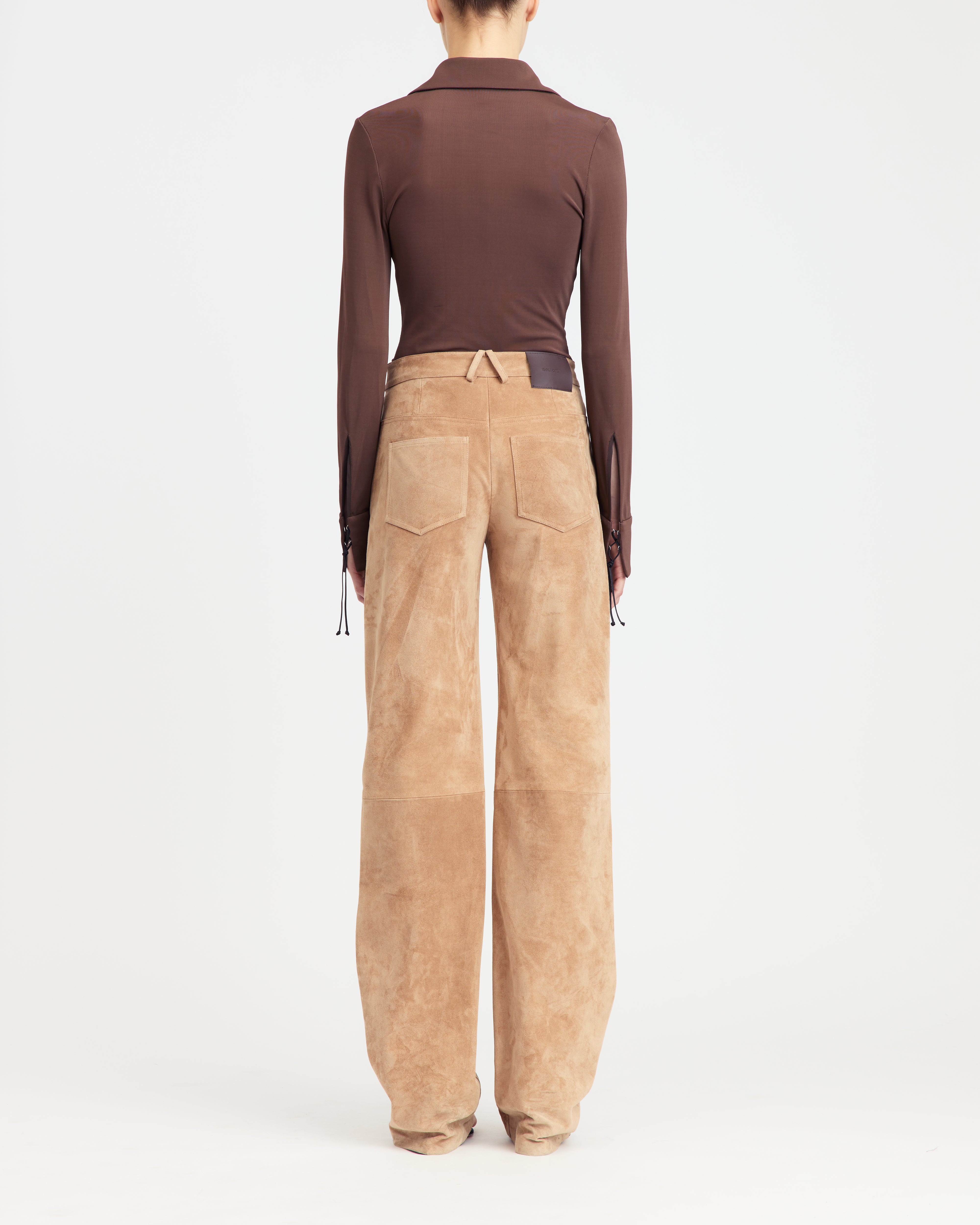 The Junia trousers are crafted from soft tan suede, sitting at the mid-waist in a straight-leg silhouette. A curved side seam and side seam pockets provide subtle shaping, while two patch pockets at the back and a contrast branded leather tab at the waistband add understated, deliberate finish.