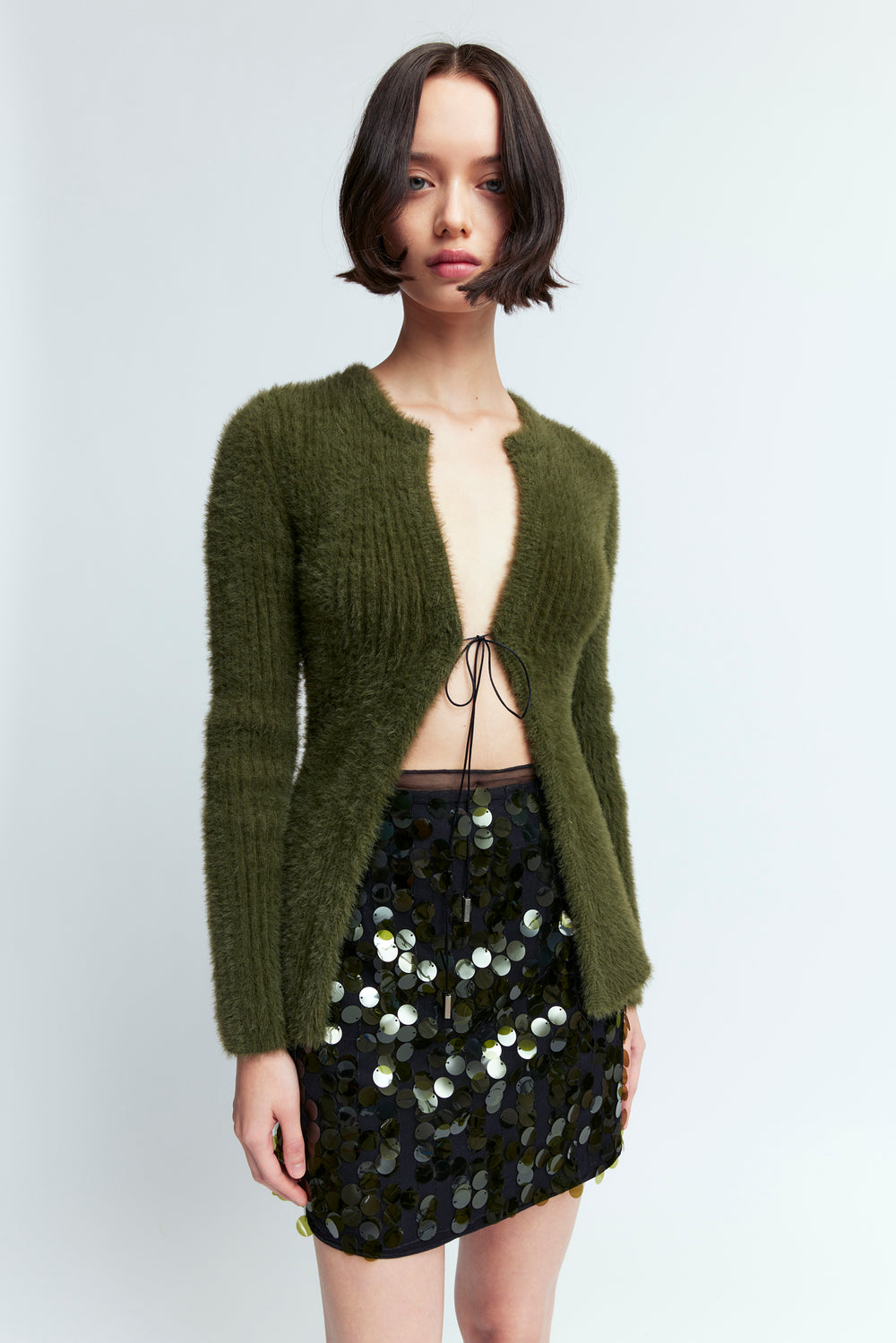 The Keid Cardigan in white is cut from lightweight linen with sequin embellishments throughout. It features a boxy, cropped fit with clean, minimal lines. Pair it with the matching Sior Dress or Minerva Mini Skirt for a coordinated look.