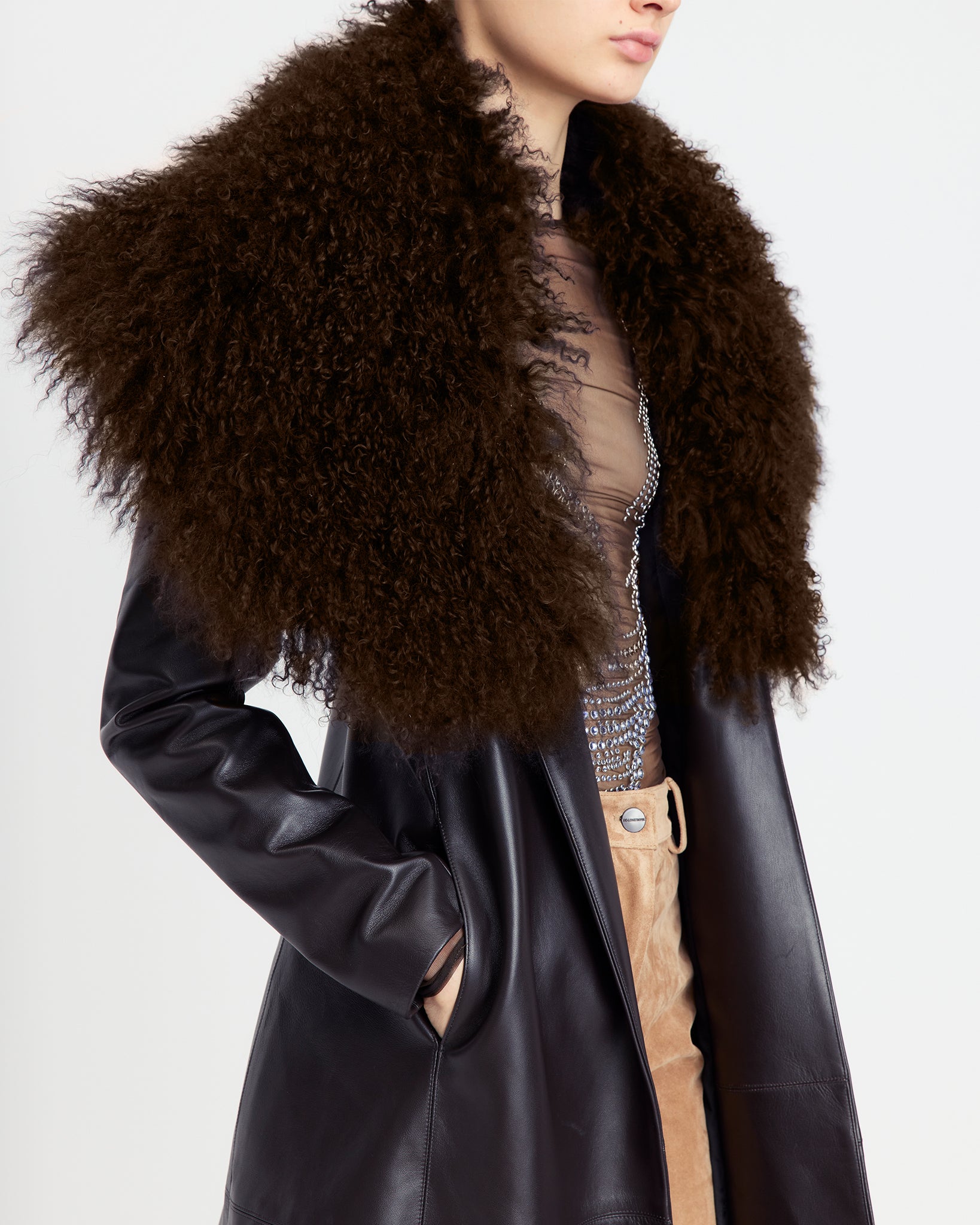 At the neckline, an exaggerated Mongolian shearling collar brings a hit of subversive drama. Soft, full, and unmistakably tactile, it can be detached for a sharper, more minimal finish. Two moods, one coat – both grounded in precise construction and a deliberate sense of ease.