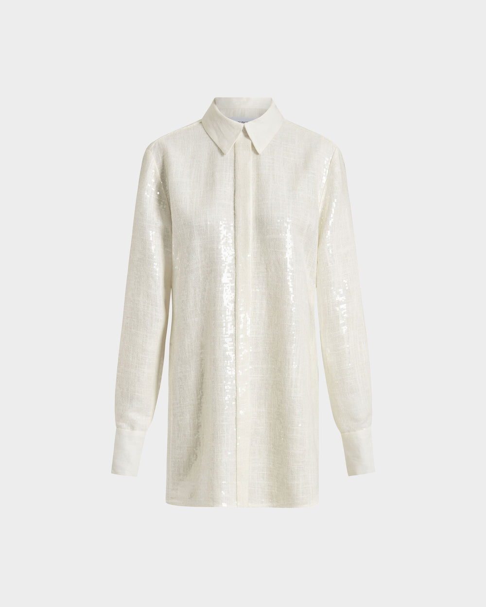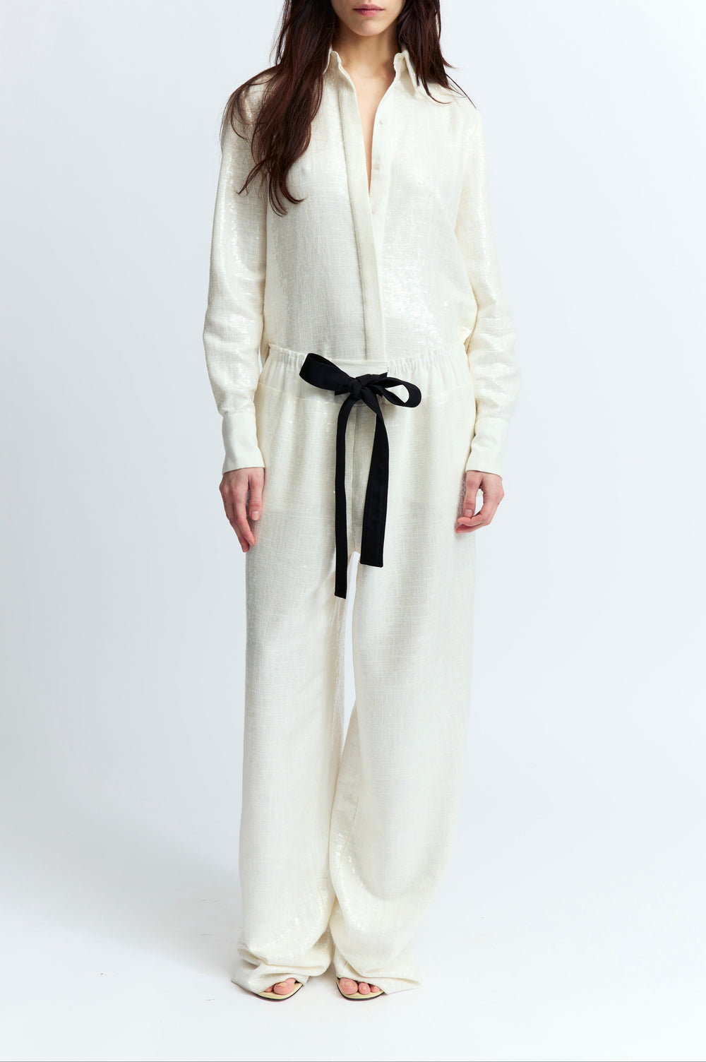The Marley Shirt in black is a relaxed pyjama-style silhouette, cut from lightweight linen with sequin embellishment throughout. It features a contrast linen collar and cuffs, a concealed button closure, and pleats at the centre back. Wear with matching Ima trousers for a complete look.